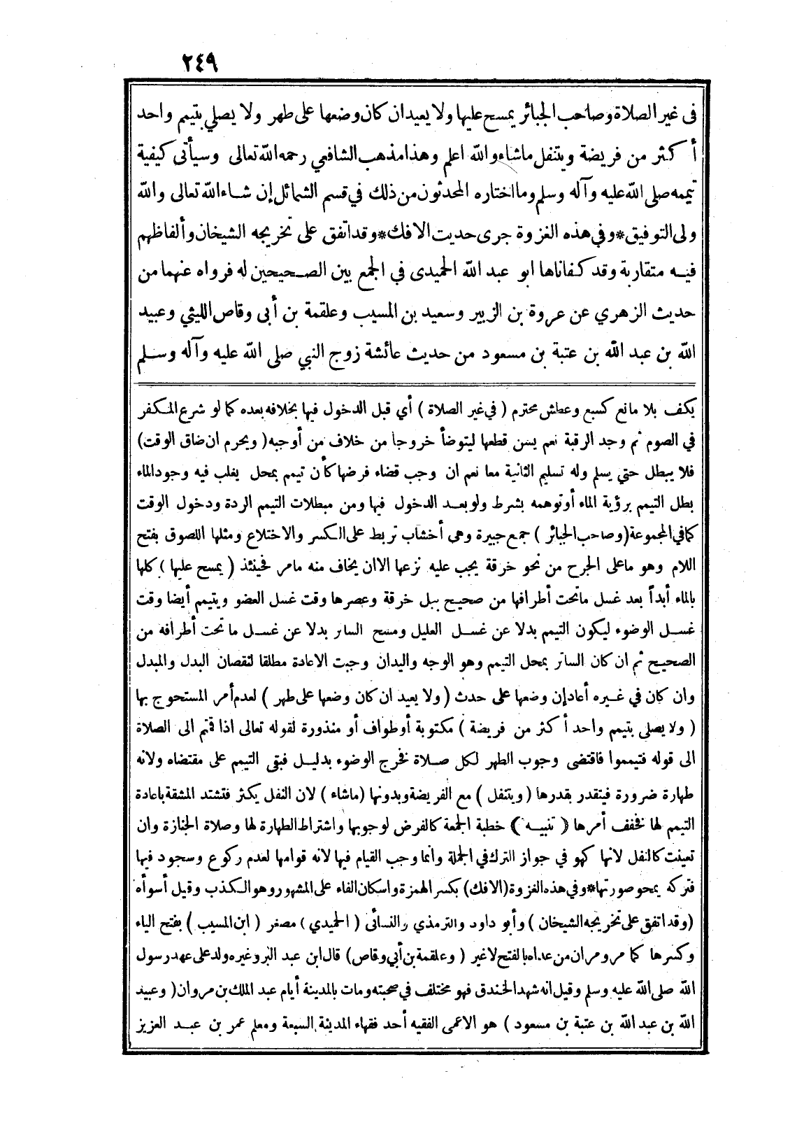 وفي هذه الغزوة جرى حديث الافك* وقد اتفق على تخريجه الشيخان وألفاظهم فيه متقاربة وقد كفاناها ابو عبد الله الحميدى في الجمع بين الصحيحين له فرواه عنهما من حديث الزهري عن عروة بن الزبير وسعيد بن المسيب وعلقمة بن أبى وقاص الليثي وعبيد الله بن عبد الله بن عتبة بن مسعود من حديث عائشة زوج النبي صلى الله عليه وآله وسلم يكف بلا مانع كسبع وعطش محترم (في غير الصلاة) أي قبل الدخول فيها بخلافه بعده كما لو شرع المكفر في الصوم ثم وجد الرقبة نعم يسن قطعها ليتوضأ خروجا من خلاف من أوجبه (ويحرم ان ضاق الوقت) فلا يبطل حتي يسلم وله تسليم الثانية معا نعم ان وجب قضاء فرضها كأن تيمم بمحل يغلب فيه وجود الماء بطل التيمم برؤية الماء أو توهمه بشرط ولو بعد الدخول فيها ومن مبطلات التيمم الردة ودخول الوقت كما في المجموعة (وصاحب الجبائر) جمع جبيرة وهى أخشاب تربط على الكسر والاختلاع ومثلها اللصوق بفتح اللام وهو ما على الجرح من نحو خرقة يجب عليه نزعها الا ان يخاف منه ما مر فحينئذ (يمسح عليها) كلها بالماء أبدا بعد غسل ما تحت أطرافها من صحيح ببل خرقة وعصرها وقت غسل العضو ويتيمم أيضا وقت غسل الوضوء ليكون التيمم بدلا عن غسل العليل ومسح الساتر بدلا عن غسل ما تحت أطرافه من الصحيح ثم ان كان الساتر بمحل التيمم وهو الوجه واليدان وجبت الاعادة مطلقا لنقصان البدل والمبدل وان كان في غيره أعاد إن وضعها على حدث (ولا يعيد ان كان وضعها على طهر) لعدم أمر المستحوج بها (ولا يصلى بتيمم واحد أكثر من فريضة) مكتوبة أو طواف أو منذورة لقوله تعالى إِذا قُمْتُمْ إِلَى الصَّلاةِ الى قوله فَتَيَمَّمُوا فاقتضى وجوب الطهر لكل صلاة فخرج الوضوء بدليل فبقى التيمم على مقتضاه ولانه طهارة ضرورة فيتقدر بقدرها (ويتنفل) مع الفريضة وبدونها (ما شاء) لان النفل يكثر فتشتد المشقة باعادة التيمم لها فخفف أمرها (تنبيه) خطبة الجمعة كالفرض لوجوبها واشتراط الطهارة لها وصلاة الجنازة وان تعينت كالنفل لانها كهو في جواز الترك في الجملة وانما وجب القيام فيها لانه قوامها لعدم ركوع وسجود فيها فتركه يمحو صورتها* وفي هذه الغزوة (الافك) بكسر الهمزة واسكان الفاء على المشهور وهو الكذب وقيل أسوأه (وقد اتفق على تخريجه الشيخان) وأبو داود والترمذي والنسائى (الحميدي) مصغر (ابن المسيب) بفتح الياء وكسرها كما مر ومران من عداه بالفتح لا غير (وعلقمة بن أبي وقاص) قال ابن عبد البر وغيره ولد على عهد رسول الله صلى الله عليه وسلم وقيل انه شهد الخندق فهو مختلف في صحبته ومات بالمدينة أيام عبد الملك بن مروان (وعبيد الله بن عبد الله بن عتبة بن مسعود) هو الاعمى الفقيه أحد فقهاء المدينة السبعة ومعلم عمر بن عبد العزيز