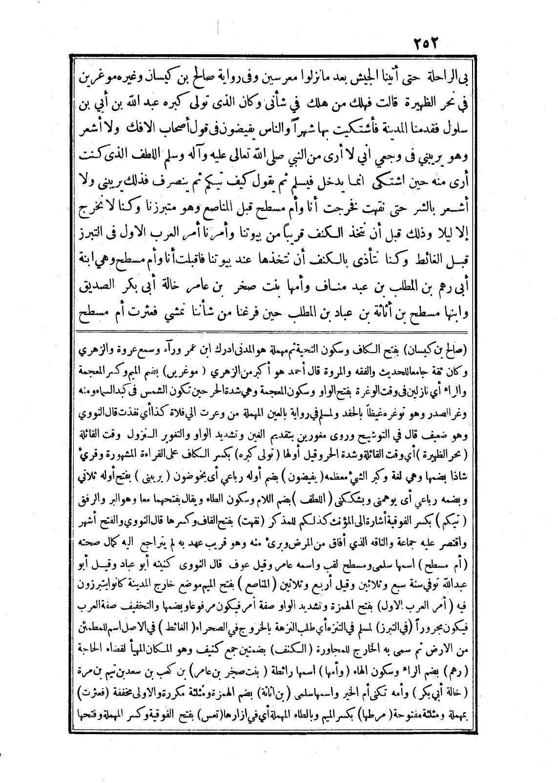 بى الراحلة حتى أتينا الجيش بعد ما نزلوا معرسين وفي رواية صالح بن كيسان وغيره موغرين في نحر الظهيرة قالت فهلك من هلك في شأنى وكان الذى تولى كبره عبد الله بن أبي بن سلول فقدمنا المدينة فأشتكيت بها شهرا والناس يفيضون في قول أصحاب الافك ولا أشعر وهو يريبني في وجعي اني لا أرى من النبي صلى الله تعالى عليه وآله وسلم اللطف الذي كنت أرى منه حين اشتكى انما يدخل فيسلم ثم يقول كيف تيكم ثم ينصرف فذلك يريبنى ولا أشعر بالشر حتى نقهت فخرجت أنا وأم مسطح قبل المناصع وهو متبرزنا وكنا لا نخرج إلا ليلا وذلك قبل أن نتخذ الكنف قريبا من بيوتنا وأمرنا أمر العرب الاول في التبرز قبل الغائط وكنا نتأذى بالكنف أن نتخذها عند بيوتنا فاقبلت أنا وأم مسطح وهي ابنة أبى رهم بن المطلب بن عبد مناف وأمها بنت صخر بن عامر خالة أبى بكر الصديق وابنها مسطح بن أثاثة بن عباد بن المطلب حين فرغنا من شأننا نمشي فعثرت أم مسطح (صالح بن كيسان) بفتح الكاف وسكون التحية ثم مهملة هو المدنى ادرك ابن عمر ورآه وسمع عروة والزهري وكان ثقة جامعا للحديث والفقه والمروة قال أحمد هو أكبر من الزهري (موغرين) بضم الميم وكسر المعجمة والراء أي نازلين في وقت الوغرة بفتح الواو وسكون المعجمة وهي شدة الحر حين تكون الشمس في كبد السماء ومنه وغر الصدر وهو توغره غيظا بالحقد ولمسلم في رواية بالعين المهملة من وعرت الي فلاة كذا أي نفذت قال النووي وهو ضعيف قال في التوشيح وروى مغورين بتقديم الغين وتشديد الواو والتغوير النزول وقت القائلة (نحر الظهيرة) أي وقت القائلة وشدة الحر وقيل أولها (تولى كبره) بكسر الكاف على القراءة المشهورة وقريء شاذا بضمها وهي لغة وكبر الشيء معظمه (يفيضون) بضم أوله رباعي أى يخوضون (يريبنى) بفتح أوله ثلاثي وبضمه رباعي أى يوهمنى ويشككنى (اللطف) بضم اللام وسكون الطاء ويقال بفتحهما معا وهو البر والرفق (تيكم) بكسر الفوقية أشارة الى المؤنث كذلكم للمذكر (نقهت) بفتح القاف وكسرها قال النووي والفتح أشهر واقتصر عليه جماعة والناقه الذي أفاق من المرض وبرئ منه وهو قريب عهد به لم يتراجع اليه كمال صحته (أم مسطح) اسمها سلمى ومسطح لقب واسمه عامر وقيل عوف قال النووى كنيته أبو عباد وقيل أبو عبد الله توفي سنة سبع وثلاثين وقيل أربع وثلاثين (المناصع) بفتح الميم موضع خارج المدينة كانوا يتبرزون فيه (أمر العرب الاول) بفتح الهمزة وتشديد الواو صفة أمر فيكون مرفوعا وبضمها والتخفيف صفة العرب فيكون مجرورا (في التبرز) لمسلم في التنزه أي طلب النزهة بالخروج في الصحراء (الغائط) في الاصل اسم للمطمئن من الارض ثم سمى به الخارج للمجاورة (الكنف) بضمتين جمع كنيف وهو المكان المهيأ لقضاء الحاجة (رهم) بضم الراء وسكون الهاء (وأمها) اسمها رائطة (بنت صخر بن عامر) بن كعب بن سعد بن تيم بن مرة (خالة أبي بكر) وأمه تكنى أم الخير واسمها سلمى (بن اثاثة) بضم الهمزة ومثلثة مكررة والاولى مخففة (فعثرت) بمهملة ومثلثة مفتوحة (مرطها) بكسر الميم وبالطاء المهملة أي في ازارها (تعس) بفتح الفوقية وكسر المهملة وفتحها