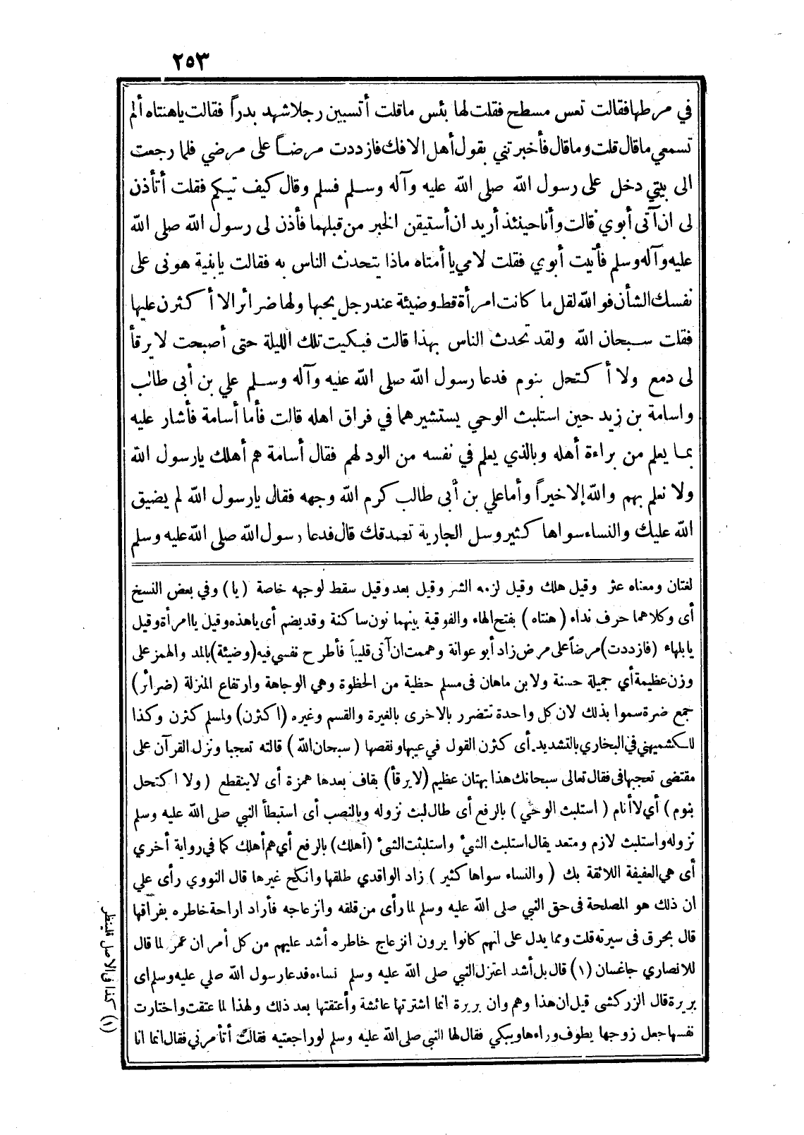 في مرطها فقالت تعس مسطح فقلت لها بئس ما قلت أتسبين رجلا شهد بدرا فقالت يا هنتاه ألم تسمعي ما قال قلت وما قال فأخبرتني بقول أهل الافك فازددت مرضا على مرضي فلما رجعت الى بيتي دخل على رسول الله صلى الله عليه وآله وسلم فسلم وقال كيف تيكم فقلت أتأذن لى ان آتى أبوي قالت وأنا حينئذ أريد ان أستيقن الخبر من قبلهما فأذن لى رسول الله صلى الله عليه وآله وسلم فأتيت أبوي فقلت لامي يا أمتاه ماذا يتحدث الناس به فقالت يا بنية هونى على نفسك الشأن فو الله لقل ما كانت امرأة قط وضيئة عند رجل يحبها ولها ضرائر الا أكثرن عليها فقلت سبحان الله ولقد تحدث الناس بهذا قالت فبكيت تلك الليلة حتى أصبحت لا يرقأ لى دمع ولا أكتحل بنوم فدعا رسول الله صلى الله عليه وآله وسلم علي بن أبى طالب واسامة بن زيد حين استلبث الوحي يستشيرهما في فراق اهله قالت فأما أسامة فأشار عليه بما يعلم من براءة أهله وبالذي يعلم في نفسه من الود لهم فقال أسامة هم أهلك يا رسول الله ولا نعلم بهم والله إلا خيرا وأما علي بن أبى طالب كرم الله وجهه فقال يا رسول الله لم يضيق الله عليك والنساء سواها كثير وسل الجارية تصدقك قال فدعا رسول الله صلى الله عليه وسلم لغتان ومعناه عثر وقيل هلك وقيل لزمه الشر وقيل سقط لوجهه خاصة (يا) وفي بعض النسخ أى وكلاهما حرف نداء (هنتاه) بفتح الهاء والفوقية بينهما نون ساكنة وقد يضم أى يا هذه وقيل يا امرأة وقيل يا بلهاء (فازددت) مرضا على مرض زاد أبو عوانة وهممت ان آتى قليبا فأطرح نفسي فيه (وضيئة) بالمد والهمز على وزن عظيمة أي جميلة حسنة ولابن ماهان في مسلم حظية من الحظوة وهي الوجاهة وارتفاع المنزلة (ضرائر) جمع ضرة سموا بذلك لان كل واحدة تتضرر بالاخرى بالغيرة والقسم وغيره (اكثرن) ولمسلم كثرن وكذا للكشميهني في البخاري بالتشديد أي كثرن القول في عيبها ونقصها (سبحان الله) قالته تعجبا ونزل القرآن على مقتضى تعجبها في فقال تعالى سُبْحانَكَ هذا بُهْتانٌ عَظِيمٌ (لا يرقأ) بقاف بعدها همزة أى لا ينقطع (ولا اكتحل بنوم) أي لا أنام (استلبث الوحي) بالرفع أى طال لبث نزوله وبالنصب أى استبطأ النبي صلى الله عليه وسلم نزوله واستلبث لازم ومتعد يقال استلبث الشيء واستلبثت الشىء (أهلك) بالرفع أي هم أهلك كما في رواية أخري أى هي العفيفة اللائقة بك (والنساء سواها كثير) زاد الواقدي طلقها وانكح غيرها قال النووي رأى علي ان ذلك هو المصلحة في حق النبي صلى الله عليه وسلم لما رأى من قلقه وانزعاجه فأراد اراحة خاطره بفراقها قال بحرق في سيرته قلت ومما يدل على انهم كانوا يرون انزعاج خاطره أشد عليهم من كل أمران عمر لما قال للانصاري جاغسان «1» قال بل أشد اعتزال النبي صلى الله عليه وسلم نساءه فدعا رسول الله صلي عليه وسلم اى بريرة قال الزركشى قيل ان هذا وهم وان بريرة انما اشترتها عائشة وأعتقتها بعد ذلك ولهذا لما عتقت واختارت نفسها جعل زوجها يطوف وراءها ويبكي فقال لها النبي صلى الله عليه وسلم لو راجعتيه فقالت أتأمرني فقال انما انا