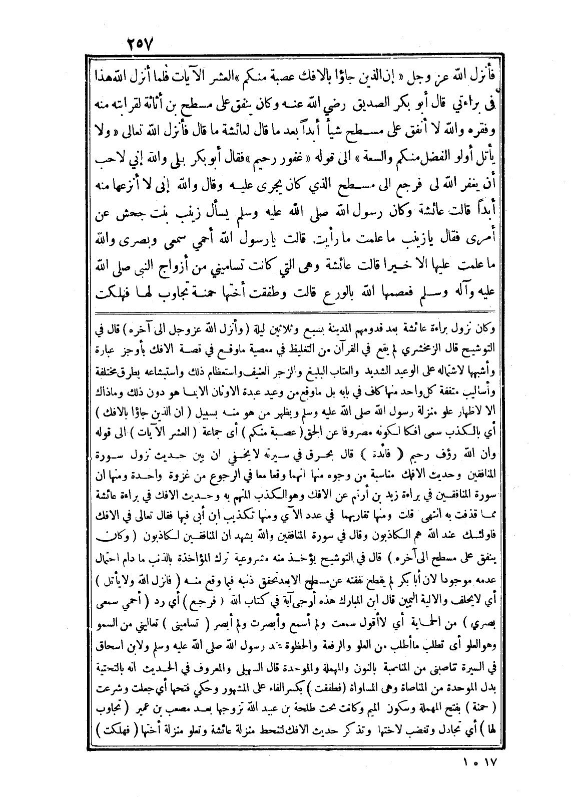 فأنزل الله عز وجل «إِنَّ الَّذِينَ جاؤُ بِالْإِفْكِ عُصْبَةٌ مِنْكُمْ» العشر الآيات فلما أنزل الله هذا فى براءتي قال أبو بكر الصديق رضي الله عنه وكان ينفق على مسطح بن أثاثة لقرابته منه وفقره والله لا أنفق على مسطح شيأ أبدا بعد ما قال لعائشة ما قال فأنزل الله تعالى «وَلا يَأْتَلِ أُولُوا الْفَضْلِ مِنْكُمْ وَالسَّعَةِ» الى قوله «غَفُورٌ رَحِيمٌ» فقال أبو بكر بلى والله إني لاحب أن يغفر الله لى فرجع الى مسطح الذي كان يجرى عليه وقال والله إنى لا أنزعها منه أبدا قالت عائشة وكان رسول الله صلى الله عليه وسلم يسأل زينب بنت جحش عن أمرى فقال يا زينب ما علمت ما رأيت قالت يا رسول الله أحمي سمعى وبصرى والله ما علمت عليها الا خيرا قالت عائشة وهى التي كانت تساميني من أزواج النبى صلى الله عليه وآله وسلم فعصمها الله بالورع قالت وطفقت أختها حمنة تجاوب لها فهلكت وكان نزول براءة عائشة بعد قدومهم المدينة بسبع وثلاثين ليلة (وأنزل الله عز وجل الى آخره) قال في التوشيح قال الزمخشري لم يقع في القرآن من التغليظ في معصية ما وقع في قصة الافك بأوجز عبارة وأشبهها لاشتماله على الوعيد الشديد والعتاب البليغ والزجر العنيف واستعظام ذلك واستبشاعه بطرق مختلفة وأساليب متفقة كل واحد منها كاف في بابه بل ما وقع من وعيد عبدة الاوثان الا بما هو دون ذلك وما ذاك الا لاظهار علو منزلة رسول الله صلى الله عليه وسلم ويظهر من هو منه بسبيل إِنَّ الَّذِينَ جاؤُ بِالْإِفْكِ أي بالكذب سمى افكا لكونه مصروفا عن الحق (عُصْبَةٌ مِنْكُمْ) أى جماعة (العشر الآيات) الى قوله وَأَنَّ اللَّهَ رَؤُفٌ رَحِيمٌ (فائدة) قال بحرق في سيرته لا يخفي ان بين حديث نزول سورة المنافقين وحديث الافك مناسبة من وجوه منها انهما وقعا معا في الرجوع من غزوة واحدة ومنها ان سورة المنافقين في براءة زيد بن أرقم عن الافك وهو الكذب المتهم به وحديث الافك في براءة عائشة مما قذفت به انتهى قلت ومنها تقاربهما في عدد الآي ومنها تكذيب ابن أبى فيها فقال تعالى في الافك فَأُولئِكَ عِنْدَ اللَّهِ هُمُ الْكاذِبُونَ وقال في سورة المنافقين وَاللَّهُ يَشْهَدُ إِنَّ الْمُنافِقِينَ لَكاذِبُونَ (وكان ينفق على مسطح الى آخره) قال في التوشيح يؤخذ منه مشروعية تلك المؤاخذة بالذنب ما دام احتمال عدمه موجودا لان أبا بكر لم يقطع نفقته عن مسطح الا بعد تحقق ذنبه فيما وقع منه (فانزل الله ولا يأتل) أي لا يحلف والالية اليمين قال ابن المبارك هذه أرجى آية في كتاب الله (فرجع) أي رد (أحمي سمعى بصري) من الحماية أي لا أقول سمعت ولم أسمع وأبصرت ولم أبصر (تسامينى) تعاليني من السمو وهو العلو أى تطلب ما أطلب من العلو والرفعة والحظوة عند رسول الله صلى الله عليه وسلم ولابن اسحاق في السيرة تناصبنى من المناصبة بالنون والمهملة والموحدة قال السهيلى والمعروف في الحديث انه بالتحتية بدل الموحدة من المناصاة وهى المساواة (فطفقت) بكسر الفاء على المشهور وحكي فتحها أي جعلت وشرعت (حمنة) بفتح المهملة وسكون الميم وكانت تحت طلحة بن عبيد الله تزوجها بعد مصعب بن عمير (تجاوب لها) أي تجادل وتغضب لاختها وتذكر حديث الافك لتنحط منزلة عائشة وتعلو منزلة أختها (فهلكت)