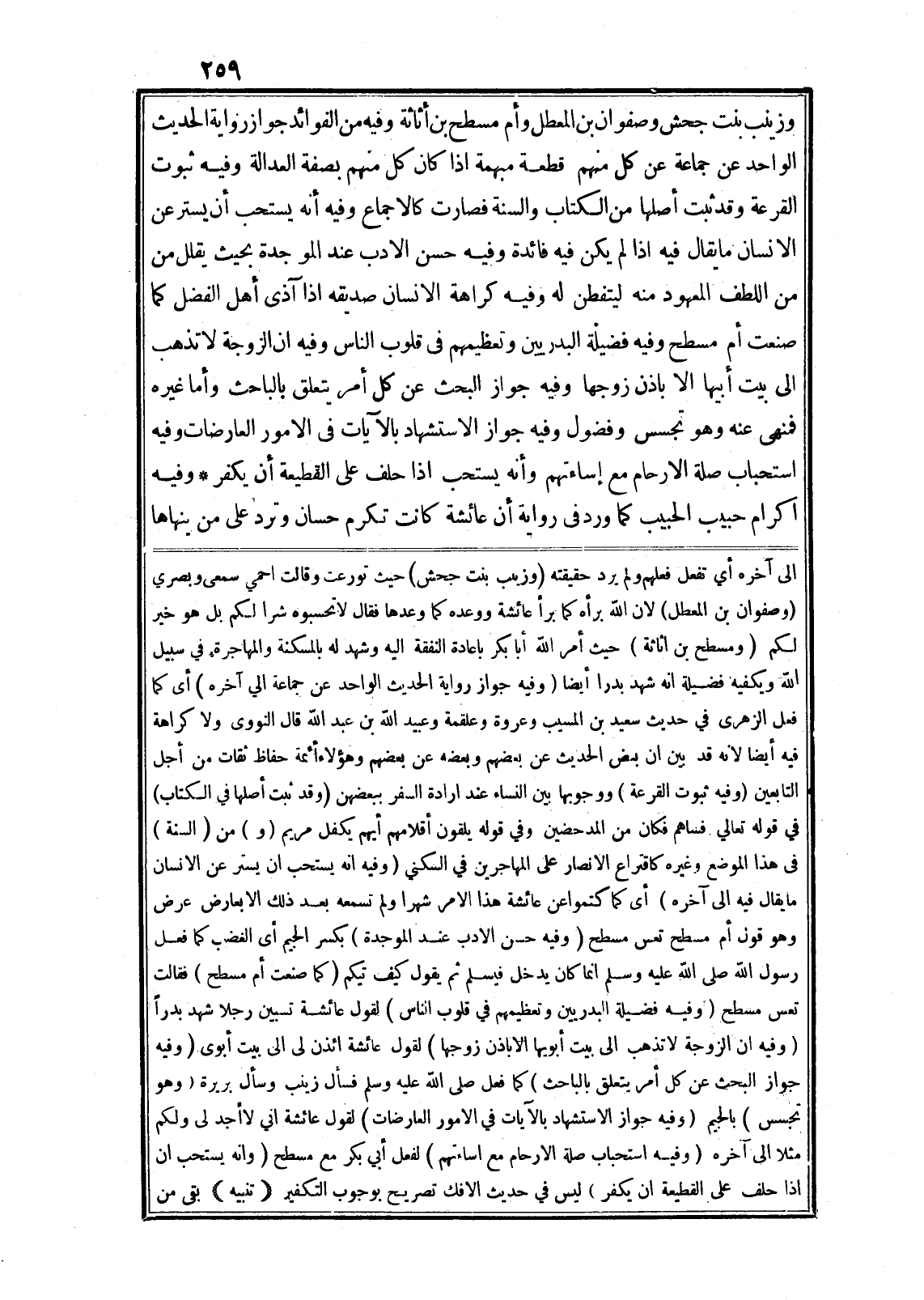 وزينب بنت جحش وصفوان بن المعطل وأم مسطح بن أثاثة وفيه من الفوائد جواز رواية الحديث الواحد عن جماعة عن كل منهم قطعة مبهمة اذا كان كل منهم بصفة العدالة وفيه ثبوت القرعة وقد ثبت أصلها من الكتاب والسنة فصارت كالاجماع وفيه أنه يستحب أن يستر عن الانسان ما يقال فيه اذا لم يكن فيه فائدة وفيه حسن الادب عند الموجدة بحيث يقلل من من اللطف المعهود منه ليتفطن له وفيه كراهة الانسان صديقه اذا آذى أهل الفضل كما صنعت أم مسطح وفيه فضيلة البدريين وتعظيمهم في قلوب الناس وفيه ان الزوجة لا تذهب الى بيت أبيها الا باذن زوجها وفيه جواز البحث عن كل أمر يتعلق بالباحث وأما غيره فمنهى عنه وهو تجسس وفضول وفيه جواز الاستشهاد بالآيات في الامور العارضات وفيه استحباب صلة الارحام مع إساءتهم وأنه يستحب اذا حلف على القطيعة أن يكفر* وفيه اكرام حبيب الحبيب كما ورد في رواية أن عائشة كانت تكرم حسان وترد على من ينهاها الى آخره أي تفعل فعلهم ولم يرد حقيقته (وزينب بنت جحش) حيث تورعت وقالت احمي سمعى وبصري (وصفوان بن المعطل) لان الله برأه كما برأ عائشة ووعده كما وعدها فقال لا تحسبوه شرا لكم بل هو خير لكم (ومسطح بن اثاثة) حيث أمر الله أبا بكر باعادة النفقة اليه وشهد له بالمسكنة والمهاجرة في سبيل الله ويكفيه فضيلة انه شهد بدرا أيضا (وفيه جواز رواية الحديث الواحد عن جماعة الي آخره) أى كما فعل الزهرى في حديث سعيد بن المسيب وعروة وعلقمة وعبيد الله بن عبد الله قال النووى ولا كراهة فيه أيضا لانه قد بين ان بعض الحديث عن بعضهم وبعضه عن بعضهم وهؤلاء أئمة حفاظ ثقات من أجل التابعين (وفيه ثبوت القرعة) ووجوبها بين النساء عند ارادة السفر ببعضهن (وقد ثبت أصلها في الكتاب) في قوله تعالى فَساهَمَ فَكانَ مِنَ الْمُدْحَضِينَ