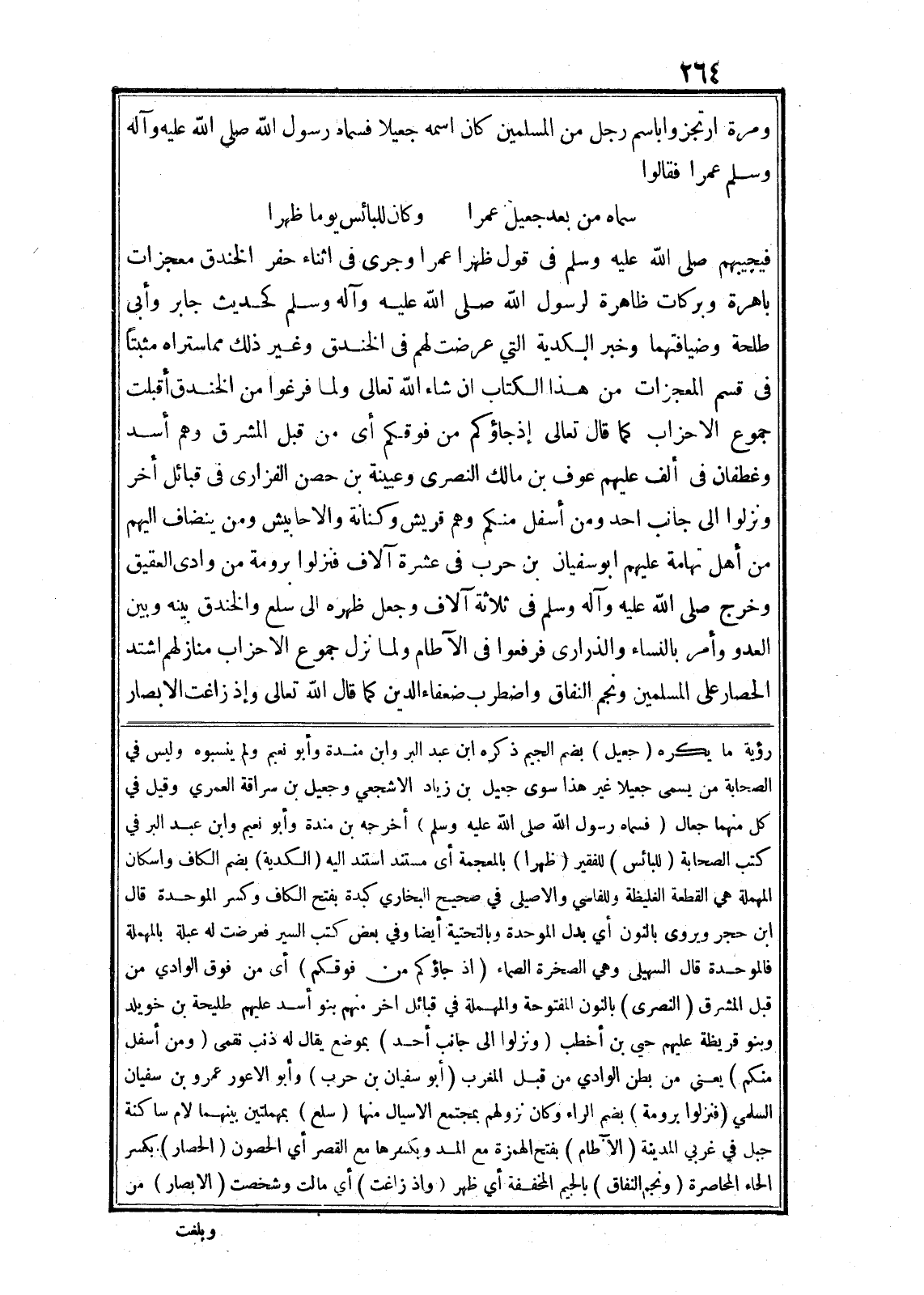 رؤية ما يكره (جعيل) بضم الجيم ذكره ابن عبد البر وابن مندة وأبو نعيم ولم ينسبوه وليس في الصحابة من يسمى جعيلا غير هذا سوى جعيل بن زياد الاشجعي وجعيل بن سراقة العمري وقيل في كل منهما جعال (فسماه رسول الله صلى الله عليه وسلم) أخرجه بن مندة وأبو نعيم وابن عبد البر في كتب الصحابة (للبائس) للفقير (ظهرا) بالمعجمة أى مستند استند اليه (الكدية) بضم الكاف واسكان المهملة هي القطعة الغليظة وللفاسي والاصيلى في صحيح البخاري كبدة بفتح الكاف وكسر الموحدة قال ابن حجر ويروى بالنون أي بدل الموحدة وبالتحتية أيضا وفي بعض كتب السير فعرضت له عبلة بالمهملة فالموحدة قال السهيلي وهي الصخرة الصماء إِذْ جاؤُكُمْ مِنْ فَوْقِكُمْ أى من فوق الوادي من قبل المشرق (النصرى) بالنون المفتوحة والمهملة في قبائل اخر منهم بنو أسد عليهم طليحة بن خويلد وبنو قريظة عليهم حيي بن أخطب (ونزلوا الى جانب أحد) بموضع يقال له ذنب نقمى (ومن أسفل منكم) يعني من بطن الوادي من قبل المغرب (أبو سفيان بن حرب) وأبو الاعور عمرو بن سفيان السلمي (فنزلوا برومة) بضم الراء وكان نزولهم بمجتمع الاسيال منها (سلع) بمهملتين بينهما لام ساكنة جبل في غربي المدينة (الآطام) بفتح الهمزة مع المد وبكسرها مع القصر أي الحصون (الحصار) بكسر الحاء المحاصرة (ونجم النفاق) بالجيم المخففة أي ظهر (وَإِذْ زاغَتِ) أي مالت وشخصت (الْأَبْصارُ) من