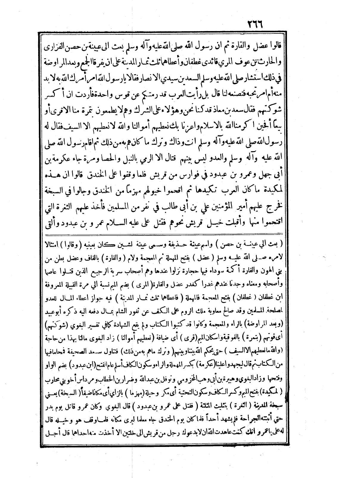 قالوا عضل والقارة ثم ان رسول الله صلى الله عليه وآله وسلم بعث الى عيينة بن حصن الفزارى والحارث بن عوف المري قائدى غطفان وأعطاهما ثلث ثمار المدينة على ان يفرقا الجمع وبعد المراوضة في ذلك استشار صلى الله عليه وسلم السعدين سيدي الانصار فقالا يا رسول الله امر أمرك الله به لا بد منه أم امر تحبه فتصنعه لنا قال بل رأيت العرب قد رمتكم عن قوس واحدة فأردت ان أكسر شوكتهم فقال سعد بن معاذ قد كنا نحن وهؤلاء على الشرك وهم لا يطمعون بتمرة منا الا قرى أو بيعا أفحين اكرمنا الله بالاسلام واعزنا بك نعطيهم أموالنا والله لا نعطيهم الا السيف فقال له رسول الله صلى الله عليه وآله وسلم انت وذاك وترك ما كان هم به من ذلك ثم اقام رسول الله صلى الله عليه وآله وسلم والعدو ليس بينهم قتال الا الرمي بالنبل والحصا ومرة جاء عكرمة بن أبى جهل وعمرو بن عبدود في فوارس من قريش فلما وقفوا على الخندق قالوا ان هذه لمكيدة ما كان العرب تكيدها ثم اقحموا خيولهم مهزما من الخندق وجالوا في السبخة فخرج عليهم أمير المؤمنين علي بن أبى طالب في نفر من المسلمين فأخذ عليهم الثغرة التي اقتحموا منها وأقبلت خيل قريش نحوهم فقتل على عليه السلام عمرو بن عبدود وألقى (بعث الي عيينة بن حصن) واسم عيينة حذيفة وسمى عيينة لشين كان بعينيه (وقالوا) امتثالا لامره صلى الله عليه وسلم (عضل) بفتح المهملة ثم المعجمة ولام (والقارة) بالقاف وعضل بطن من بني الهون والقارة أكمة سوداء فيها حجارة نزلوا عندها وهم أصحاب سرية الرجيع الذين قتلوا عاصما وأصحابه ومعناه وجدنا عندهم غدرا كغدر عضل والقارة (المرى) بضم الميم نسبة الي مرة القبيلة المعروفة ابن غطفان (غطفان) بفتح المعجمة فالمهملة (فاعطاهما ثلث ثمار المدينة) فيه جواز اعطاء المال للعدو لمصلحة المسلمين وقد صالح معاوية ملك الروم على الكف عن ثغور الشام بمال دفعه اليه ذكره أبو عبيد (وبعد المراوضة) بالراء والمعجمة وكانوا قد كتبوا الكتاب ولم يقع الشهادة كما في تفسير البغوي (شوكتهم) أى قوتهم (بتمرة) بالفوقية واسكان الميم (قرى) أى ضيافة (نعطيهم أموالنا) زاد البغوى مالنا بهذا من حاجة (والله ما نعطيهم الا السيف) حتى يحكم الله بيننا وبينهم (وترك ما هم به من ذلك) فتناول سعد الصحيفة فمحا ما فيها من الكتاب ثم قال ليجهدوا علينا (عكرمة) بكسر المهملة والراء وسكون الكاف أسلم عام الفتح (ابن عبدود) بضم الواو وفتحها وزاد البغوي وهبيرة بن أبى وهب المخزومي ونوفل بن عبد الله وضرار بن الخطاب ومرداس أخو بني محارب (لمكيدة) بفتح الميم وكسر الكاف وسكون التحتية أى مكر وحيلة (مهزما) بالزاي أى مكانا ضيقا (السبخة) يعني سبخة المدينة (الثغرة) بتثليث المثلثة (فقتل على عمرو بن عبدود) قال البغوي وكان عمرو قاتل يوم بدر حتي أثبتته الجراحة فلم يشهد أحدا فلما كان يوم الخندق جاء معلما ليرى مكانه فلما وقف هو وخيله قال له على يا عمرو انك كنت عاهدت الله ان لا يدعوك رجل من قريش الى خلتين الا أخذت منه احداهما قال أجل