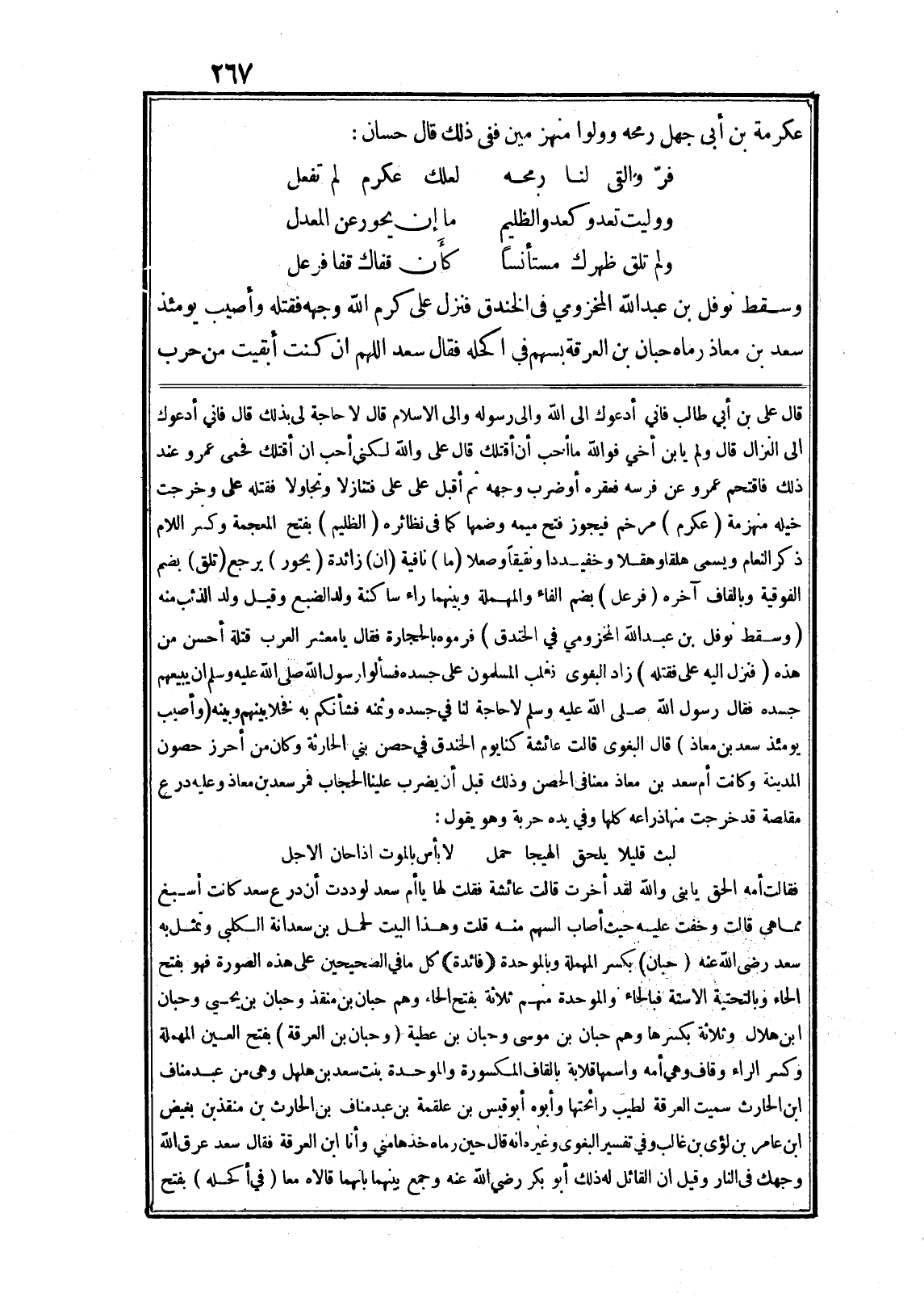 وسقط نوفل بن عبد الله المخزومي في الخندق فنزل على كرم الله وجهه فقتله وأصيب يومئذ سعد بن معاذ رماه حبان بن العرقة بسهم في اكحله فقال سعد اللهم ان كنت أبقيت من حرب قال على بن أبي طالب فاني أدعوك الى الله والى رسوله والى الاسلام قال لا حاجة لى بذلك قال فاني أدعوك الى النزال قال ولم يابن أخي فو الله ما أحب أن أقتلك قال على والله لكني أحب ان أقتلك فحمى عمرو عند ذلك فاقتحم عمرو عن فرسه فعقره أو ضرب وجهه ثم أقبل على على فتنازلا وتجاولا فقتله على وخرجت خيله منهزمة (عكرم) مرخم فيجوز فتح ميمه وضمها كما في نظائره (الظليم) بفتح المعجمة وكسر اللام ذكر النعام ويسمى هلقا وهقلا وخفيددا ونقيقا وصعلا (ما) نافية (ان) زائدة (يحور) يرجع (تلق) بضم الفوقية وبالقاف آخره (فرعل) بضم الفاء والمهملة وبينهما راء ساكنة ولد الضبع وقيل ولد الذئب منه (وسقط نوفل بن عبد الله المخزومي في الخندق) فرموه بالحجارة فقال يا معشر العرب قتلة أحسن من هذه (فنزل اليه على فقتله) زاد البغوى فغلب المسلمون على جسده فسألوا رسول الله صلى الله عليه وسلم ان يبيعهم جسده فقال رسول الله صلى الله عليه وسلم لا حاجة لنا في جسده وثمنه فشأنكم به فخلا بينهم وبينه (وأصيب يومئذ سعد بن معاذ) قال البغوى قالت عائشة كنا يوم الخندق في حصن بني الحارثة وكان من أحرز حصون المدينة وكانت أم سعد بن معاذ معنا في الحصن وذلك قبل أن يضرب علينا الحجاب فمر سعد بن معاذ وعليه درع مقلصة قد خرجت منها ذراعه كلها وفي يده حربة وهو يقول: