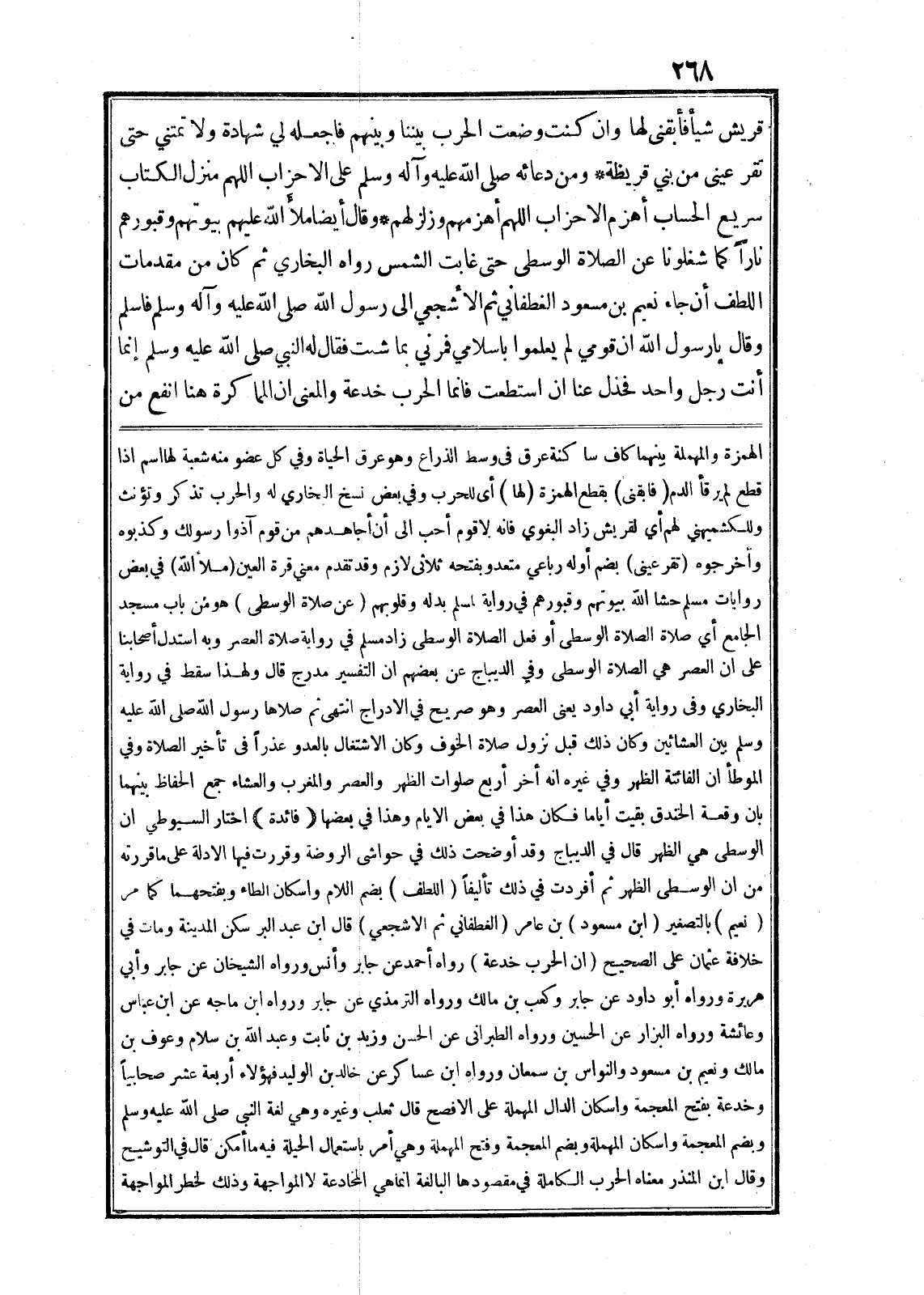 قريش شيأ فأبقنى لها وان كنت وضعت الحرب بيننا وبينهم فاجعله لي شهادة ولا تمتني حتى تقر عيني من بني قريظة* ومن دعائه صلى الله عليه وآله وسلم على الاحزاب اللهم منزل الكتاب سريع الحساب أهزم الاحزاب اللهم أهزمهم وزلزلهم* وقال أيضا ملأ الله عليهم بيوتهم وقبورهم نارا كما شغلونا عن الصلاة الوسطى حتى غابت الشمس رواه البخاري ثم كان من مقدمات اللطف أن جاء نعيم بن مسعود الغطفاني ثم الأشجعي الى رسول الله صلى الله عليه وآله وسلم فاسلم وقال يا رسول الله ان قومي لم يعلموا باسلامي فمرني بما شئت فقال له النبي صلى الله عليه وسلم إنما أنت رجل واحد فخذل عنا ان استطعت فانما الحرب خدعة والمعنى ان المماكرة هنا انفع من الهمزة والمهملة بينهما كاف ساكنة عرق في وسط الذراع وهو عرق الحياة وفي كل عضو منه شعبة لها اسم اذا قطع لم يرقأ الدم (فابقنى) بقطع الهمزة (لها) أى للحرب وفي بعض نسخ البخاري له والحرب تذكر وتؤنث وللكشميهني لهم أي لقريش زاد البغوي فانه لا قوم أحب الى أن أجاهدهم من قوم آذوا رسولك وكذبوه وأخرجوه (تقر عينى) بضم أوله رباعي متعد وبفتحه ثلاثى لازم وقد تقدم معنى قرة العين (ملأ الله) في بعض روايات مسلم حشا الله بيوتهم وقبورهم في رواية لمسلم بدله وقلوبهم (عن صلاة الوسطى) هو من باب مسجد الجامع أي صلاة الصلاة الوسطى أو فعل الصلاة الوسطى زاد مسلم في رواية صلاة العصر وبه استدل أصحابنا على ان العصر هي الصلاة الوسطى أو فعل الصلاة الوسطى زاد مسلم في رواية صلاة العصر وبه استدل أصحابنا على ان العصر هي الصلاة الوسطى وفي الديباج عن بعضهم ان التفسير مدرج قال ولهذا سقط في رواية البخاري وفي رواية أبي داود يعنى العصر وهو صريح في الادراج انتهى ثم صلاها رسول الله صلى الله عليه وسلم بين العشائين وكان ذلك قبل نزول صلاة الخوف وكان الاشتغال بالعدو عذرا في تأخير الصلاة وفي الموطأ ان الفائتة الظهر وفي غيره انه أخر أربع صلوات الظهر والعصر والمغرب والعشاء جمع الحفاظ بينهما بان وقعة الخندق بقيت أياما فكان هذا في بعض الايام وهذا في بعضها (فائدة) اختار السيوطي ان الوسطى هي الظهر قال في الديباج وقد أوضحت ذلك في حواشى الروضة وقررت فيها الادلة على ما قررته من ان الوسطى الظهر ثم أفردت في ذلك تأليفا (اللطف) بضم اللام واسكان الطاء وبفتحهما كما مر (نعيم) بالتصغير (ابن مسعود) بن عامر (الغطفاني ثم الاشجعي) قال ابن عبد البر سكن المدينة ومات في خلافة عثمان على الصحيح (ان الحرب خدعة) رواه أحمد عن جابر وأنس ورواه الشيخان عن جابر وأبي هريرة ورواه أبو داود عن جابر وكعب بن مالك ورواه الترمذي عن جابر ورواه ابن ماجه عن ابن عباس وعائشة ورواه البزار عن الحسين ورواه الطبرانى عن الحسن وزيد بن ثابت وعبد الله بن سلام وعوف بن مالك ونعيم بن مسعود والنواس بن سمعان ورواه ابن عساكر عن خالد بن الوليد فهؤلاء أربعة عشر صحابيا وخدعة بفتح المعجمة واسكان الدال المهملة على الافصح قال ثعلب وغيره وهي لغة النبى صلى الله عليه وسلم وبضم المعجمة واسكان المهملة وبضم المعجمة وفتح المهملة وهي أمر باستعمال الحيلة فيه ما أمكن قال في التوشيح وقال ابن المنذر معناه الحرب الكاملة في مقصودها البالغة انما هي المخادعة لا المواجهة وذلك لخطر المواجهة