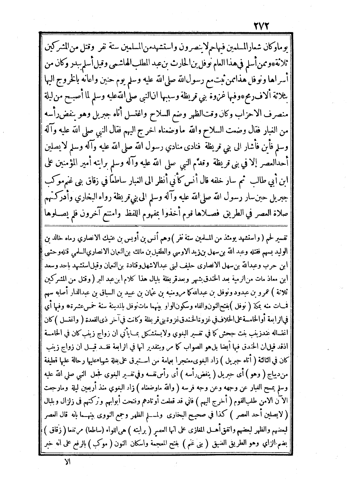 وفيها غزوة بني قريظة وسببها ان النبى صلى الله عليه وسلم لما أصبح من ليلة منصرف الاحزاب وكان وقت الظهر وضع السلاح واغتسل أتاه جبريل وهو ينفض رأسه من الغبار فقال وضعت السلاح والله ما وضعناه اخرج اليهم فقال النبي صلى الله عليه وآله وسلم فأين فأشار الى بني قريظة فنادى منادي رسول الله صلى الله عليه وآله وسلم لا يصلين أحد العصر إلا في بنى قريظة وقدّم النبي صلى الله عليه وآله وسلم برايته أمير المؤمنين على ابن أبي طالب ثم سار خلفه قال أنس كأني أنظر الى الغبار ساطعا في زقاق بنى غنم موكب جبريل حين سار رسول الله صلى الله عليه وآله وسلم الى بني قريظة رواه البخاري وأدركتهم صلاة العصر في الطريق فصلاها قوم أخذوا بمفهوم اللفظ وامتنع آخرون فلم يصلوها تفسير لحم (واستشهد يومئذ من المسلمين ستة نفر) وهم أنس بن أويس بن عتيك الانصاري رماه خالد بن الوليد بسهم فقتله وعبد الله بن سهل بن زيد الاوسي والطفيل بن مالك بن النعمان الانصاري السلمي قتله وحشى ابن حرب وعبد الله بن سهل الانصارى حليف لبنى عبد الاشهل وقتادة بن النعمان وقيل استشهد باحد وسعد ابن معاذ مات من الرمية بعد الخندق بشهر وبعد قريظة بليال هذا كلام ابن عبد البر (وقتل من المشركين ثلاثة) عمرو بن عبدود ونوفل بن عبد الله كما مر ومنبه بن عثمان بن عبيد بن السباق بن عبد الدار أصابه سهم فمات منه بمكة (نوفل) بفتح النون والفاء وسكون الواو بينهما مات نوفل بالمدينة سنة خمس عشرة* وفيها أي في الرابعة أو الخامسة على الخلاف في غزوة الخندق غزوة بنى قريظة وكانت في آخر ذى القعدة (واغتسل) كان اغتساله عند زينب بنت جحش كما في تفسير البغوي ولا يستشكل بما يأتي ان زواج زينب كان في الخامسة اذ قد قيل ان الخندق فيها أيضا بل هو الصواب كما مر وبتقدير انها في الرابعة فقد قيل ان زواج زينب كان في الثالثة (أتاه جبريل) زاد البغوى معتجرا بعمامة من استبرق على بغلة شهباء عليها رحالة عليها قطيفة من ديباج (وهو) أى جبريل (ينفض رأسه) أى رأس نفسه وفي تفسير البغوى فجعل النبي صلى الله عليه وسلم يمسح الغبار عن وجهه وعن وجه فرسه (والله ما وضعناه) زاد البغوي منذ أربعين ليلة وما رجعت الآن الا من طلب القوم (أخرج اليهم) فاني قد قطعت أوتادهم وفتحت أبوابهم وتركتهم في زلزال وبلبال (لا يصلين أحد العصر) كذا في صحيح البخارى ولمسلم الظهر وجمع النووى بينهما بانه قال العصر لبعضهم والظهر لبعضهم واتفق أهل المغازى على انها العصر (برايته) هى اللواء (ساطعا) مرتفعا (زقاق) بضم الزاي وهو الطريق الضيق (بنى غنم) بفتح المعجمة واسكان النون (موكب) بالرفع على انه خبر