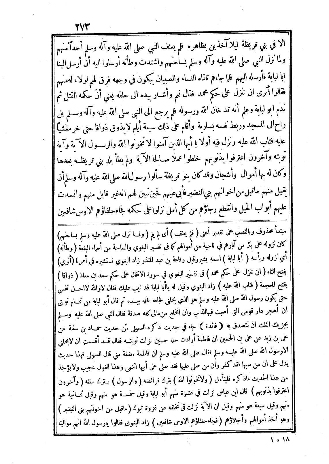 الا في بني قريظة ليلا آخذين بظاهره فلم يعنف النبي صلى الله عليه وآله وسلم أحدا منهم ولما نزل النبي صلى الله عليه وآله وسلم بساحتهم واشتدت وطأته أرسلوا اليه أن أرسل الينا ابا لبابة فأرسله اليهم فلما جاءهم تلقاه النساء والصبيان يبكون في وجهه فرق لهم لولاء له منهم فقالوا أترى ان ننزل على حكم محمد فقال نعم وأشار بيده الى حلقه يعني أنّ حكمه القتل ثم ندم ابو لبابة وعلم أنه قد خان الله ورسوله فلم يرجع الى النبى صلى الله عليه وآله وسلم بل راح الى المسجد وربط نفسه بسارية وأقام على ذلك سبعة أيام لا يذوق ذواقا حتى خرمغشيا عليه فتاب الله عليه ونزل فيه أولا يا أيها الذين آمنوا لا تخونوا الله والرسول الآية وآية توبته وآخرون اعترفوا بذنوبهم خلطوا عملا صالحا الآية ولم يطأ بلد بني قريظة بعدها وكان له بها أموال وأشجان وقد كان بنو قريظة سألوا رسول الله صلى الله عليه وآله وسلم أن يقبل منهم ما قبل من اخوانهم بني النضير فأبى عليهم فحين تبين لهم انه غير قابل منهم وانسدت عليهم أبواب الحيل وانقطع رجاؤهم من كل أمل نزلوا على حكمه فجاء حلفاؤهم الاوس شافعين مبتدأ محذوف وبالنصب على تقدير أعني (فلم يعنف) أى لم يلم (ولما نزل صلى الله عليه وسلم بساحتهم) كان نزوله على بئر من آبارهم في ناحية من أموالهم كما في تفسير البغوي والساحة من أسماء البقعة (وطأته) أي نزوله وبأسه (أبا لبابة) اسمه بشير وقيل رفاعة بن عبد المنذر زاد البغوي نستشيره في أمرنا (أتري) بفتح التاء (ان ننزل على حكم محمد) فى تفسير البغوي في سورة الانفال على حكم سعد بن معاذ (ذواقا) بفتح المعجمة (فتاب الله عليه) زاد البغوي وقيل له يا أبا لبابة قد تيب عليك فقال لا والله لا احل نفسي حتى يكون رسول الله صلى الله عليه وسلم هو الذي يحلني فجاءه فحله بيده ثم قال أبو لبابة من تمام توبتى ان أهجر دار قومى التى أصبت فيها الذنب وان انخلع من مالى كله صدقة فقال النبى صلى الله عليه وسلم يجزيك الثلث ان تتصدق به (فائدة) جاء في حديث ذكره السهيلى من حديث حماد بن سلمة عن على بن زيد عن على بن الحسين ان فاطمة أرادت حله حين نزلت توبته فقال قد أقسمت ان لا يحلني الا رسول الله صلى الله عليه وسلم فقال صلى الله عليه وسلم ان فاطمة مضغة مني قال السهيلي فهذا حديث يدل على ان من سبها فقد كفر وان من صلى عليها فقد صلى على أبيها انتهى وهذا القول عجيب ولا يؤخذ من هذا الحديث ما ذكره فليتأمل (ولا تخونوا الله) بترك فرائضه (والرسول) بترك سننه (وآخرون اعترفوا بذنوبهم) قال ابن عباس نزلت في عشرة منهم أبو لبابة وقيل خمسة هو منهم وقيل ثمانية هو منهم وقيل سبعة هو منهم وقيل ان الآية نزلت في تخلفه عن غزوة تبوك (ما قبل من اخوانهم بني النضير) وهو أخذ أموالهم وأجلاؤهم (فجاء حلفاؤهم الاوس شافعين) زاد البغوى فقالوا يا رسول الله انهم موالينا
