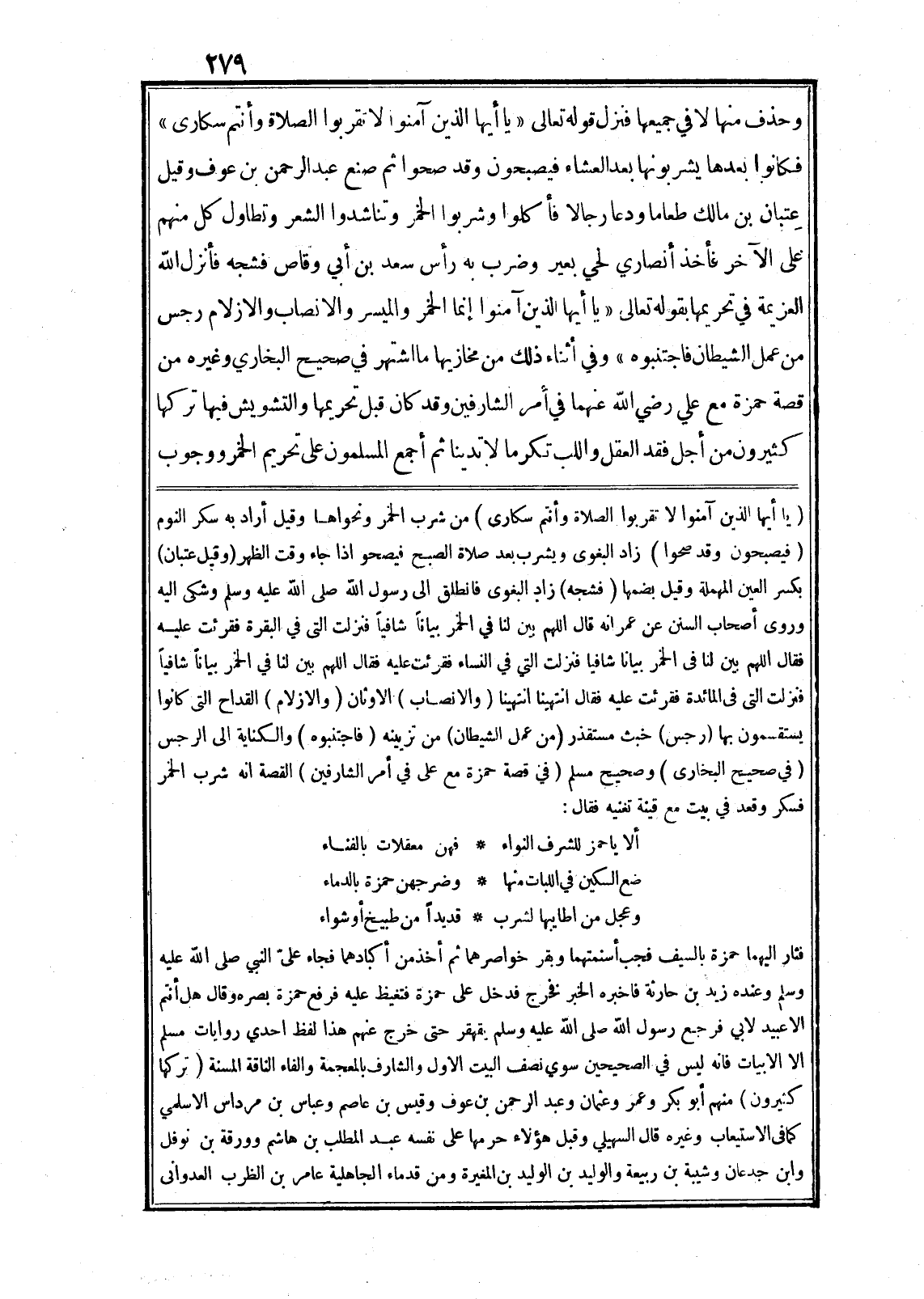 وحذف منها لا في جميعها فنزل قوله تعالى «يا أَيُّهَا الَّذِينَ آمَنُوا لا تَقْرَبُوا الصَّلاةَ وَأَنْتُمْ سُكارى» فكانوا بعدها يشربونها بعد العشاء فيصبحون وقد صحوا ثم صنع عبد الرحمن بن عوف وقيل عتبان بن مالك طعاما ودعا رجالا فأكلوا وشربوا الخمر وتناشدوا الشعر وتطاول كل منهم على الآخر فأخذ أنصاري لحي بعير وضرب به رأس سعد بن أبي وقاص فشجه فأنزل الله العزيمة في تحريمها بقوله تعالى «يا أَيُّهَا الَّذِينَ آمَنُوا إِنَّمَا الْخَمْرُ وَالْمَيْسِرُ وَالْأَنْصابُ وَالْأَزْلامُ رِجْسٌ مِنْ عَمَلِ الشَّيْطانِ فَاجْتَنِبُوهُ» وفي أثناء ذلك من مخازيها ما اشتهر في صحيح البخاري وغيره من قصة حمزة مع علي رضي الله عنهما في أمر الشارفين وقد كان قبل تحريمها والتشويش فيها تركها كثيرون من أجل فقد العقل واللب تكرما لا تدينا ثم أجمع المسلمون على تحريم الخمر ووجوب (يا أَيُّهَا الَّذِينَ آمَنُوا لا تَقْرَبُوا الصَّلاةَ وَأَنْتُمْ سُكارى) من شرب الخمر ونحواها وقيل أراد به سكر النوم (فيصبحون وقد صحوا) زاد البغوى ويشرب بعد صلاة الصبح فيصحو اذا جاء وقت الظهر (وقيل عتبان) بكسر العين المهملة وقيل بضمها (فشجه) زاد البغوى فانطلق الى رسول الله صلى الله عليه وسلم وشكى اليه وروى أصحاب السنن عن عمر انه قال اللهم بين لنا في الخمر بيانا شافيا فنزلت التى في البقرة فقرئت عليه فقال اللهم بين لنا في الخمر بيانا شافيا فنزلت التي في النساء فقرئت عليه فقال اللهم بين لنا في الخمر بيانا شافيا فنزلت التى في المائدة فقرئت عليه فقال انتهينا انتهينا (والانصاب) الاوثان (والازلام) القداح التى كانوا يستقسمون بها (رجس) خبث مستقذر (من عمل الشيطان) من تزيينه (فاجتنبوه) والكناية الى الرجس (في صحيح البخارى) وصحيح مسلم (في قصة حمزة مع على في أمر الشارفين) القصة انه شرب الخمر فسكر وقعد في بيت مع قينة تغنيه فقال: