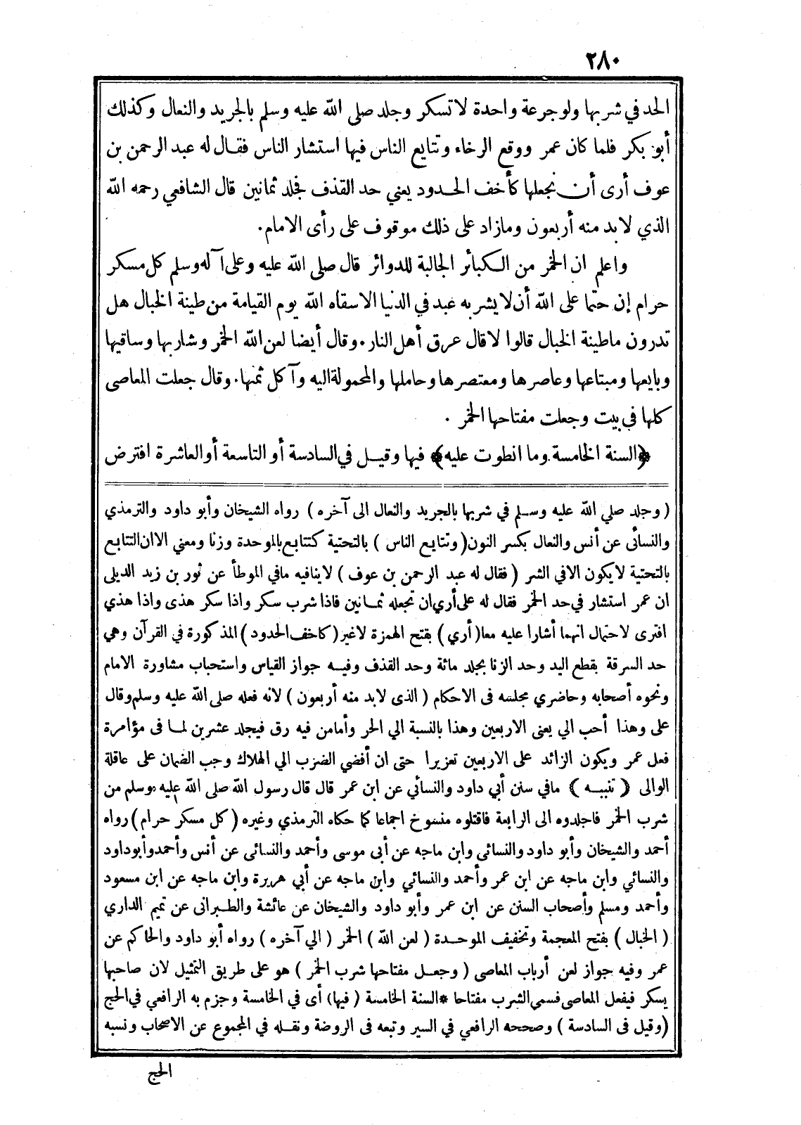 السنة الخامسة وما انطوت عليه فيها وقيل في السادسة أو التاسعة أو العاشرة افترض (وجلد صلى الله عليه وسلم في شربها بالجريد والنعال الى آخره) رواه الشيخان وأبو داود والترمذي والنسائى عن أنس والنعال بكسر النون (وتتايع الناس) بالتحتية كتتابع بالموحدة وزنا ومعنى الا ان التتابع بالتحتية لا يكون الا في الشر (فقال له عبد الرحمن بن عوف) لا ينافيه ما في الموطأ عن ثور بن زيد الديلى ان عمر استشار في حد الخمر فقال له على أري ان تجعله ثمانين فاذا شرب سكر واذا سكر هذى واذا هذي افترى لاحتمال انهما أشارا عليه معا (أري) بفتح الهمزة لا غير (كاخف الحدود) المذكورة في القرآن وهي حد السرقة بقطع اليد وحد الزنا بجلد مائة وحد القذف وفيه جواز القياس واستحباب مشاورة الامام ونحوه أصحابه وحاضري مجلسه في الاحكام (الذى لا بد منه أربعون) لانه فعله صلى الله عليه وسلم وقال على وهذا أحب الي يعنى الاربعين وهذا بالنسبة الي الحر وأما من فيه رق فيجلد عشرين لما في مؤامرة فعل عمر ويكون الزائد على الاربعين تعزيرا حتى ان أفضي الضرب الي الهلاك وجب الضمان على عاقلة الوالى (تنبيه) ما في سنن أبي داود والنسائي عن ابن عمر قال قال رسول الله صلى الله عليه وسلم من شرب الخمر فاجلدوه الى الرابعة فاقتلوه منسوخ اجماعا كما حكاه الترمذي وغيره (كل مسكر حرام) رواه أحمد والشيخان وأبو داود والنسائى وابن ماجه عن أبى موسى وأحمد والنسائى عن أنس وأحمد وأبو داود والنسائي وابن ماجه عن ابن عمر وأحمد والنسائي وابن ماجه عن أبي هريرة وابن ماجه عن ابن مسعود وأحمد ومسلم وأصحاب السنن عن ابن عمر وأبو داود والشيخان عن عائشة والطبرانى عن تميم الداري (الخبال) بفتح المعجمة وتخفيف الموحدة (لعن الله) الخمر (الي آخره) رواه أبو داود والحاكم عن عمر وفيه جواز لعن أرباب المعاصى (وجعل مفتاحها شرب الخمر) هو على طريق التمثيل لان صاحبها يسكر فيفعل المعاصى فسمي الشرب مفتاحا* السنة الخامسة (فيها) أى في الخامسة وجزم به الرافعي في الحج (وقيل في السادسة) وصححه الرافعي في السير وتبعه في الروضة ونقله في المجموع عن الاصحاب ونسبه