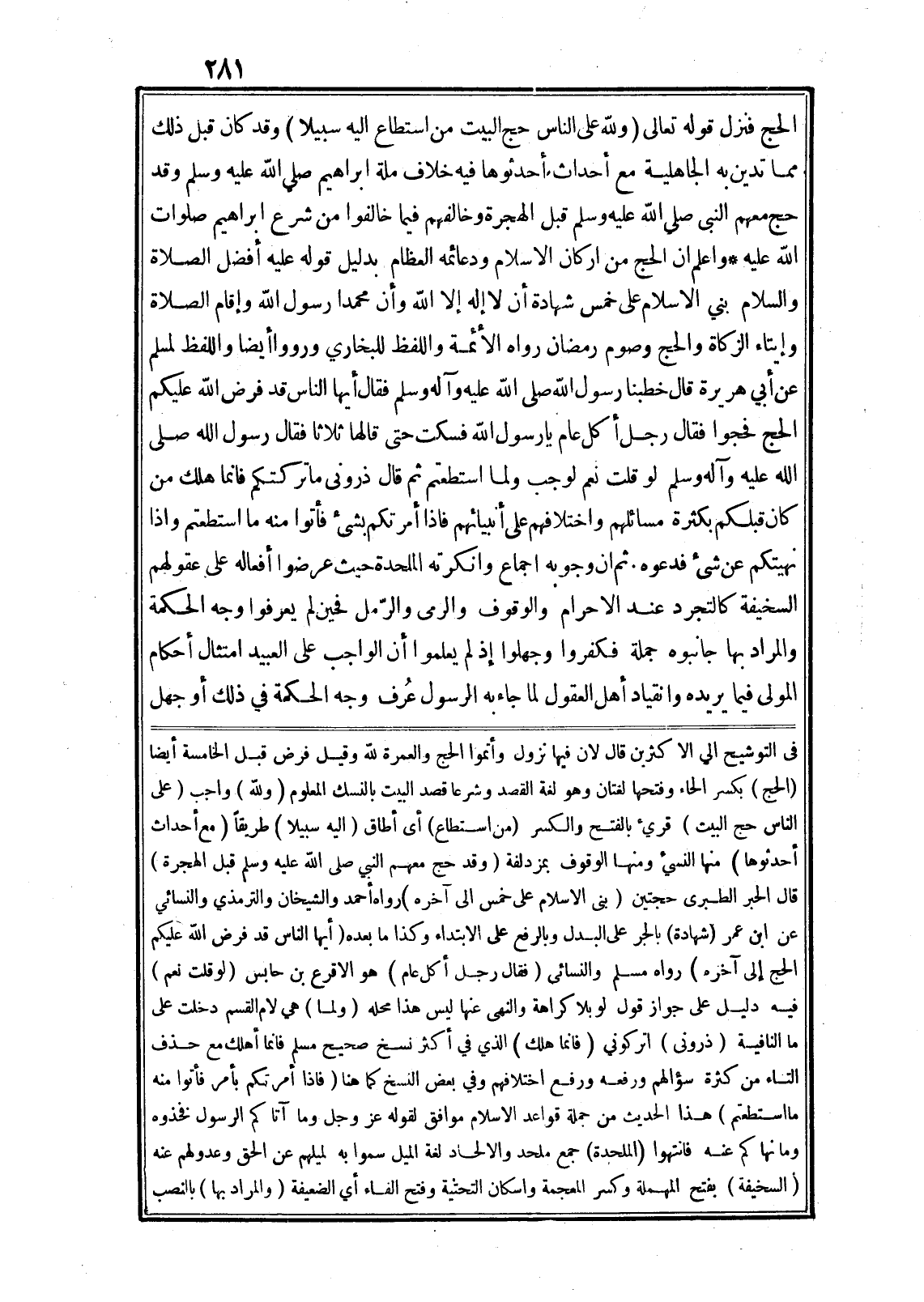 الحج فنزل قوله تعالى وَلِلَّهِ عَلَى النَّاسِ حِجُّ الْبَيْتِ مَنِ اسْتَطاعَ إِلَيْهِ سَبِيلًا وقد كان قبل ذلك مما تدين به الجاهلية مع أحداث أحدثوها فيه خلاف ملة ابراهيم صلى الله عليه وسلم وقد حج معهم النبى صلى الله عليه وسلم قبل الهجرة وخالفهم فيما خالفوا من شرع ابراهيم صلوات الله عليه* واعلم ان الحج من اركان الاسلام ودعائمه العظام بدليل قوله عليه أفضل الصلاة والسلام بني الاسلام على خمس شهادة أن لا إله إلا الله وأن محمدا رسول الله وإقام الصلاة وإيتاء الزكاة والحج وصوم رمضان رواه الأئمة واللفظ للبخاري ورووا أيضا واللفظ لمسلم عن أبي هريرة قال خطبنا رسول الله صلى الله عليه وآله وسلم فقال أيها الناس قد فرض الله عليكم الحج فحجوا فقال رجل أكل عام يا رسول الله فسكت حتى قالها ثلاثا فقال رسول الله صلى الله عليه وآله وسلم لو قلت نعم لوجب ولما استطعتم ثم قال ذرونى ما تركتكم فانما هلك من كان قبلكم بكثرة مسائلهم واختلافهم على أنبيائهم فاذا أمرتكم بشىء فأتوا منه ما استطعتم واذا نهيتكم عن شىء فدعوه. ثم ان وجوبه اجماع وانكرته الملحدة حيث عرضوا أفعاله على عقولهم السخيفة كالتجرد عند الاحرام والوقوف والرمى والرّمل فحين لم يعرفوا وجه الحكمة والمراد بها جانبوه جملة فكفروا وجهلوا إذ لم يعلموا أن الواجب على العبيد امتثال أحكام المولى فيما يريده وانقياد أهل العقول لما جاء به الرسول عرف وجه الحكمة في ذلك أو جهل فى التوشيح الي الاكثر بن قال لان فيها نزول وأتموا الحج والعمرة لله وقيل فرض قبل الخامسة أيضا (الحج) بكسر الحاء وفتحها لغتان وهو لغة القصد وشرعا قصد البيت بالنسك المعلوم (وَلِلَّهِ) واجب (عَلَى النَّاسِ حِجُّ الْبَيْتِ) قريء بالفتح والكسر (مَنِ اسْتَطاعَ) أى أطاق (إِلَيْهِ سَبِيلًا) طريقا (مع أحداث أحدثوها) منها النسيء ومنها الوقوف بمزدلفة (وقد حج معهم النبي صلى الله عليه وسلم قبل الهجرة) قال الحبر الطبرى حجتين (بنى الاسلام على خمس الى آخره) رواه أحمد والشيخان والترمذي والنسائي عن ابن عمر (شهادة) بالجر على البدل وبالرفع على الابتداء وكذا ما بعده (أيها الناس قد فرض الله عليكم الحج إلى آخره) رواه مسلم والنسائى (فقال رجل أكل عام) هو الاقرع بن حابس (لو قلت نعم) فيه دليل على جواز قول لو بلا كراهة والنهى عنها ليس هذا محله (ولما) هي لام القسم دخلت على ما النافية (ذرونى) اتركوني (فانما هلك) الذي في أكثر نسخ صحيح مسلم فانما أهلك مع حذف التاء من كثرة سؤالهم ورفعه ورفع اختلافهم وفي بعض النسخ كما هنا (فاذا أمرتكم بأمر فأتوا منه ما استطعتم) هذا الحديث من جملة قواعد الاسلام موافق لقوله عز وجل وَما آتاكُمُ الرَّسُولُ فَخُذُوهُ وَما نَهاكُمْ عَنْهُ فَانْتَهُوا (الملحدة) جمع ملحد والالحاد لغة الميل سموا به لميلهم عن الحق وعدولهم عنه (السخيفة) بفتح المهملة وكسر المعجمة واسكان التحتية وفتح الفاء أي الضعيفة (والمراد بها) بالنصب