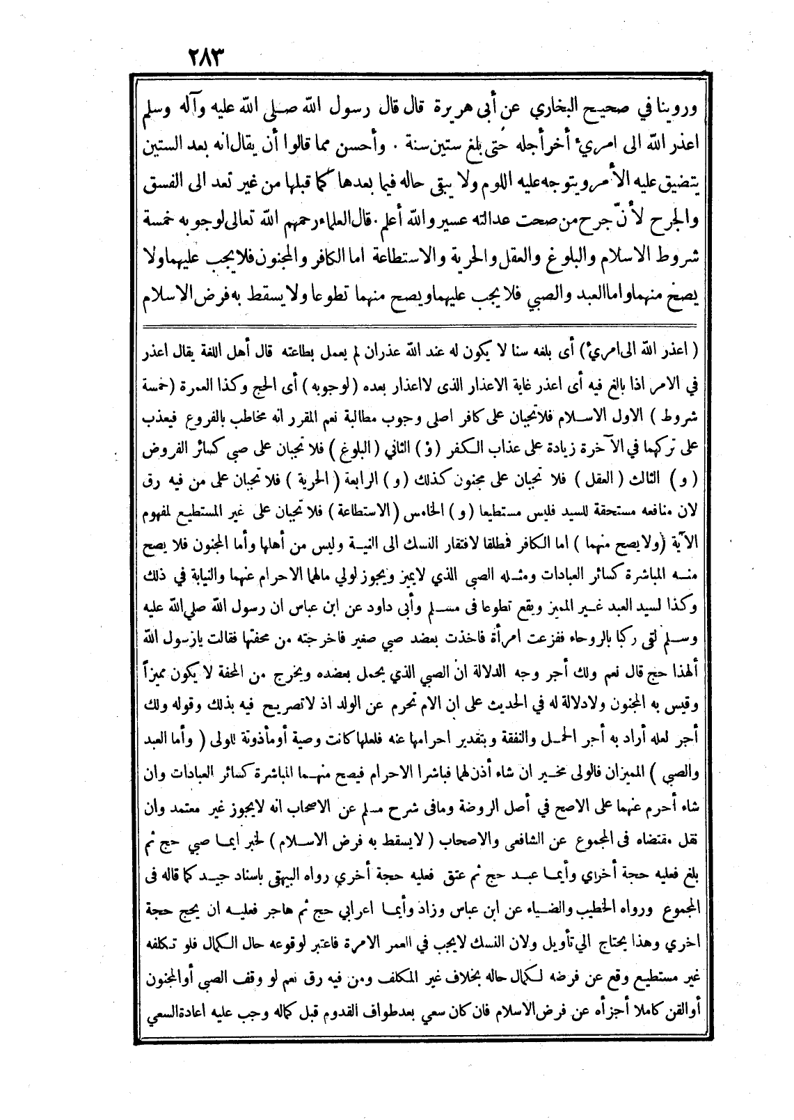 وروينا في صحيح البخاري عن أبى هريرة قال قال رسول الله صلى الله عليه وآله وسلم اعذر الله الى امريء أخر أجله حتى بلغ ستين سنة. وأحسن مما قالوا أن يقال انه بعد الستين يتضيق عليه الأمر ويتوجه عليه اللوم ولا يبقى حاله فيما بعدها كما قبلها من غير تعد الى الفسق والجرح لأنّ جرح من صحت عدالته عسير والله أعلم قال العلماء رحمهم الله تعالى لوجوبه خمسة شروط الاسلام والبلوغ والعقل والحرية والاستطاعة اما الكافر والمجنون فلا يجب عليهما ولا يصح منهما واما العبد والصبي فلا يجب عليهما ويصح منهما تطوعا ولا يسقط به فرض الاسلام (اعذر الله الى امريء) أى بلغه سنا لا يكون له عند الله عذران لم يعمل بطاعته قال أهل اللغة يقال اعذر في الامر اذا بالغ فيه أى اعذر غاية الاعذار الذى لا اعذار بعده (لوجوبه) أى الحج وكذا العمرة (خمسة شروط) الاول الاسلام فلا تجبان على كافر اصلى وجوب مطالبة نعم المقرر انه مخاطب بالفروع فيعذب على تركهما في الآخرة زيادة على عذاب الكفر (و) الثاني (البلوغ) فلا تجبان على صبى كسائر الفروض (و) الثالث (العقل) فلا تجبان على مجنون كذلك (و) الرابعة (الحرية) فلا تجبان على من فيه رق لان منافعه مستحقة للسيد فليس مستطيعا (و) الخامس (الاستطاعة) فلا تجبان على غير المستطيع لمفهوم الآية (ولا يصح منهما) اما الكافر فمطلقا لافتقار النسك الى النية وليس من أهلها وأما المجنون فلا يصح منه المباشرة كسائر العبادات ومثله الصبى الذي لا يميز ويجوز لولي مالهما الاحرام عنهما والنيابة في ذلك وكذا لسيد العبد غير المميز ويقع تطوعا في مسلم وأبى داود عن ابن عباس ان رسول الله صلى الله عليه وسلم لقى ركبا بالروحاء ففزعت امرأة فاخذت بعضد صبي صغير فاخرجته من محفتها فقالت يا رسول الله ألهذا حج قال نعم ولك أجر وجه الدلالة ان الصبي الذي يحمل بعضده ويخرج من المحفة لا يكون مميزا وقيس به المجنون ولا دلالة له في الحديث على ان الام تحرم عن الولد اذ لا تصريح فيه بذلك وقوله ولك أجر لعله أراد به أجر الحمل والنفقة وبتقدير احرامها عنه فلعلها كانت وصية أو مأذونة للولى (وأما العبد والصبي) المميزان فالولى مخير ان شاء أذن لهما فباشرا الاحرام فيصح منهما المباشرة كسائر العبادات وان شاء أحرم عنهما على الاصح في أصل الروضة وما في شرح مسلم عن الاصحاب انه لا يجوز غير معتمد وان نقل مقتضاه في المجموع عن الشافعى والاصحاب (لا يسقط به فرض الاسلام) لخبر ايما صبي حج ثم بلغ فعليه حجة أخرى وأيما عبد حج ثم عتق فعليه حجة أخرى رواه البيهقى باسناد جيد كما قاله في المجموع ورواه الخطيب والضياء عن ابن عباس وزاد وأيما اعرابي حج ثم هاجر فعليه ان يحج حجة اخري وهذا يحتاج الي تأويل ولان النسك لا يجب في العمر الامرة فاعتبر لوقوعه حال الكمال فلو تكلفه غير مستطيع وقع عن فرضه لكمال حاله بخلاف غير المكلف ومن فيه رق نعم لو وقف الصبى أو المجنون أو القن كاملا أجزأه عن فرض الاسلام فان كان سعي بعد طواف القدوم قبل كماله وجب عليه اعادة السعي