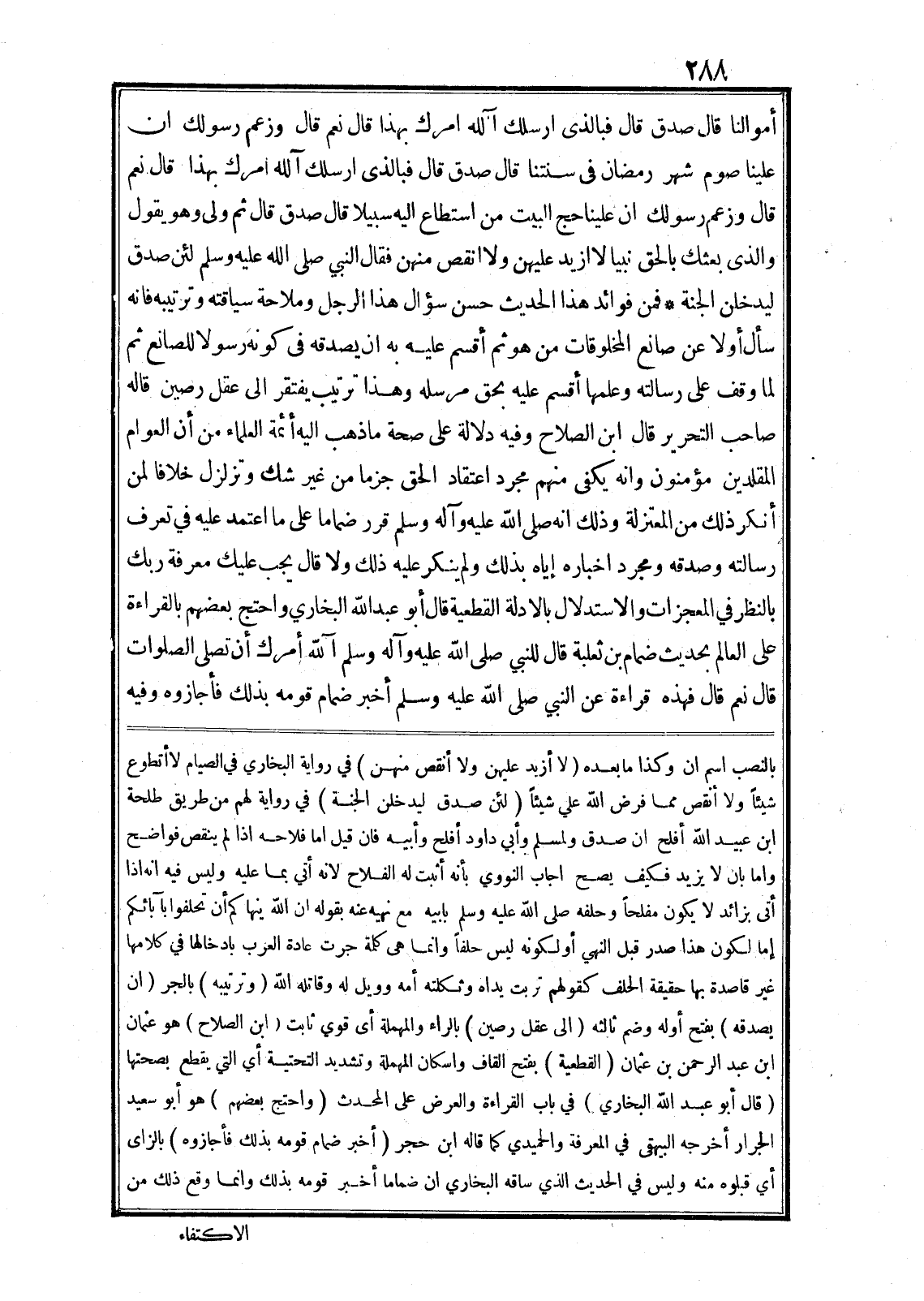 فمن فوائد هذا الحديث حسن سؤال هذا الرجل وملاحة سياقته وترتيبه فانه سأل أولا عن صانع المخلوقات من هو ثم أقسم عليه به ان يصدقه في كونه رسولا للصانع ثم لما وقف على رسالته وعلمها أقسم عليه بحق مرسله وهذا ترتيب يفتقر الى عقل رصين قاله صاحب التحرير قال ابن الصلاح وفيه دلالة على صحة ما ذهب اليه أئمة العلماء من أن العوام المقلدين مؤمنون وانه يكفى منهم مجرد اعتقاد الحق جزما من غير شك وتزلزل خلافا لمن أنكر ذلك من المعتزلة وذلك انه صلى الله عليه وآله وسلم قرر ضماما على ما اعتمد عليه في تعرف رسالته وصدقه ومجرد اخباره إياه بذلك ولم ينكر عليه ذلك ولا قال يجب عليك معرفة ربك بالنظر في المعجزات والاستدلال بالادلة القطعية قال أبو عبد الله البخاري واحتج بعضهم بالقراءة على العالم بحديث ضمام بن ثعلبة قال للنبي صلى الله عليه وآله وسلم آلله أمرك أن تصلى الصلوات قال نعم قال فهذه قراءة عن النبي صلى الله عليه وسلم أخبر ضمام قومه بذلك فأجازوه وفيه بالنصب اسم ان وكذا ما بعده (لا أزيد عليهن ولا أنقص منهن) في رواية البخاري في الصيام لا أتطوع شيئا ولا أنقص مما فرض الله علي شيئا (لئن صدق ليدخلن الجنة) في رواية لهم من طريق طلحة ابن عبيد الله أفلح ان صدق ولمسلم وأبي داود أفلح وأبيه فان قيل اما فلاحه اذا لم ينقص فواضح واما بان لا يزيد فكيف يصح اجاب النووي بأنه أثبت له الفلاح لانه أتي بما عليه وليس فيه انه اذا أتى بزائد لا يكون مفلحا وحلفه صلى الله عليه وسلم بابيه مع نهيه عنه بقوله ان الله ينهاكم أن تحلفوا بآبائكم إما لكون هذا صدر قبل النهي أو لكونه ليس حلفا وانما هى كلمة جرت عادة العرب بادخالها في كلامها غير قاصدة بها حقيقة الحلف كقولهم تربت يداه وثكلته أمه وويل له وقاتله الله (وترتيبه) بالجر (ان يصدقه) بفتح أوله وضم ثالثه (الى عقل رصين) بالراء والمهملة أى قوي ثابت (ابن الصلاح) هو عثمان ابن عبد الرحمن بن عثمان (القطعية) بفتح القاف واسكان المهملة وتشديد التحتية أي التي يقطع بصحتها (قال أبو عبد الله البخاري) في باب القراءة والعرض على المحدث (واحتج بعضهم) هو أبو سعيد الجرار أخرجه البيهقى في المعرفة والحميدي كما قاله ابن حجر (أخبر ضمام قومه بذلك فأجازوه) بالزاى أي قبلوه منه وليس في الحديث الذي ساقه البخاري ان ضماما أخبر قومه بذلك وانما وقع ذلك من