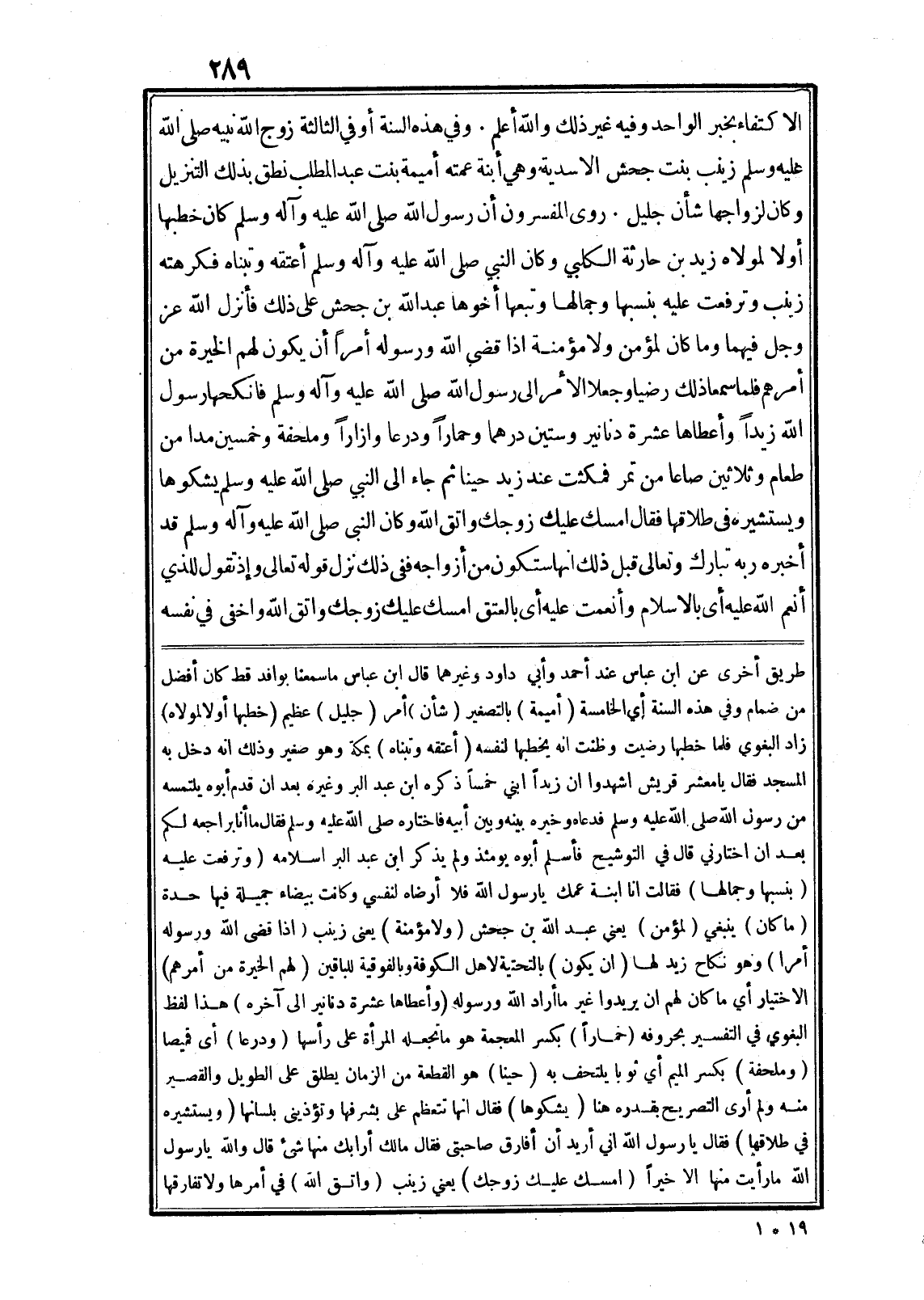 وفي هذه السنة أو في الثالثة زوج الله نبيه صلى الله عليه وسلم زينب بنت جحش الاسدية وهي أبنة عمته أميمة بنت عبد المطلب نطق بذلك التنزيل وكان لزواجها شأن جليل. روى المفسرون أن رسول الله صلى الله عليه وآله وسلم كان خطبها أو لا لمولاه زيد بن حارثة الكلبي وكان النبي صلى الله عليه وآله وسلم أعتقه وتبناه فكرهته زينب وترفعت عليه بنسبها وجمالها وتبعها أخوها عبد الله بن جحش على ذلك فأنزل الله عز وجل فيهما وَما كانَ لِمُؤْمِنٍ وَلا مُؤْمِنَةٍ إِذا قَضَى اللَّهُ وَرَسُولُهُ أَمْراً أَنْ يَكُونَ لَهُمُ الْخِيَرَةُ مِنْ أَمْرِهِمْ فلما سمعا ذلك رضيا وجعلا الأمر الى رسول الله صلى الله عليه وآله وسلم فانكحها رسول الله زيدا وأعطاها عشرة دنانير وستين درهما وحمارا ودرعا وازارا وملحفة وخمسين مدا من طعام وثلاثين صاعا من تمر فمكثت عند زيد حينا ثم جاء الى النبي صلى الله عليه وسلم يشكوها ويستشيره في طلاقها فقال أَمْسِكْ عَلَيْكَ زَوْجَكَ وَاتَّقِ اللَّهَ وكان النبى صلى الله عليه وآله وسلم قد أخبره ربه تبارك وتعالى قبل ذلك انها ستكون من أزواجه ففى ذلك نزل قوله تعالى وَإِذْ تَقُولُ لِلَّذِي أَنْعَمَ اللَّهُ عَلَيْهِ أى بالاسلام وَأَنْعَمْتَ عَلَيْهِ أى بالعتق أَمْسِكْ عَلَيْكَ زَوْجَكَ وَاتَّقِ اللَّهَ واخفى في نفسه طريق أخرى عن ابن عباس عند أحمد وأبي داود وغيرهما قال ابن عباس ما سمعنا بوافد قط كان أفضل من ضمام وفي هذه السنة أي الخامسة (أميمة) بالتصغير (شأن) أمر (جليل) عظيم (خطبها أولا لمولاه) زاد البغوي فلما خطبها رضيت وظنت انه يخطبها لنفسه (أعتقه وتبناه) بمكة وهو صغير وذلك انه دخل به المسجد فقال يا معشر قريش اشهدوا ان زيدا ابني خمسا ذكره ابن عبد البر وغيره بعد ان قدم أبوه يلتمسه من رسول الله صلى الله عليه وسلم فدعاه وخيره بينه وبين أبيه فاختاره صلى الله عليه وسلم فقال ما أنا براجعه لكم بعد ان اختارني قال في التوشيح فأسلم أبوه يومئذ ولم يذكر ابن عبد البر اسلامه (وترفعت عليه بنسبها وجمالها) فقالت انا ابنة عمك يا رسول الله فلا أرضاه لنفسي وكانت بيضاء جميلة فيها حدة (ما كان) ينبغي (لمؤمن) يعني عبد الله بن جحش (ولا مؤمنة) يعنى زينب (اذا قضى الله ورسوله أمرا) وهو نكاح زيد لها (ان يكون) بالتحتية لاهل الكوفة وبالفوقية للباقين (لهم الخيرة من أمرهم) الاختيار أي ما كان لهم ان يريدوا غير ما أراد الله ورسوله (وأعطاها عشرة دنانير الى آخره) هذا لفظ البغوي في التفسير بحروفه (خمارا) بكسر المعجمة هو ما تجعله المرأة على رأسها (ودرعا) أى قميصا (وملحفة) بكسر الميم أي ثوبا يلتحف به (حينا) هو القطعة من الزمان يطلق على الطويل والقصير منه ولم أرى التصريح بقدره هنا (يشكوها) فقال انها تتعظم على بشرفها وتؤذينى بلسانها (ويستشيره في طلاقها) فقال يا رسول الله إني أريد أن أفارق صاحبتى فقال مالك أرابك منها شئ قال والله يا رسول الله ما رأيت منها الا خيرا (أَمْسِكْ عَلَيْكَ زَوْجَكَ) يعني زينب (وَاتَّقِ اللَّهَ) في أمرها ولا تفارقها