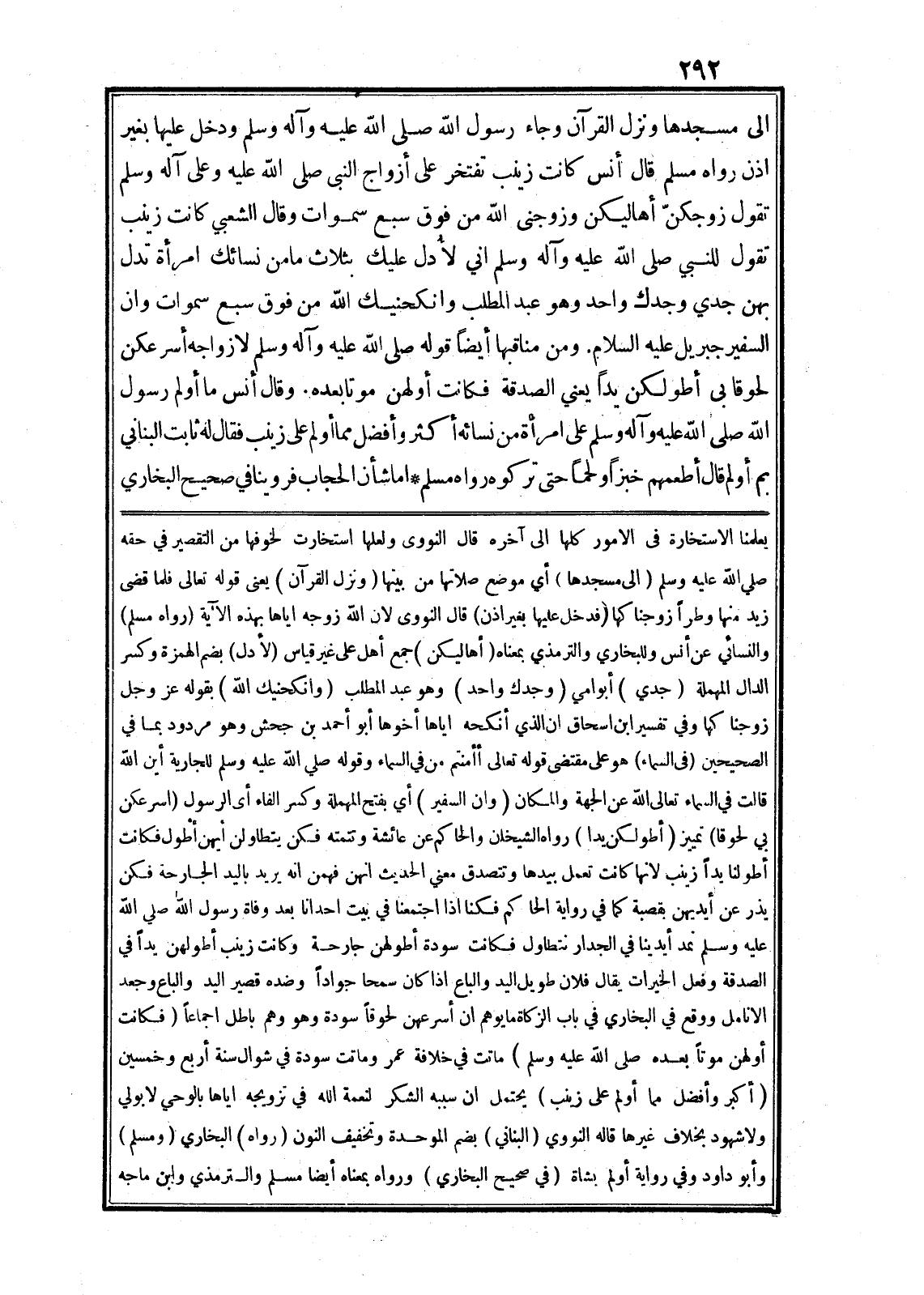 اما شأن الحجاب فروينا في صحيح البخاري يعلمنا الاستخارة في الامور كلها الى آخره قال النووى ولعلها استخارت لخوفها من التقصير في حقه صلى الله عليه وسلم (الى مسجدها) أي موضع صلاتها من بينها (ونزل القرآن) يعنى قوله تعالى فَلَمَّا قَضى زَيْدٌ مِنْها وَطَراً زَوَّجْناكَها (فدخل عليها بغير اذن) قال النووى لان الله زوجه اياها بهذه الآية (رواه مسلم) والنسائي عن أنس وللبخاري والترمذي بمعناه (أهاليكن) جمع أهل على غير قياس (لأدل) بضم الهمزة وكسر الدال المهملة (جدي) أبوامي (وجدك واحد) وهو عبد المطلب (وانكحنيك الله) بقوله عز وجل زَوَّجْناكَها وفي تفسير ابن اسحاق ان الذي أنكحه اياها أخوها أبو أحمد بن جحش وهو مردود بما في الصحيحين (في السماء) هو على مقتضى قوله تعالى أَأَمِنْتُمْ مَنْ فِي السَّماءِ وقوله صلى الله عليه وسلم للجارية أين الله قالت في السماء تعالى الله عن الجهة والمكان (وان السفير) أي بفتح المهملة وكسر الفاء أى الرسول (اسرعكن بي لحوقا) تمييز (أطولكن زيدا) رواه الشيخان والحاكم عن عائشة وتتمته فكن يتطاولن أيهن أطول فكانت أطولنا يدا زينب لانها كانت تعمل بيدها وتتصدق معنى الحديث انهن فهمن انه يريد باليد الجارحة فكن يذر عن أيديهن بقصبة كما في رواية الحاكم فكنا اذا اجتمعنا في بيت احدانا بعد وفاة رسول الله صلى الله عليه وسلم نمد أيدينا في الجدار نتطاول فكانت سودة أطولهن جارحة وكانت زينب أطولهن يدا في الصدقة وفعل الخيرات يقال فلان طويل اليد والباع اذا كان سمحا جوادا وضده قصير اليد والباع وجعد الانامل ووقع في البخاري في باب الزكاة ما يوهم ان أسرعهن لحوقا سودة وهو وهم باطل اجماعا (فكانت أولهن موتا بعده صلى الله عليه وسلم) ماتت في خلافة عمر وماتت سودة في شوال سنة أربع وخمسين (أكبر وأفضل مما أولم على زينب) يحتمل ان سببه الشكر لنعمة الله في تزويجه اياها بالوحي لا بولي ولا شهود بخلاف غيرها قاله النووي (البناني) بضم الموحدة وتخفيف النون (رواه) البخاري (ومسلم) وأبو داود وفي رواية أولم بشاة (في صحيح البخاري) ورواه بمعناه أيضا مسلم والترمذي وابن ماجه