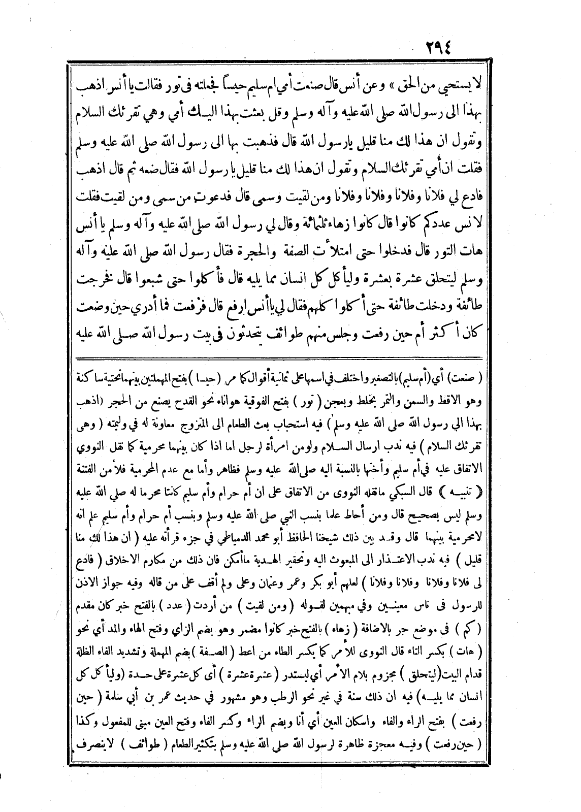 لا يَسْتَحْيِي مِنَ الْحَقِّ» وعن أنس قال صنعت أمي ام سليم حيسا فجعلته في تور فقالت يا أنس اذهب بهذا الى رسول الله صلى الله عليه وآله وسلم وقل بعثت بهذا اليك أمي وهي تقرئك السلام وتقول ان هذا لك منا قليل يا رسول الله قال فذهبت بها الى رسول الله صلى الله عليه وسلم فقلت ان أمي تقرئك السلام وتقول ان هذا لك منا قليل يا رسول الله فقال ضعه ثم قال اذهب فادع لي فلانا وفلانا وفلانا وفلانا ومن لقيت وسمى قال فدعوت من سمى ومن لقيت فقلت لانس عددكم كانوا قال كانوا زهاء ثلثمائة وقال لي رسول الله صلى الله عليه وآله وسلم يا أنس هات التور قال فدخلوا حتى امتلأت الصفة والحجرة فقال رسول الله صلى الله عليه وآله وسلم ليتحلق عشرة بعشرة وليأكل كل انسان مما يليه قال فأكلوا حتى شبعوا قال فخرجت طائفة ودخلت طائفة حتى أكلوا كلهم فقال لي يا أنس ارفع قال فرفعت فما أدري حين وضعت كان أكثر أم حين رفعت وجلس منهم طوائف يتحدثون في بيت رسول الله صلى الله عليه (صنعت) أي (أم سليم) بالتصغير واختلف في اسمها على ثمانية أقوال كما مر (حيسا) بفتح المهملتين بينهما تحتية ساكنة وهو الاقط والسمن والتمر يخلط ويعجن (تور) بفتح الفوقية هواناء نحو القدح يصنع من الحجر (اذهب بهذا الى رسول الله صلى الله عليه وسلم) فيه استحباب بعث الطعام الى المتزوج معاونة له في وليمته (وهى تقرئك السلام) فيه ندب ارسال السلام ولو من امرأة لرجل اما اذا كان بينهما محرمية كما نقل النووي الاتفاق عليه في أم سليم وأختها بالنسبة اليه صلى الله عليه وسلم فظاهر وأما مع عدم المحرمية فلأ من الفتنة (تنبيه) قال السبكي ما نقله النووى من الاتفاق على ان أم حرام وأم سليم كانتا محرما له صلى الله عليه وسلم ليس بصحيح قال ومن أحاط علما بنسب النبي صلى الله عليه وسلم وبنسب أم حرام وأم سليم علم انه لا محرمية بينهما قال وقد بين ذلك شيخنا الحافظ أبو محمد الدمياطي في جزء قرأته عليه (ان هذا لك منا قليل) فيه ندب الاعتذار الى المبعوث اليه وتحقير الهدية ما أمكن فان ذلك من مكارم الاخلاق (فادع لى فلانا وفلانا وفلانا وفلانا) لعلهم أبو بكر وعمر وعثمان وعلى ولم أقف على من قاله وفيه جواز الاذن للرسول في ناس معينين وفي مبهمين لقوله (ومن لقيت) من أردت (عدد) بالفتح خبر كان مقدم (كم) فى موضع جر بالاضافة (زهاء) بالفتح خبر كانوا مضمر وهو بضم الزاي وفتح الهاء والمد أي نحو (هات) بكسر التاء قال النووى للأمر كما يكسر الطاء من اعط (الصفة) بضم المهملة وتشديد الفاء الظلة قدام البيت (ليتحلق) مجزوم بلام الأمر أي ليستدر (عشرة عشرة) أى كل عشرة على حدة (وليأكل كل انسان مما يليه) فيه ان ذلك سنة في غير نحو الرطب وهو مشهور في حديث عمر بن أبي سلمة (حين رفعت) بفتح الراء والفاء واسكان العين أي أنا وبضم الراء وكسر الفاء وفتح العين مبنى للمفعول وكذا (حين رفعت) وفيه معجزة ظاهرة لرسول الله صلى الله عليه وسلم بتكثير الطعام (طوائف) لا ينصرف