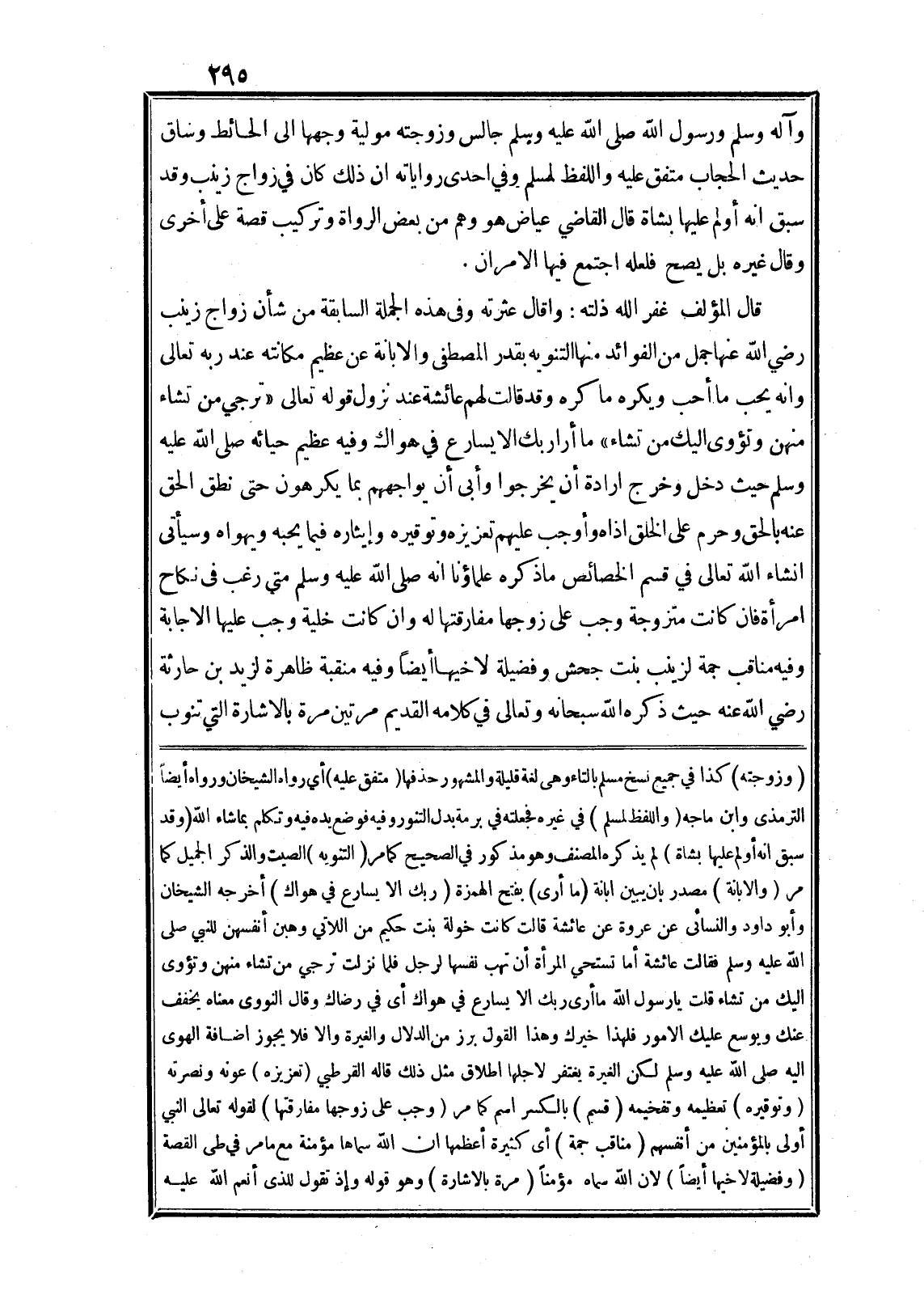 قال المؤلف غفر الله ذلته: واقال عثرته وفي هذه الجملة السابقة من شأن زواج زينب رضي الله عنها جمل من الفوائد منها التنويه بقدر المصطفى والابانة عن عظيم مكانته عند ربه تعالى وانه يحب ما أحب ويكره ما كره وقد قالت لهم عائشة عند نزول قوله تعالى «تُرْجِي مَنْ تَشاءُ مِنْهُنَّ وَتُؤْوِي إِلَيْكَ مَنْ تَشاءُ» ما أرا ربك الا يسارع في هواك وفيه عظيم حيائه صلى الله عليه وسلم حيث دخل وخرج ارادة أن يخرجوا وأبى أن يواجههم بما يكرهون حتى نطق الحق عنه بالحق وحرم على الخلق اذاه وأوجب عليهم تعزيزه وتوقيره وإيثاره فيما يحبه ويهواه وسيأتى انشاء الله تعالى في قسم الخصائص ما ذكره علماؤنا انه صلى الله عليه وسلم متي رغب في نكاح امرأة فان كانت متزوجة وجب على زوجها مفارقتها له وان كانت خلية وجب عليها الاجابة وفيه مناقب جمة لزينب بنت جحش وفضيلة لاخيها أيضا وفيه منقبة ظاهرة لزيد بن حارثة رضي الله عنه حيث ذكره الله سبحانه وتعالى في كلامه القديم مرتين مرة بالاشارة التي تنوب (وزوجته) كذا في جميع نسخ مسلم بالتاء وهى لغة قليلة والمشهور حذفها (متفق عليه) أي رواه الشيخان ورواه أيضا الترمذى وابن ماجه (واللفظ لمسلم) في غيره فجعلته في برمة بدل التنور وفيه فوضع يده فيه وتكلم بما شاء الله (وقد سبق انه أولم عليها بشاة) لم يذكره المصنف وهو مذكور في الصحيح كما مر (التنويه) الصيت والذكر الجميل كما مر (والابانة) مصدر بابن يبين ابانة (ما أرى) بفتح الهمزة (ربك الا يسارع في هواك) أخرجه الشيخان وأبو داود والنسائى عن عروة عن عائشة قالت كانت خولة بنت حكيم من اللاتي وهبن أنفسهن للنبي صلى الله عليه وسلم فقالت عائشة أما تستحي المرأة أن تهب نفسها لرجل فلما نزلت ترجي من تشاء منهن وتؤوى اليك من تشاء قلت يا رسول الله ما أرى ربك الا يسارع في هواك أى في رضاك وقال النووى معناه يخفف عنك ويوسع عليك الامور فلهذا خيرك وهذا القول برز من الدلال والغيرة والا فلا يجوز اضافة الهوى اليه صلى الله عليه وسلم لكن الغيرة يغتفر لاجلها اطلاق مثل ذلك قاله القرطبي (تعزيزه) عونه ونصرته (وتوقيره) تعظيمه وتفخيمه (قسم) بالكسر اسم كما مر (وجب على زوجها مفارقتها) لقوله تعالى النَّبِيُّ أَوْلى بِالْمُؤْمِنِينَ مِنْ أَنْفُسِهِمْ (مناقب جمة) أى كثيرة أعظمها ان الله سماها مؤمنة مع مامر في طى القصة (وفضيلة لاخيها أيضا) لان الله سماه مؤمنا (مرة بالاشارة) وهو قوله وَإِذْ تَقُولُ لِلَّذِي أَنْعَمَ اللَّهُ عَلَيْهِ
