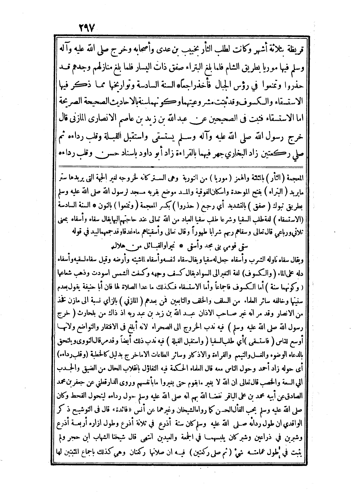 السنة السادسة وتواريخها مما ذكر فيها الاستسقاء والكسوف وقد ثبتت مشروعيتهما وكونهما سنة بالاحاديث الصحيحة الصريحة اما الاستسقاء فثبت في الصحيحين عن عبد الله بن زيد بن عاصم الانصارى المازنى قال خرج رسول الله صلى الله عليه وآله وسلم يستسقى واستقبل القبلة وقلب رداءه ثم صلي ركعتين زاد البخاري جهر فيهما بالقراءة زاد أبو داود باسناد حسن وقلب رداءه المعجمة (الثأر) بالمثلثة والهمز (موريا) من التورية وهى الستر كانه لخروجه لغير الجهة التى يريدها ستر ما يريد (البتراء) بفتح الموحدة واسكان الفوقية والمد موضع بقربه مسجد لرسول الله صلى الله عليه وسلم بطريق تبوك (صفق) بالتشديد أي رجع (حذروا) بكسر المعجمة (وتمنعوا) بالنون* السنة السادسة (الاستسقاء) لغة طلب السقيا وشرعا طلب سقيا العباد من الله تعالى عند حاجتهم اليها يقال سقاه وأسقاه بمعنى ثلاثي ورباعي قال تعالى وَسَقاهُمْ رَبُّهُمْ شَراباً طَهُوراً وقال تعالى لَأَسْقَيْناهُمْ ماءً غَدَقاً وقد جمعهما لبيد في قوله