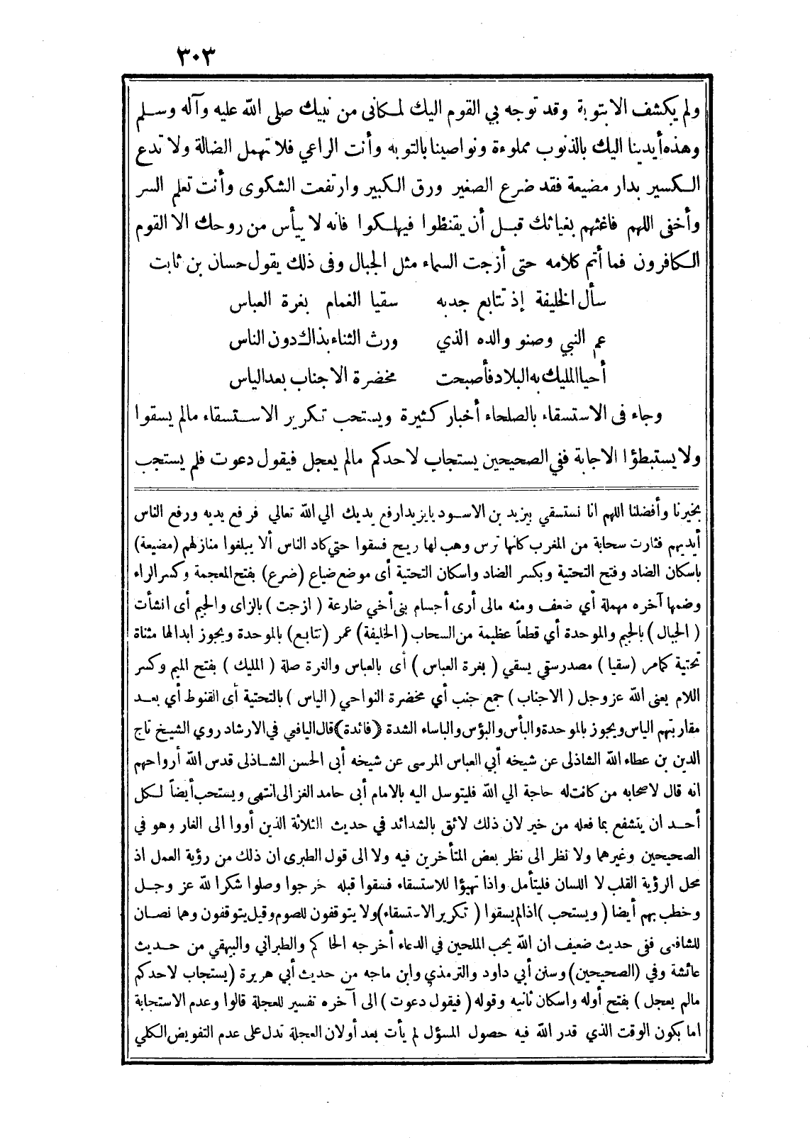 وجاء في الاستسقاء بالصلحاء أخبار كثيرة ويستحب تكرير الاستسقاء ما لم يسقوا ولا يستبطؤا الاجابة ففي الصحيحين يستجاب لاحدكم ما لم يعجل فيقول دعوت فلم يستجب بخيرنا وأفضلنا اللهم انا نستسقي بيزيد بن الاسود يا يزيد ارفع يديك الي الله تعالى فرفع يديه ورفع الناس أيديهم فثارت سحابة من المغرب كانها ترس وهب لها ريح فسقوا حتي كاد الناس ألا يبلغوا منازلهم (مضيعة) باسكان الضاد وفتح التحتية وبكسر الضاد واسكان التحتية أى موضع ضياع (ضرع) بفتح المعجمة وكسر الراء وضمها آخره مهملة أي ضعف ومنه مالى أرى أجسام بنى أخي ضارعة (ازجت) بالزاى والجيم أى انشأت (الجبال) بالجيم والموحدة أي قطعا عظيمة من السحاب (الخليفة) عمر (تتابع) بالموحدة ويجوز ابدالها مثناة تحتية كما مر (سقيا) مصدر سقي يسقي (بغرة العباس) أى بالعباس والغرة صلة (المليك) بفتح الميم وكسر اللام يعنى الله عز وجل (الاجناب) جمع جنب أي مخضرة النواحي (الياس) بالتحتية أى القنوط أي بعد مقاربتهم الياس ويجوز بالموحدة والبأس والبؤس والباساء الشدة (فائدة) قال اليافعي في الارشاد روي الشيخ تاج الدين بن عطاء الله الشاذلى عن شيخه أبي العباس المرسى عن شيخه أبى الحسن الشاذلى قدس الله أرواحهم انه قال لاصحابه من كانت له حاجة الي الله فليتوسل اليه بالامام أبى حامد الغزالى انتهى ويستحب أيضا لكل أحد ان يتشفع بما فعله من خير لان ذلك لائق بالشدائد في حديث الثلاثة الذين أووا الى الغار وهو في الصحيحين وغيرهما ولا نظر الى نظر بعض المتأخرين فيه ولا الى قول الطبرى ان ذلك من رؤية العمل اذ محل الرؤية القلب لا اللسان فليتأمل واذا تهيؤا للاستسقاء فسقوا قبله خرجوا وصلوا شكرا لله عز وجل وخطب بهم أيضا (ويستحب) اذا لم يسقوا (تكرير الاستسقاء) ولا يتوقفون للصوم وقيل يتوقفون وهما نصان للشافعى ففى حديث ضعيف ان الله يحب الملحين في الدعاء أخرجه الحاكم والطبراني والبيهقي من حديث عائشة وفي (الصحيحين) وسنن أبي داود والترمذي وابن ماجه من حديث أبي هريرة (يستجاب لاحدكم ما لم يعجل) بفتح أوله واسكان ثانيه وقوله (فيقول دعوت) الى آخره تفسير للعجلة قالوا وعدم الاستجابة اما بكون الوقت الذي قدر الله فيه حصول المسؤل لم يأت بعد أو لان العجلة تدل على عدم التفويض الكلي