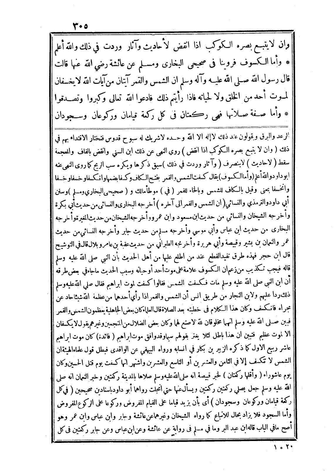 وان لا يتبع بصره الكوكب اذا انقض لأحاديث وآثار وردت في ذلك والله أعلم* وأما الكسوف فروينا في صحيحى البخارى ومسلم عن عائشة رضي الله عنها قالت قال رسول الله صلى الله عليه وآله وسلم ان الشمس والقمر آيتان من آيات الله لا يخسفان لموت أحد من الخلق ولا لحياته فاذا رأيتم ذلك فادعوا الله تعالى وكبروا وتصدقوا* وأما صفة صلاتها فهى ركعتان في كل ركعة قيامان وركوعان وسجودان الرعد والبرق ويقولون عند ذلك لا إله الا الله وحده لا شريك له سبوح قدوس فنختار الاقتداء بهم في ذلك (وان لا يتبع بصره الكوكب اذا انقض) روى النهى عن ذلك ابن السني وانقض بالقاف والمعجمة سقط (لاحاديث) لا ينصرف (وآثار وردت في ذلك) سبق ذكرها ويكره سب الريح كما روى النهى عنه ابو داود والله أعلم (وأما الكسوف) يقال كسفت الشمس والقمر بفتح الكاف وكسفا بضمها وانكسفا وخسفا وخسفا وانخسفا بمعنى وقيل بالكاف للشمس وبالخاء للقمر (في) موطأ مالك و (صحيحى البخاري ومسلم) وسنن أبي داود والترمذي والنسائي (ان الشمس والقمر الى آخره) أخرجه البخارى والنسائى من حديث أبي بكرة وأخرجه الشيخان والنسائي من حديث ابن مسعود وابن عمرو وأخرجه الشيخان من حديث المغيرة وأخرجه البخارى من حديث ابن عباس وأبي موسي وأخرجه مسلم من حديث جابر وأخرجه النسائي من حديث عمر والنعمان بن بشير وقبيصة وأبي هريرة وأخرجه الطبراني من حديث عقبة بن عامر وبلال قال في التوشيح قال ابن حجر فهذه طرق تفيد القطع عند من اطلع عليها من أهل الحديث بأن النبي صلى الله عليه وسلم قاله فيجب تكذيب من زعم ان الكسوف علامة على موت أحد أو حياته وسبب الحديث ما جاء في بعض طرقه أن ابن النبى صلى الله عليه وسلم مات فكسفت الشمس فقالوا كسفت لموت ابراهيم فقال صلى الله عليه وسلم ذلك ردا عليهم ولابن النجار من طريق انس أن الشمس والقمر اذا رأي أحدهما من عظمة الله شيئا حاد عن مجراه فانكسف وكان هذا الكلام في خطبته بعد الصلاة قال العلماء كان بعض الجاهلية يعظمون الشمس والقمر فبين صلى الله عليه وسلم انهما مخلوقان لله لا صنع لهما وكان بعض الضلال من المنجمين وغيرهم يقول لا يكسفان الا لموت عظيم فتبين ان هذا باطل لئلا يغتر بقولهم سيما وقد وافق موت ابراهيم (فائدة) كان موت ابراهيم عاشر ربيع الاول كما ذكره الزبير بن بكار في انسابه ورواه البيهقي عن الواقدى فبطل قول علماء الهيئة ان الشمس لا تنكسف إلا في الثامن والعشرين أو التاسع والعشرين واشتهر انها كسفت يوم قتل الحسين وكان يوم عاشوراء (وأقلها ركعتان) لخبر قبيصة انه صلى الله عليه وسلم صلاها بالمدينة ركعتين وخبر النعمان انه صلى الله عليه وسلم جعل يصلي ركعتين ركعتين ويسأل عنها حتي انجلت رواهما أبو داود باسنادين صحيحين (في كل ركعة قيامان وركوعان وسجودان) أى بأن يزيد قياما على القيام المفروض وركوعا على الركوع المفروض وأما السجود فلا يزاد بحال للاتباع كما رواه الشيخان وغيرهما عن عائشة وجابر وابن عباس وابن عمر وهو أصح ما في الباب قاله ابن عبد البر وما في مسلم في رواية عن عائشة وعن ابن عباس وعن جابر ركعتين في كل