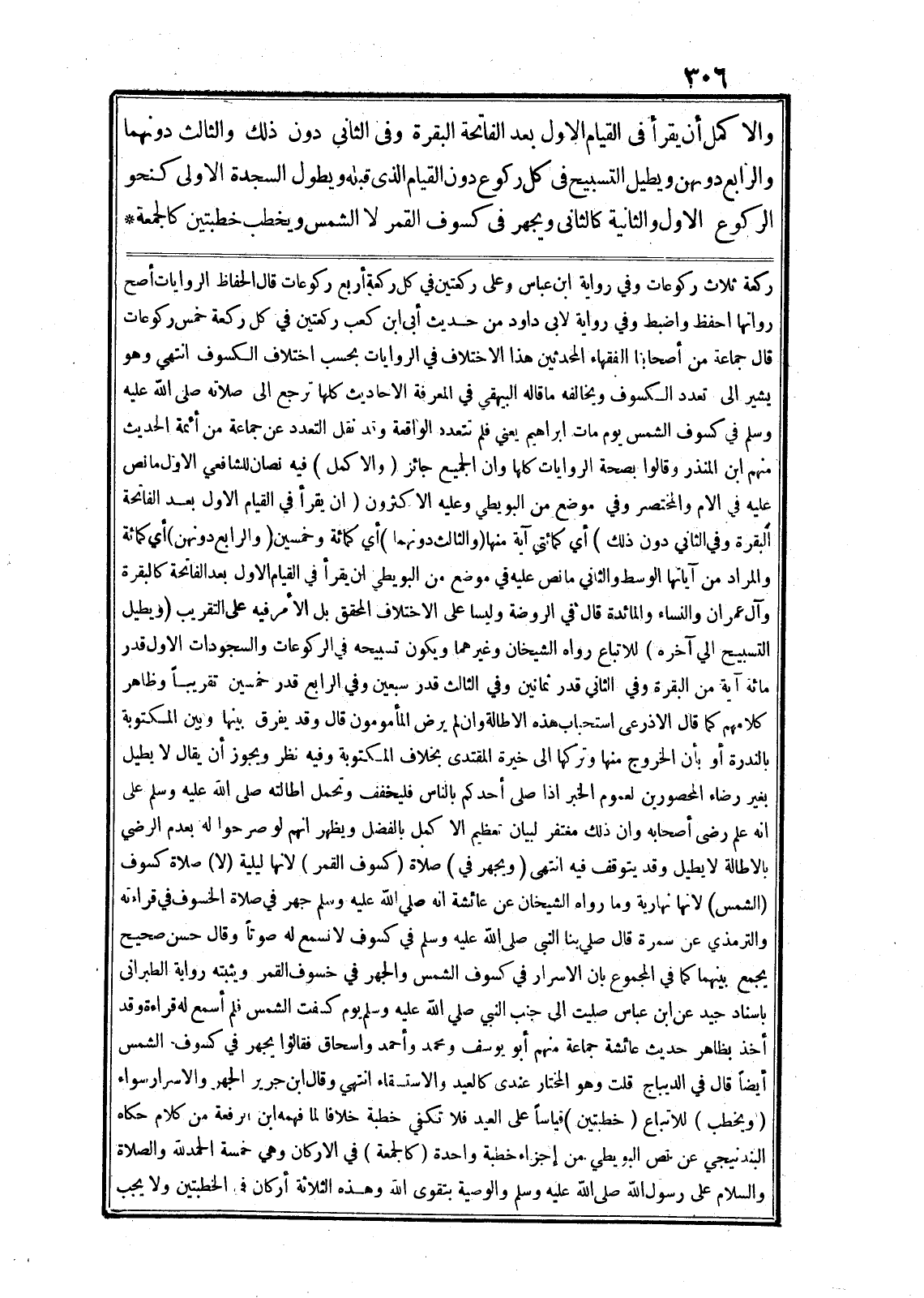 والاكمل أن يقرأ في القيام الاول بعد الفاتحة البقرة وفي الثانى دون ذلك والثالث دونهما والرابع دونهن ويطيل التسبيح في كل ركوع دون القيام الذى قبله ويطول السجدة الاولى كنحو الركوع الاول والثانية كالثانى ويجهر في كسوف القمر لا الشمس ويخطب خطبتين كالجمعة* ركعة ثلاث ركوعات وفي رواية ابن عباس وعلى ركعتين في كل ركعة أربع ركوعات قال الحفاظ الروايات أصح رواتها احفظ واضبط وفي رواية لابى داود من حديث أبى ابن كعب ركعتين في كل ركعة خمس ركوعات قال جماعة من أصحابنا الفقهاء المحدثين هذا الاختلاف في الروايات بحسب اختلاف الكسوف انتهي وهو يشير الى تعدد الكسوف ويخالفه ما قاله البيهقي في المعرفة الاحاديث كلها ترجع الى صلاته صلى الله عليه وسلم في كسوف الشمس يوم مات ابراهيم يعني فلم تتعدد الواقعة وقد نقل التعدد عن جماعة من أئمة الحديث منهم ابن المنذر وقالوا بصحة الروايات كلها وان الجميع جائز (والاكمل) فيه نصان للشافعي الاول ما نص عليه في الام والمختصر وفي موضع من البويطي وعليه الاكثرون (ان يقرأ في القيام الاول بعد الفاتحة البقرة وفي الثاني دون ذلك) أي كمائتي آية منها (والثالث دونهما) أي كمائة وخمسين (والرابع دونهن) أي كمائة والمراد من آياتها الوسط والثاني ما نص عليه في موضع من البويطي ان يقرأ في القيام الاول بعد الفاتحة كالبقرة وآل عمران والنساء والمائدة قال في الروضة وليسا على الاختلاف المحقق بل الأمر فيه على التقريب (ويطيل التسبيح الي آخره) للاتباع رواه الشيخان وغيرهما ويكون تسبيحه في الركوعات والسجودات الاول قدر مائة آية من البقرة وفي الثاني قدر ثمانين وفي الثالث قدر سبعين وفي الرابع قدر خمسين تقريبا وظاهر كلامهم كما قال الاذرعى استحباب هذه الاطالة وان لم يرض المأمومون قال وقد يفرق بينها وبين المكتوبة بالندرة أو بأن الخروج منها وتركها الى خيرة المقتدى بخلاف المكتوبة وفيه نظر ويجوز أن يقال لا يطيل بغير رضاء المحصورين لعموم الخبر اذا صلى أحدكم بالناس فليخفف وتحمل اطالته صلى الله عليه وسلم على انه علم رضى أصحابه وان ذلك مغتفر لبيان تعظيم الا كمل بالفضل ويظهر انهم لو صرحوا له بعدم الرضي بالاطالة لا يطيل وقد يتوقف فيه انتهى (ويجهر في) صلاة (كسوف القمر) لانها ليلية (لا) صلاة كسوف (الشمس) لانها نهارية وما رواه الشيخان عن عائشة انه صلى الله عليه وسلم جهر في صلاة الخسوف في قراءته والترمذي عن سمرة قال صلى بنا النبى صلى الله عليه وسلم في كسوف لا نسمع له صوتا وقال حسن صحيح يجمع بينهما كما في المجموع بان الاسرار في كسوف الشمس والجهر في خسوف القمر ويثبته رواية الطبرانى باسناد جيد عن ابن عباس صليت الى جنب النبي صلى الله عليه وسلم يوم كسفت الشمس فلم أسمع له قراءة وقد أخذ بظاهر حديث عائشة جماعة منهم أبو يوسف ومحمد وأحمد واسحاق فقالوا يجهر في كسوف الشمس أيضا قال في الديباج قلت وهو المختار عندى كالعيد والاستسقاء انتهي وقال ابن جرير الجهر والاسرار سواء (ويخطب) للاتباع (خطبتين) قياسا على العيد فلا تكفي خطبة خلافا لما فهمه ابن الرفعة من كلام حكاه البندنيجي عن نص البويطي من إجزاء خطبة واحدة (كالجمعة) في الاركان وهي خمسة الحمد لله والصلاة والسلام على رسول الله صلى الله عليه وسلم والوصية بتقوى الله وهذه الثلاثة أركان في الخطبتين ولا يجب
