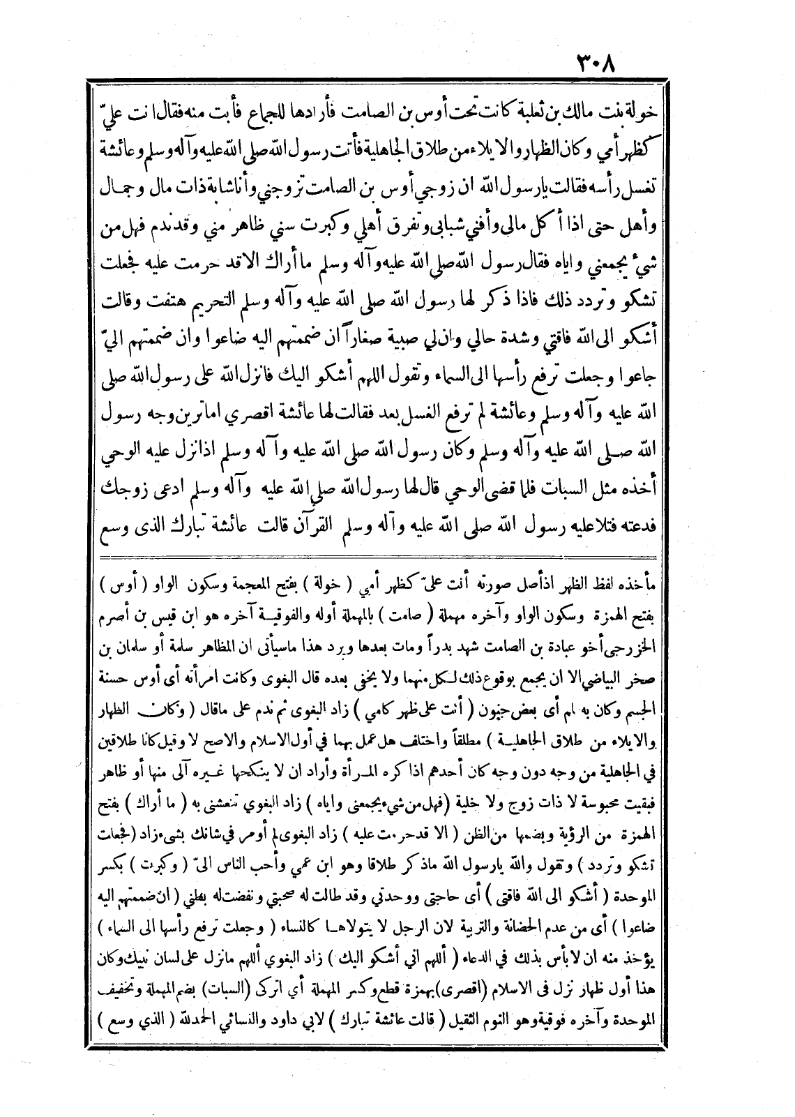 خولة بنت مالك بن ثعلبة كانت تحت أوس بن الصامت فأرادها للجماع فأبت منه فقال انت عليّ كظهر أمي وكان الظهار والايلاء من طلاق الجاهلية فأتت رسول الله صلى الله عليه وآله وسلم وعائشة تغسل رأسه فقالت يا رسول الله ان زوجي أوس بن الصامت تزوجني وأنا شابة ذات مال وجمال وأهل حتى اذا أكل مالى وأفني شبابى وتفرق أهلي وكبرت سني ظاهر مني وقد ندم فهل من شيء يجمعنى واياه فقال رسول الله صلى الله عليه وآله وسلم ما أراك الا قد حرمت عليه فجعلت تشكو وتردد ذلك فاذا ذكر لها رسول الله صلى الله عليه وآله وسلم التحريم هتفت وقالت أشكو الى الله فاقتي وشدة حالي وان لي صبية صغارا ان ضممتهم اليه ضاعوا وان ضممتهم اليّ جاعوا وجعلت ترفع رأسها الى السماء وتقول اللهم أشكو اليك فانزل الله على رسول الله صلى الله عليه وآله وسلم وعائشة لم ترفع الغسل بعد فقالت لها عائشة اقصري اما ترين وجه رسول الله صلى الله عليه وآله وسلم وكان رسول الله صلى الله عليه وآله وسلم اذا نزل عليه الوحي أخذه مثل السبات فلما قضى الوحي قال لها رسول الله صلى الله عليه وآله وسلم ادعى زوجك فدعته فتلا عليه رسول الله صلى الله عليه وآله وسلم القرآن قالت عائشة تبارك الذى وسع مأخذه لفظ الظهر اذ أصل صورته أنت علىّ كظهر أمي (خولة) بفتح المعجمة وسكون الواو (أوس) بفتح الهمزة وسكون الواو وآخره مهملة (صامت) بالمهملة أوله والفوقية آخره هو ابن قيس بن أصرم الخزرجى أخو عبادة بن الصامت شهد بدرا ومات بعدها ويرد هذا ما سيأتى ان المظاهر سلمة أو سلمان بن صخر البياضي الا ان يجمع بوقوع ذلك لكل منهما ولا يخفى بعده قال البغوى وكانت امرأته أى أوس حسنة الجسم وكان به لمم أى بعض جنون (أنت على ظهر كامي) زاد البغوى ثم ندم على ما قال (وكان الظهار والايلاء من طلاق الجاهلية) مطلقا واختلف هل عمل بهما في أوّل الاسلام والاصح لا وقيل كانا طلاقين في الجاهلية من وجه دون وجه كان أحدهم اذا كره المرأة وأراد ان لا ينكحها غيره آلى منها أو ظاهر فبقيت محبوسة لا ذات زوج ولا خلية (فهل من شيء يجمعنى واياه) زاد البغوي تنعشنى به (ما أراك) بفتح الهمزة من الرؤية وبضمها من الظن (الا قد حرمت عليه) زاد البغوى لم أومر في شانك بشىء زاد (فجعلت تشكو وتردد) وتقول والله يا رسول الله ما ذكر طلاقا وهو ابن عمي وأحب الناس الىّ (وكبرت) بكسر الموحدة (أشكو الى الله فاقتى) أى حاجتى ووحدتي وقد طالت له صحبتي ونفضت له بطني (ان ضممتهم اليه ضاعوا) أى من عدم الحضانة والتربية لان الرجل لا يتولاها كالنساء (وجعلت ترفع رأسها الى السماء) يؤخذ منه ان لا بأس بذلك في الدعاء (أللهم اني أشكو اليك) زاد البغوي أللهم ما نزل على لسان نبيك وكان هذا أوّل ظهار نزل في الاسلام (اقصرى) بهمزة قطع وكسر المهملة أي اتركى (السبات) بضم المهملة وتخفيف الموحدة وآخره فوقية وهو النوم الثقيل (قالت عائشة تبارك) لابي داود والنسائي الحمد لله (الذي وسع)