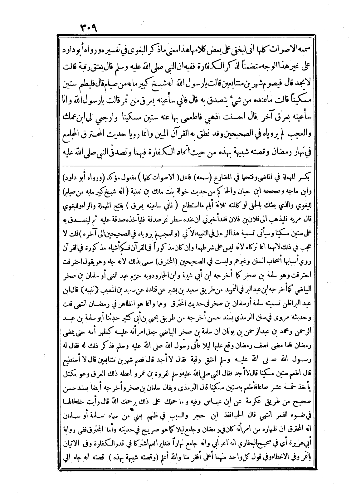 سمعه الاصوات كلها انى ليخفى على بعض كلامها هذا معنى ما ذكر البغوى في تفسيره ورواه أبو داود على غير هذا الوجه متضمنا لذكر الكفارة ففيه ان النبى صلى الله عليه وسلم قال يعتق رقبة قالت لا يجد قال فيصوم شهرين متتابعين قالت يا رسول الله انه شيخ كبير ما به من صيام قال فليطعم ستين مسكينا قالت ما عنده من شيء يتصدق به قال فاني سأعينه بعرق من تمر قالت يا رسول الله وانا سأعينه بعرق آخر قال احسنت اذهبي فاطعمى بها عنه ستين مسكينا وارجعي الى ابن عمك والعجب لم يروياه في الصحيحين وقد نطق به القرآن المبين وانما رويا حديث المحترق المجامع في نهار رمضان وقصته شبيهة بهذه من حيث اتحاد الكفارة فيهما وتصدق النبى صلى الله عليه بكسر المهملة في الماضى وفتحها في المضارع (سمعه) فاعل (الاصوات كلها) مفعول مؤكد (ورواه أبو داود) وابن ماجه وصححه ابن حبان والحاكم من حديث خولة بنت مالك بن ثعلبة (انه شيخ كبير ما به من صيام) للبغوي والذي بعثك بالحق لو كلفته ثلاثة أيام ما استطاع (فاني ساعينه بعرق) بفتح المهملة والراء وللبغوي قال مريه فليذهب الى فلان بن فلان فقد أخبرني ان عنده سطر تمر صدقة فليأخذه صدقة عليه ثم ليتصدق به على ستين مسكينا وسيأتى تسمية هذا الرجل في التنبيه الآتي (والعجب لم يروياه في الصحيحين الى آخره) قلت لا عجب في ذلك لانهما انما تركاه لانه ليس على شرطهما وان كان مذكورا في القرآن فكم أشياء مذكورة في القرآن روي أسبابها أصحاب السنن وغيرهم وليست في الصحيحين (المحترق) سمى بذلك لانه جاء وهو يقول احترقت احترقت وهو سلمة بن صخر كما أخرجه ابن أبي شيبة وابن الجارود وبه جزم عبد الغنى أو سلمان بن صخر البياضي كما أخرجه ابن عبد البر في التمهيد من طريق سعيد بن بشير عن قتادة عن سعيد بن المسيب (تنبيه) قال ابن عبد البراظن تسميته سلمة أو سلمان بن صخر في حديث المحترق وهما وانما هو المظاهر في رمضان انتهى قلت وحديثه مروى في سنن الترمذي بسند حسن أخرجه من طريق يحيي بن أبي كثير حدثنا أبو سلمة بن عبد الرحمن ومحمد بن عبد الرحمن بن يونان ان سلمة بن صخر البياضي جعل امرأته عليه كظهر أمه حتى يمضى رمضان فلما مضى نصف رمضان وقع عليها ليلا فأتى رسول الله صلى الله عليه وسلم فذكر ذلك له فقال له رسول الله صلى الله عليه وسلم اعتق رقبة فقال لا أجد قال فصم شهرين متتابعين قال لا أستطيع قال اطعم ستين مسكينا قال لا أجد فقال النبي صلى الله عليه وسلم لفروة بن عمرو اعطه ذلك العرق وهو مكتل يأخذ خمسة عشر صاعا فأطعم به ستين مسكينا قال الترمذى ويقال سلمان بن صخر وأخرجه أيضا بسند حسن صحيح من طريق عكرمة عن ابن عباس وفيه وما حملك على ذلك يرحمك الله قال رأيت خلخالها في ضوء القمر انتهي قال الحافظ ابن حجر والسبب في ظنهم يعني من سماه سلمة أو سلمان انه المحترق ان ظهاره من امرأته كان في رمضان وجامع ليلا كما هو صريح في حديثه وأما المحترق ففى رواية أبي هريرة أي في صحيح البخاري انه اعرابي وانه جامع نهارا فتغايرا نعم اشتركا في قدر الكفارة وفي الاتيان بالتمر وفي الاعطاء وفي قول كل واحد منهما أعلى أفقر منا والله أعلم (وقصته شبيهة بهذه) قصته انه جاء الي