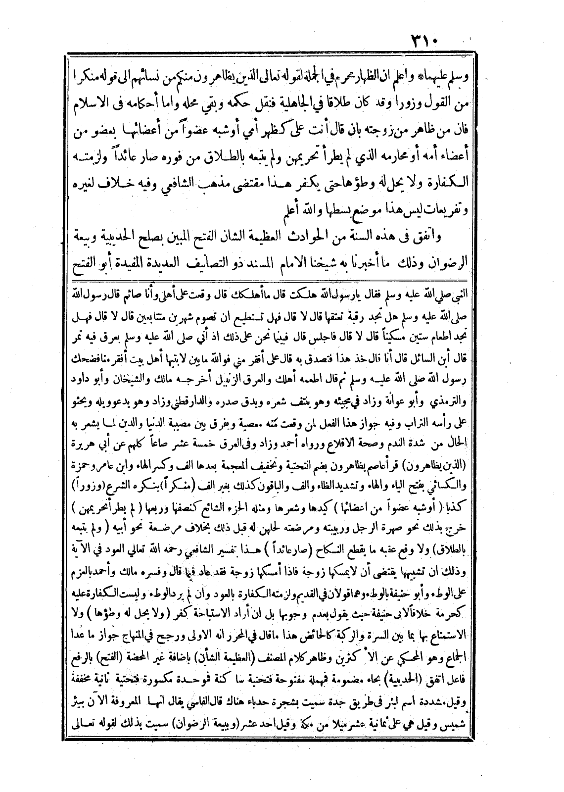 واتفق في هذه السنة من الحوادث العظيمة الشان الفتح المبين بصلح الحديبية وبيعة الرضوان وذلك ما أخبرنا به شيخنا الامام المسند ذو التصانيف العديدة المفيدة أبو الفتح النبى صلى الله عليه وسلم فقال يا رسول الله هلكت قال ما أهلكك قال وقعت على أهلى وأنا صائم قال رسول الله صلى الله عليه وسلم هل تجد رقبة تعتقها قال لا قال فهل تستطيع ان تصوم شهرين متتابعين قال لا قال فهل تجد اطعام ستين مسكينا قال لا قال فاجلس قال فبينما نحن على ذلك اذ أتي صلى الله عليه وسلم بعرق فيه تمر قال أين السائل قال أنا قال خذ هذا فتصدق به قال على أفقر مني فو الله ما بين لابتيها أهل بيت أفقر منا فضحك رسول الله صلى الله عليه وسلم ثم قال اطعمه أهلك والعرق الزنبيل أخرجه مالك والشيخان وأبو داود والترمذي وأبو عوانة وزاد في مجيئه وهو ينتف شعره ويدق صدره والدارقطني وزاد وهو يدعو ويله ويحثو على رأسه التراب وفيه جواز هذا الفعل لمن وقعت منه معصية ويفرق بين مصيبة الدنيا والدين لما يشعر به الحال من شدة الندم وصحة الاقلاع ورواه أحمد وزاد وفي العرق خمسة عشر صاعا كلهم عن أبي هريرة (الذين يظاهرون) قرأ عاصم يظاهرون بضم التحتية وتخفيف المعجمة بعدها الف وكسر الهاء وابن عامر وحمزة والكسائي بفتح الياء والهاء وتشديد الظاء والف والباقون كذلك بغير الف (منكرا) ينكره الشرع (وزورا) كذبا (أو شبه عضوا من اعضائها) كيدها وشعرها ومثله الجزء الشائع كنصفها وربعها (لم يطر أنحريمهن) خرج بذلك نحو صهرة الرجل وربيبته ومرضعته لحلهن له قبل ذلك بخلاف مرضعة نحو أبيه (ولم يتبعه بالطلاق) ولا وقع عقبه ما يقطع النكاح (صار عائدا) هذا تفسير الشافعي رحمه الله تعالى العود في الآية وذلك ان تشبيهها يقتضى أن لا يمسكها زوجة فاذا أمسكها زوجة فقد عاد فيما قال وفسره مالك وأحمد بالعزم على الوطء وأبو حنيفة بالوطء وهما قولان في القديم ولزمته الكفارة بالعود وان لم يرد الوطء وليست الكفارة عليه كحرمة خلافا لابى حنيفة حيث يقول بعدم وجوبها بل ان أراد الاستباحة كفر (ولا يحل له وطؤها) ولا الاستمتاع بها بما بين السرة والركبة كالحائض هذا ما قال في المحرر انه الاولى ورجح في المنهاج جواز ما عدا الجماع وهو المحكي عن الأكثرين وظاهر كلام المصنف (العظيمة الشأن) باضافة غير المحضة (الفتح) بالرفع فاعل اتفق (الحديبية) بحاء مضمومة فمهملة مفتوحة فتحتية ساكنة فموحدة مكسورة فتحتية ثانية مخففة وقيل مشددة اسم لبئر في طريق جدة سميت بشجرة حدباء هناك قال الفاسي يقال انها المعروفة الآن ببئر شميس وقيل هي على ثمانية عشر ميلا من مكة وقيل احد عشر (وببيعة الرضوان) سميت بذلك لقوله تعالى