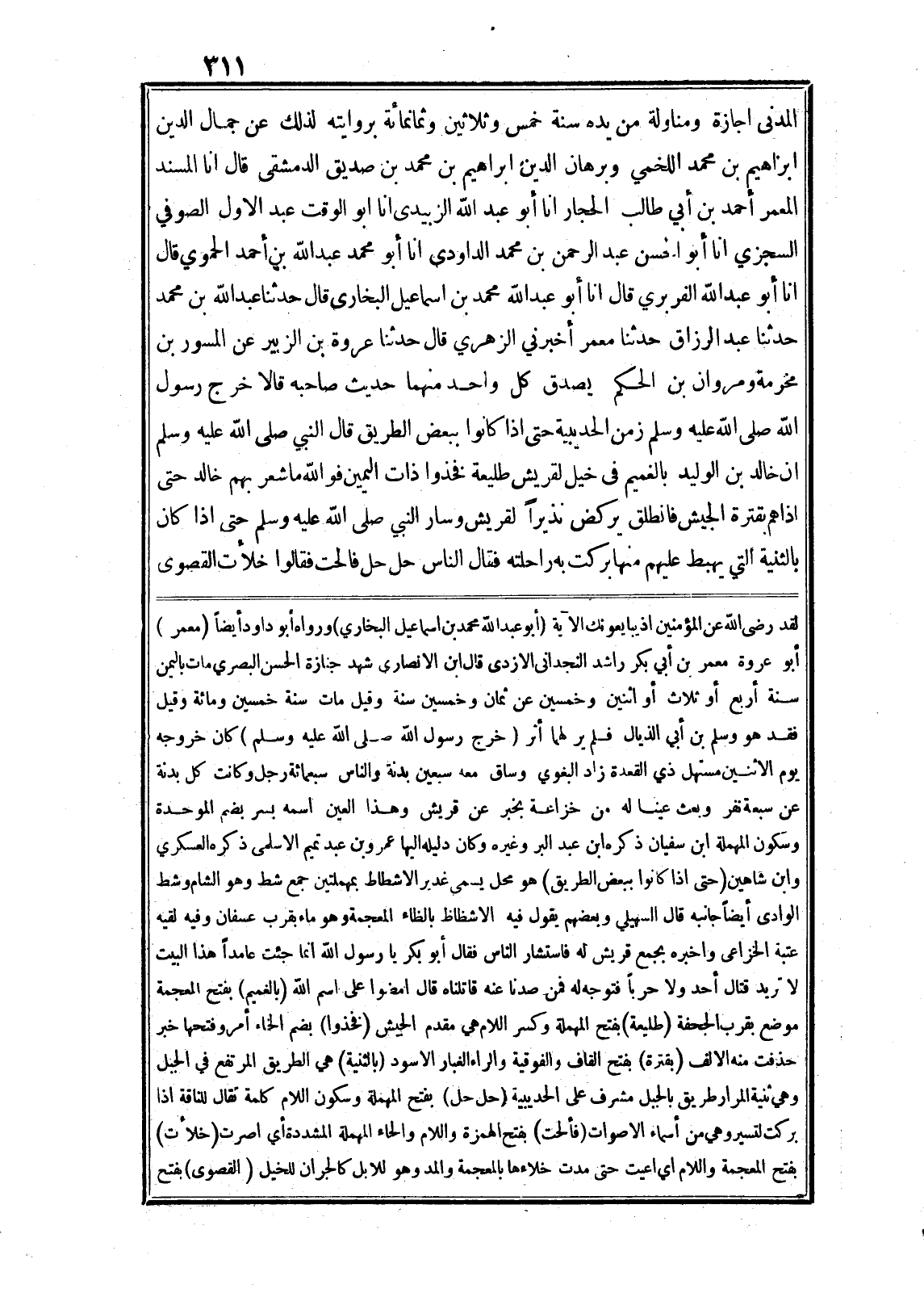 المدنى اجازة ومناولة من يده سنة خمس وثلاثين وثمانمائة بروايته لذلك عن جمال الدين ابراهيم بن محمد اللخمي وبرهان الدين ابراهيم بن محمد بن صديق الدمشقى قال انا المسند المعمر أحمد بن أبي طالب الحجار انا أبو عبد الله الزبيدى انا ابو الوقت عبد الاول الصوفي السجزي انا أبو الحسن عبد الرحمن بن محمد الداودى انا أبو محمد عبد الله بن أحمد الحموي قال انا أبو عبد الله الفربري قال انا أبو عبد الله محمد بن اسماعيل البخارى قال حدثنا عبد الله بن محمد حدثنا عبد الرزاق حدثنا معمر أخبرني الزهري قال حدثنا عروة بن الزبير عن المسور بن مخرمة ومروان بن الحكم يصدق كل واحد منهما حديث صاحبه قالا خرج رسول الله صلى الله عليه وسلم زمن الحديبية حتى اذا كانوا ببعض الطريق قال النبي صلى الله عليه وسلم ان خالد بن الوليد بالغميم في خيل لقريش طليعة فخذوا ذات اليمين فو الله ما شعر بهم خالد حتى اذا هم بقترة الجيش فانطلق يركض نذيرا لقريش وسار النبي صلى الله عليه وسلم حتى اذا كان بالثنية التي يهبط عليهم منها بركت به راحلته فقال الناس حل حل فالحت فقالوا خلأت القصوى لَقَدْ رَضِيَ اللَّهُ عَنِ الْمُؤْمِنِينَ إِذْ يُبايِعُونَكَ الآية (أبو عبد الله محمد بن اسماعيل البخاري) ورواه أبو داود أيضا (معمر) أبو عروة معمر بن أبي بكر راشد النجدانى الازدى قال ابن الانصارى شهد جنازة الحسن البصري مات باليمن سنة أربع أو ثلاث أو اثنين وخمسين عن ثمان وخمسين سنة وقيل مات سنة خمسين ومائة وقيل فقد هو وسلم بن أبي الذيال فلم ير لهما أثر (خرج رسول الله صلى الله عليه وسلم) كان خروجه يوم الاثنين مستهل ذي القعدة زاد البغوي وساق معه سبعين بدنة والناس سبعمائة رجل وكانت كل بدنة عن سبعة نفر وبعث عينا له من خزاعة بخبر عن قريش وهذا العين اسمه بسر بضم الموحدة وسكون المهملة ابن سفيان ذكره ابن عبد البر وغيره وكان دليله اليها عمرو بن عبد تميم الاسلمى ذكره العسكري وابن شاهين (حتى اذا كانوا ببعض الطريق) هو محل يسمى غدير الاشطاط بمهملتين جمع شط وهو الشام وشط الوادى أيضا جانبه قال السهيلي وبعضهم يقول فيه الاشظاظ بالظاء المعجمة وهو ماء بقرب عسفان وفيه لقيه عتبة الخزاعى واخبره بجمع قريش له فاستشار الناس فقال أبو بكر يا رسول الله انما جئت عامدا هذا البيت لا تريد قتال أحد ولا حربا فتوجه له فمن صدنا عنه قاتلناه قال امضوا على اسم الله (بالغميم) بفتح المعجمة موضع بقرب الجحفة (طليعة) بفتح المهملة وكسر اللام هي مقدم الجيش (فخذوا) بضم الخاء أمر وفتحها خبر حذفت منه الالف (بقترة) بفتح القاف والفوقية والراء الغبار الاسود (بالثنية) هي الطريق المرتفع في الجبل وهي ثنية المرار طريق بالجبل مشرف على الحديبية (حل حل) بفتح المهملة وسكون اللام كلمة تقال للناقة اذا بركت لتسير وهي من أسماء الاصوات (فألحت) بفتح الهمزة واللام والحاء المهملة المشددة أي اصرت (خلأت) بفتح المعجمة واللام اي اعيت حتى مدت خلاءها بالمعجمة والمد وهو للابل كالجران للخيل (القصوى) بفتح