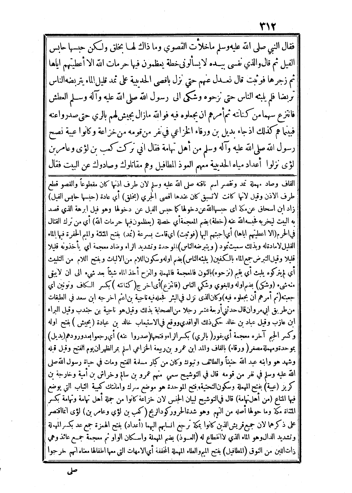 فقال النبي صلى الله عليه وسلم ما خلأت القصوى وما ذاك لها بخلق ولكن حبسها حابس الفيل ثم قال والذي نفسى بيده لا يسألونى خطة يعظمون فيها حرمات الله الا أعطيتهم اياها ثم زجرها فوثبت قال فعدل عنهم حتي نزل باقصى الحديبية على ثمد قليل الماء يتربضه الناس تربضا فلم يلبثه الناس حتى نزحوه وشكى الى رسول الله صلى الله عليه وآله وسلم العطش فانتزع سهما من كنانته ثم أمرهم ان يجعلوه فيه فو الله ما زال يجيش لهم بالري حتى صدروا عنه فبينماهم كذلك اذ جاء بديل بن ورقاء الخزاعي في نفر من قومه من خزاعة وكانوا عيبة نصح رسول الله صلى الله عليه وآله وسلم من أهل تهامة فقال اني تركت كعب بن لؤى وعامر بن لؤى نزلوا أعداد مياه الحديبية معهم العوذ المطافيل وهم مقاتلوك وصادوك عن البيت فقال القاف وصاد مهملة تمد وتقصر اسم ناقته صلى الله عليه وسلم لان طرف اذنها كان مقطوعا والقصو قطع طرف الاذن وقيل لانها كانت لا تسبق كان عندها اقصى الجري (بخلق) أي عادة (حبسها حابس الفيل) زاد ابن اسحاق عن مكة اى حبسها الله عن دخولها كما حبس الفيل عن دخولها وهو فيل ابرهة الذي قصد به البيت ليخربه فحبسه الله عنه (خطة) بضم المعجمة أي خصلة (يعظمون فيها حرمات الله) أي من ترك القتال في الحرم (الا اعطيتهم اياها) أي اجبتهم اليها (فوثبت) اي قامت بسرعة (ثمد) بفتح المثلثة والميم الحفرة فيها الماء القليل لا مادة له وبذلك سميت ثمود (ويتبرضه الناس) بالموحدة وتشديد الراء وضاد معجمة اي يأخذونه قليلا قليلا وقيل التبرض جمع الماء بالكفين (يلبثه الناس) بضم اوله وسكون اللام من الالباث وبفتح اللام من التلبيث أي لم يتركوه يلبث أي يقيم (نزحوه) بالنون فالمعجمة فالمهملة والنزح أخذ الماء شيئا بعد شيء الى ان لا يبقى منه شىء (وشكى) بضم اوله وللبغوي وشكي الناس (فانتزع) أى اخرج (كنانته) بكسر الكاف ونونين اي جعبته (ثم أمرهم أن يجعلوه فيه) وكان الذى نزل في البئر فجعله فيه ناجية بن اعثم اخرجه ابن سعد في الطبقات من طريق ابي مروان قال حدثني أربعة عشر رجلا من الصحابة بذلك وقيل هو ناجية بن جندب وقيل البراء ابن عازب وقيل عباد بن خالد حكى ذلك الواقدي ووقع في الاستيعاب خالد بن عبادة (يجيش) بفتح اوله وكسر الجيم آخره معجمة أي يفور (بالري) بكسر الراء وفتحها (صدروا عنه) أي رجعوا بعد ورودهم (بديل) بموحدة ومهملة مصغر (ورقاء) بالقاف والمد ابن عمرو بن ربيعة الخزاعي اسلم بمر الظهران يوم الفتح وقيل قبله وشهد هو وابنه عبد الله حنينا والطائف وتبوك وكان من كبار مسلمة الفتح ومات في حياة رسول الله صلى الله عليه وسلم في نفر من قومه قال في التوشيح سمي منهم عمرو بن سالم وخراش بن أمية وخارجة بن كريز (عيبة) بفتح المهملة وسكون التحتية وفتح الموحدة هو موضع سرك وامانتك كعيبة الثياب التي يوضع فيها المتاع (من أهل تهامة) قال في التوشيح لبيان الجنس لان خزاعة كانوا من جملة أهل تهامة وتهامة بكسر المثناة مكة وما حولها أصله من التهم وهو شدة الحرور كود الريح (كعب بن لؤي وعامر بن) لؤى انما اقتصر على ذكرهما لان جميع قريش الذين كانوا بمكة ترجع انسابهم اليهما (أعداد) بفتح الهمزة جمع عد بكسر المهملة وتشديد الدال وهو الماء الذي لا انقطاع له (العوذ) بضم المهملة واسكان الواو ثم معجمة جمع عائذ وهي ذات اللبن من النوق (المطافيل) بفتح الميم والطاء المهملة المخففة أي الامهات التي معها اطفالها معناه انهم خرجوا