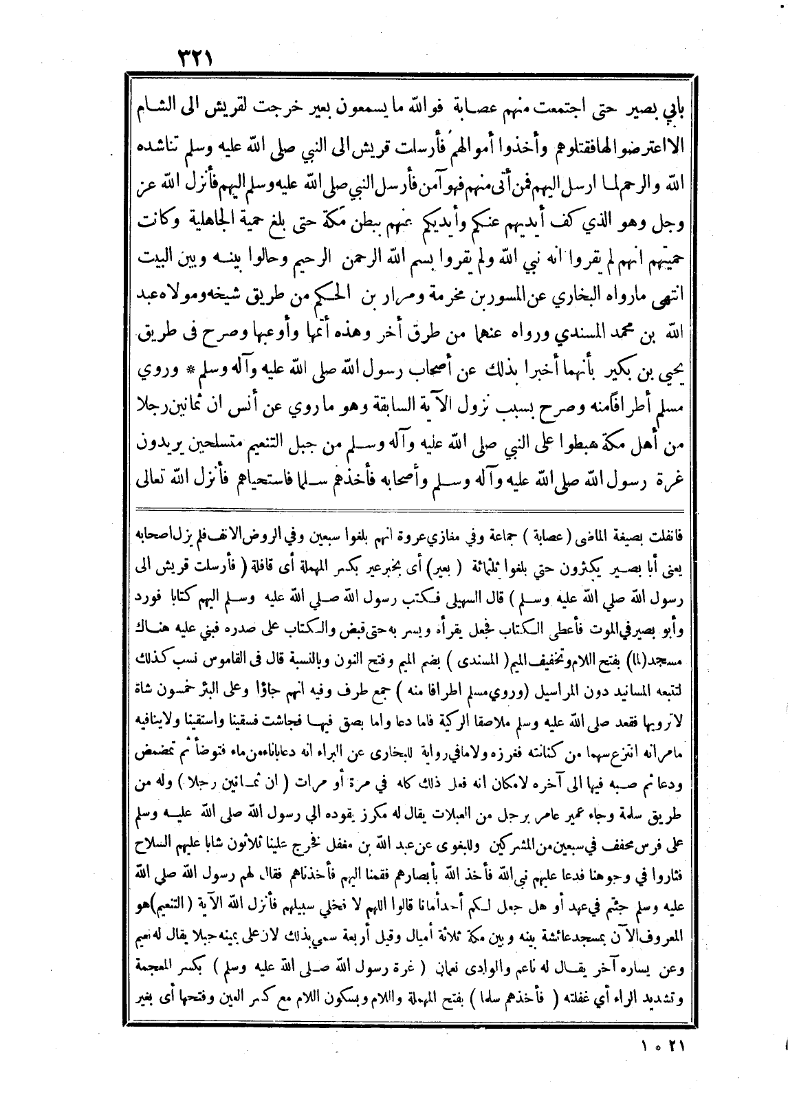 بابي بصير حتى اجتمعت منهم عصابة فو الله ما يسمعون بعير خرجت لقريش الى الشام الا اعترضوا لها فقتلوهم وأخذوا أموالهم فأرسلت قريش الى النبي صلى الله عليه وسلم تناشده الله والرحم لما ارسل اليهم فمن أتى منهم فهو آمن فأرسل النبي صلى الله عليه وسلم اليهم فأنزل الله عز وجل وَهُوَ الَّذِي كَفَّ أَيْدِيَهُمْ عَنْكُمْ وَأَيْدِيَكُمْ عَنْهُمْ بِبَطْنِ مَكَّةَ حتى بلغ حمية الجاهلية وكانت حميتهم انهم لم يقروا انه نبي الله ولم يقروا بِسْمِ اللَّهِ الرَّحْمنِ الرَّحِيمِ* وحالوا بينه وبين البيت انتهى ما رواه البخاري عن المسور بن مخرمة ومرار بن الحكم من طريق شيخه ومولاه عبد الله بن محمد المسندي ورواه عنهما من طرق أخر وهذه أتمها وأوعبها وصرح في طريق يحيى بن بكير بأنهما أخبرا بذلك عن أصحاب رسول الله صلى الله عليه وآله وسلم* وروي مسلم أطرافا منه وصرح بسبب نزول الآية السابقة وهو ما روي عن أنس ان ثمانين رجلا من أهل مكة هبطوا على النبي صلى الله عليه وآله وسلم من جبل التنعيم متسلحين يريدون غرة رسول الله صلى الله عليه وآله وسلم وأصحابه فأخذهم سلما فاستحياهم فأنزل الله تعالى فانفلت بصيغة الماضى (عصابة) جماعة وفي مغازي عروة انهم بلغوا سبعين وفي الروض الانف فلم يزل اصحابه يعنى أبا بصير يكثرون حتى بلغوا ثلثمائة (بعير) أى بخبر عير بكسر المهملة أى قافلة (فأرسلت قريش الى رسول الله صلى الله عليه وسلم) قال السهيلى فكتب رسول الله صلى الله عليه وسلم اليهم كتابا فورد وأبو بصير في الموت فأعطى الكتاب فجعل يقرأه ويسر به حتى قبض والكتاب على صدره فبني عليه هناك مسجد (لما) بفتح اللام وتخفيف الميم (المسندى) بضم الميم وفتح النون وبالنسبة قال في القاموس نسب كذلك لتتبعه المسانيد دون المراسيل (وروي مسلم اطرافا منه) جمع طرف وفيه انهم جاؤا وعلى البئر خمسون شاة لا ترويها فقعد صلى الله عليه وسلم ملاصقا الركية فاما دعا واما بصق فيها فجاشت فسقينا واستقينا ولا ينافيه ما مر انه انتزع سهما من كنانته فغرزه ولا ما في رواية للبخارى عن البراء انه دعا باناء من ماء فتوضأ ثم تمضمض ودعا ثم صبه فيها الى آخره لامكان انه فعل ذلك كله في مرة أو مرات (ان ثمانين رجلا) وله من طريق سلمة وجاء عمير عامر برجل من العبلات يقال له مكرز يقوده الى رسول الله صلى الله عليه وسلم على فرس محفف في سبعين من المشركين وللبغوى عن عبد الله بن مغفل فخرج علينا ثلاثون شابا عليهم السلاح فثاروا في وجوهنا فدعا عليهم نبى الله فأخذ الله بأبصارهم فقمنا اليهم فأخذناهم فقال لهم رسول الله صلى الله عليه وسلم جئتم في عهد أو هل جعل لكم أحد أمانا قالوا اللهم لا فخلي سبيلهم فأنزل الله الآية (التنعيم) هو المعروف الآن بمسجد عائشة بينه وبين مكة ثلاثة أميال وقيل أربعة سمي بذلك لان على يمينه جبلا يقال له نعيم وعن يساره آخر يقال له ناعم والوادى نعمان (غرة رسول الله صلى الله عليه وسلم) بكسر المعجمة وتشديد الراء أي غفلته (فأخذهم سلما) بفتح المهملة واللام وبسكون اللام مع كسر العين وفتحها أى بغير