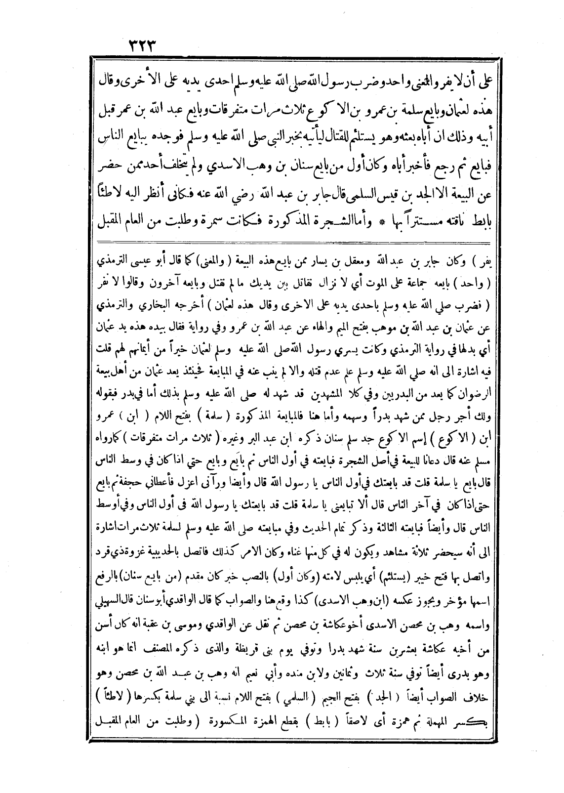على أن لا يفروا المعنى واحد وضرب رسول الله صلى الله عليه وسلم احدى يديه على الأخرى وقال هذه لعثمان وبايع سلمة بن عمرو بن الاكوع ثلاث مرات متفرقات وبايع عبد الله بن عمر قبل أبيه وذلك ان أباه بعثه وهو يستلئم للقتال ليأتيه بخبر النبى صلى الله عليه وسلم فوجده يبايع الناس فبايع ثم رجع فأخبر أباه وكان أوّل من بايع سنان بن وهب الاسدي ولم يتخلف أحد ممن حضر عن البيعة الا الجد بن قيس السلمى قال جابر بن عبد الله رضي الله عنه فكانى أنظر اليه لاطئا بابط ناقته مستترا بها* وأما الشجرة المذكورة فكانت سمرة وطلبت من العام المقبل يفر) وكان جابر بن عبد الله ومعقل بن يسار ممن بايع هذه البيعة (والمعنى) كما قال أبو عيسى الترمذي (واحد) بايعه جماعة على الموت أي لا نزال نقاتل بين يديك ما لم نقتل وبايعه آخرون وقالوا لا نفر (فضرب صلى الله عليه وسلم باحدى يديه على الاخرى وقال هذه لعثمان) أخرجه البخاري والترمذي عن عثمان بن عبد الله بن موهب بفتح الميم والهاء عن عبد الله بن عمرو وفي رواية فقال بيده هذه يد عثمان أي بدلها في رواية الترمذي وكانت يسري رسول الله صلى الله عليه وسلم لعثمان خيرا من أيمانهم لهم قلت فيه اشارة الى انه صلى الله عليه وسلم علم عدم قتله والا لم ينب عنه في المبايعة فحينئذ يعد عثمان من أهل بيعة الرضوان كما يعد من البدريين وفي كلا المشهدين قد شهد له صلى الله عليه وسلم بذلك أما في بدر فبقوله ولك أجر رجل ممن شهد بدرا وسهمه وأما هنا فالمبايعة المذكورة (سلمة) بفتح اللام (ابن) عمرو ابن (الاكوع) إسم الاكوع جد سلم سنان ذكره ابن عبد البر وغيره (ثلاث مرات متفرقات) كما رواه مسلم عنه قال دعانا للبيعة في أصل الشجرة فبايعته في أوّل الناس ثم بايع وبايع حتي اذا كان في وسط الناس قال بايع يا سلمة قلت قد بايعتك في أوّل الناس يا رسول الله قال وأيضا ورآني اعزل فأعطاني حجفة ثم بايع حتى اذا كان في آخر الناس قال ألا تبايعنى يا سلمة قلت قد بايعتك يا رسول الله في أوّل الناس وفي أوسط الناس قال وأيضا فبايعته الثالثة وذكر تمام الحديث وفي مبايعته صلى الله عليه وسلم لسلمة ثلاث مرات اشارة الى أنه سيحضر ثلاثة مشاهد ويكون له في كل منها غناء وكان الامر كذلك فاتصل بالحديبية غزوة ذي قرد واتصل بها فتح خيبر (يستلئم) أي يلبس لامته (وكان أوّل) بالنصب خبر كان مقدم (من بايع سنان) بالرفع اسمها مؤخر ويجوز عكسه (ابن وهب الاسدى) كذا وقع هنا والصواب كما قال الواقدي أبو سنان قال السهيلي واسمه وهب بن محصن الاسدى أخو عكاشة بن محصن ثم نقل عن الواقدي وموسى بن عقبة انه كان أسن من أخيه عكاشة بعشرين سنة شهد بدرا وتوفي يوم بنى قريظة والذى ذكره المصنف انما هو ابنه وهو بدرى أيضا توفي سنة ثلاث وثمانين ولابن منده وأبي نعيم انه وهب بن عبد الله بن محصن وهو خلاف الصواب أيضا (الجد) بفتح الجيم (السلمي) بفتح اللام نسبة الى بني سلمة بكسرها (لاطئا) بكسر المهملة ثم همزة أي لاصقا (بابط) بقطع الهمزة المكسورة (وطلبت من العام المقبل