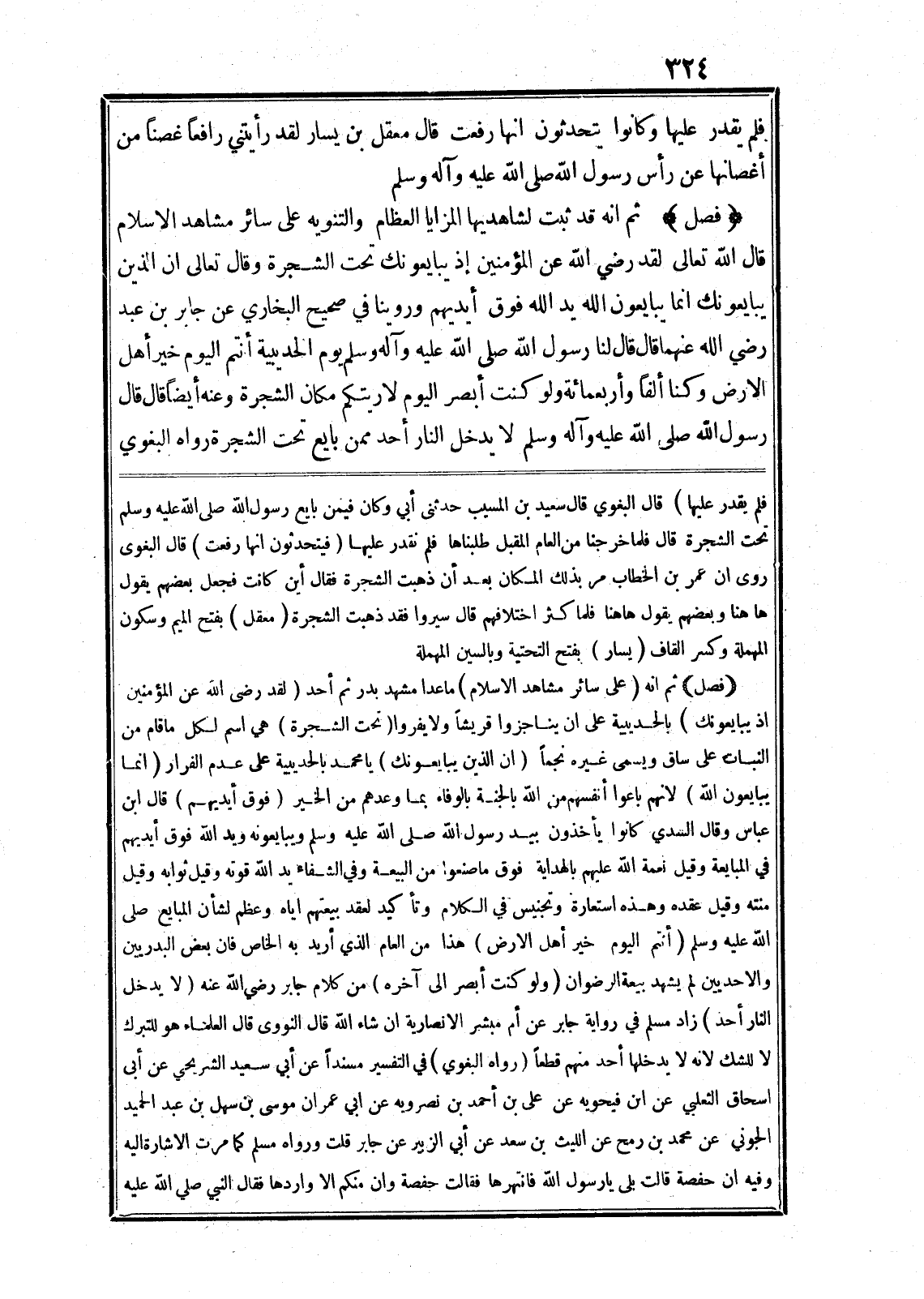 (فصل) ثم انه قد ثبت لشاهديها المزايا العظام والتنوية على سائر مشاهد الاسلام قال الله تعالى لَقَدْ رَضِيَ اللَّهُ عَنِ الْمُؤْمِنِينَ إِذْ يُبايِعُونَكَ تَحْتَ الشَّجَرَةِ وقال تعالى إِنَّ الَّذِينَ يُبايِعُونَكَ إِنَّما يُبايِعُونَ اللَّهَ يَدُ اللَّهِ فَوْقَ أَيْدِيهِمْ وروينا في صحيح البخاري عن جابر بن عبد رضي الله عنهما قال قال لنا رسول الله صلى الله عليه وآله وسلم يوم الحديبية أنتم اليوم خير أهل الارض وكنا ألفا وأربعمائة ولو كنت أبصر اليوم لاريتكم مكان الشجرة وعنه أيضا قال قال رسول الله صلى الله عليه وآله وسلم لا يدخل النار أحد ممن بايع تحت الشجرة رواه البغوي فلم يقدر عليها) قال البغوي قال سعيد بن المسيب حدثنى أبي وكان فيمن بايع رسول الله صلى الله عليه وسلم تحت الشجرة قال فلما خرجنا من العام المقبل طلبناها فلم نقدر عليها (فيتحدثون انها رفعت) قال البغوى روى ان عمر بن الخطاب مر بذلك المكان بعد أن ذهبت الشجرة فقال أين كانت فجعل بعضهم يقول هاهنا وبعضهم يقول هاهنا فلما كثر اختلافهم قال سيروا فقد ذهبت الشجرة (معقل) بفتح الميم وسكون المهملة وكسر القاف (يسار) بفتح التحتية وبالسين المهملة