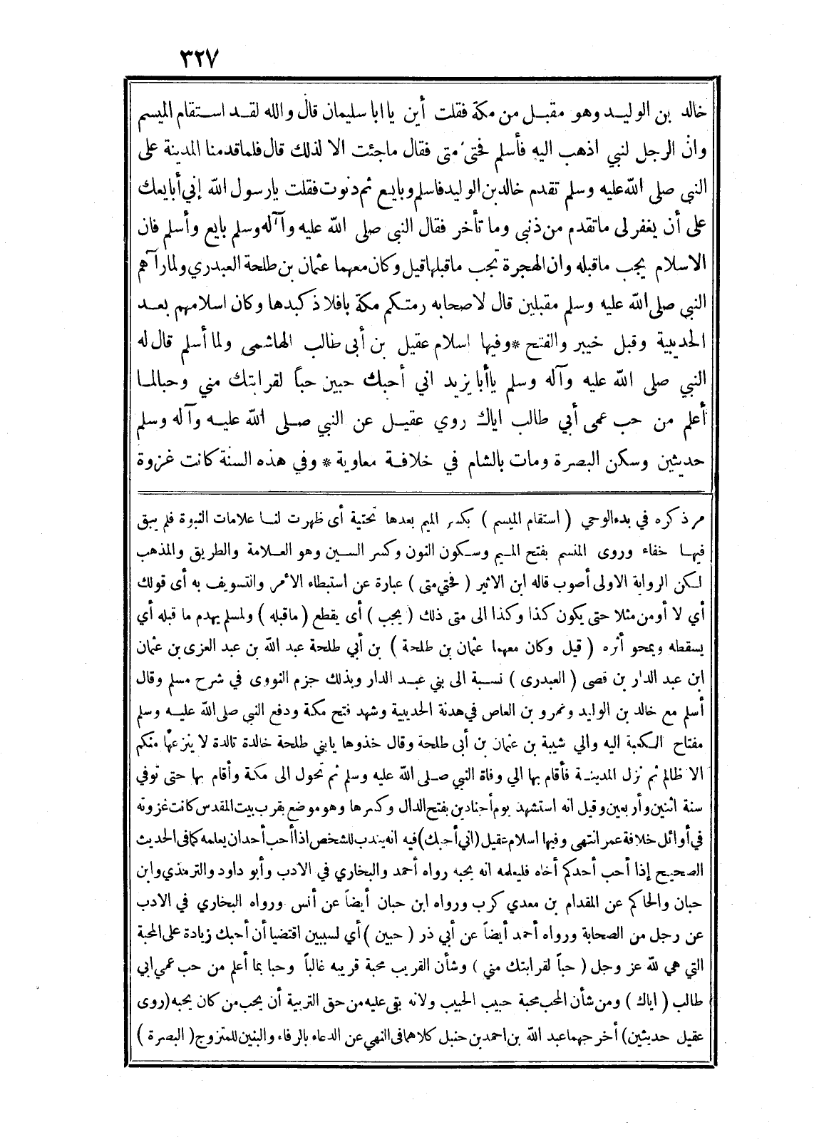 وفي هذه السنة كانت غزوة مر ذكره في بدء الوحي (استقام الميسم) بكسر الميم بعدها تحتية أى ظهرت لنا علامات النبوة فلم يبق فيها خفاء وروى المنسم بفتح الميم وسكون النون وكسر السين وهو العلامة والطريق والمذهب لكن الرواية الاولى أصوب قاله ابن الاثير (فحتي متى) عبارة عن استبطاء الأمر والتسويف به أى قولك أي لا أومن مثلا حتى يكون كذا وكذا الى متى ذلك (يجب) أى يقطع (ما قبله) ولمسلم يهدم ما قبله أي يسقطه ويمحو أثره (قيل وكان معهما عثمان بن طلحة) بن أبي طلحة عبد الله بن عبد العزى بن عثمان ابن عبد الدار بن قصى (العبدرى) نسبة الى بني عبد الدار وبذلك جزم النووى في شرح مسلم وقال أسلم مع خالد بن الوليد وعمرو بن العاص في هدنة الحديبية وشهد فتح مكة ودفع النبى صلى الله عليه وسلم مفتاح الكعبة اليه والي شيبة بن عثمان بن أبى طلحة وقال خذوها يا بني طلحة خالدة تالدة لا ينزعها منكم الا ظالم ثم نزل المدينة فأقام بها الي وفاة النبي صلى الله عليه وسلم ثم تحول الى مكة وأقام بها حتى توفي سنة اثنين وأربعين وقيل انه استشهد يوم أجنادين بفتح الدال وكسرها وهو موضع بقرب بيت المقدس كانت غزوته في أوائل خلافة عمر انتهى وفيها اسلام عقيل (اني أحبك) فيه انه يندب للشخص اذا أحب أحد ان يعلمه كما في الحديث الصحيح إذا أحب أحدكم أخاه فليعلمه انه يحبه رواه أحمد والبخاري في الادب وأبو داود والترمذي وابن حبان والحاكم عن المقدام بن معدي كرب ورواه ابن حبان أيضا عن أنس ورواه البخاري في الادب عن رجل من الصحابة ورواه أحمد أيضا عن أبي ذر (حبين) أي لسببين اقتضيا أن أحبك زيادة على المحبة التي هي لله عز وجل (حبا لقرابتك مني) وشأن القريب محبة قريبة غالبا وحبا بما أعلم من حب عمي ابي طالب (اياك) ومن شأن المحب محبة حبيب الحبيب ولانه بقى عليه من حق التربية أن يحب من كان يحبه (روى عقيل حديثين) أخرجهما عبد الله بن أحمد بن حنبل كلاهما في النهي عن الدعاء بالرفاء والبنين للمتزوج (البصرة)