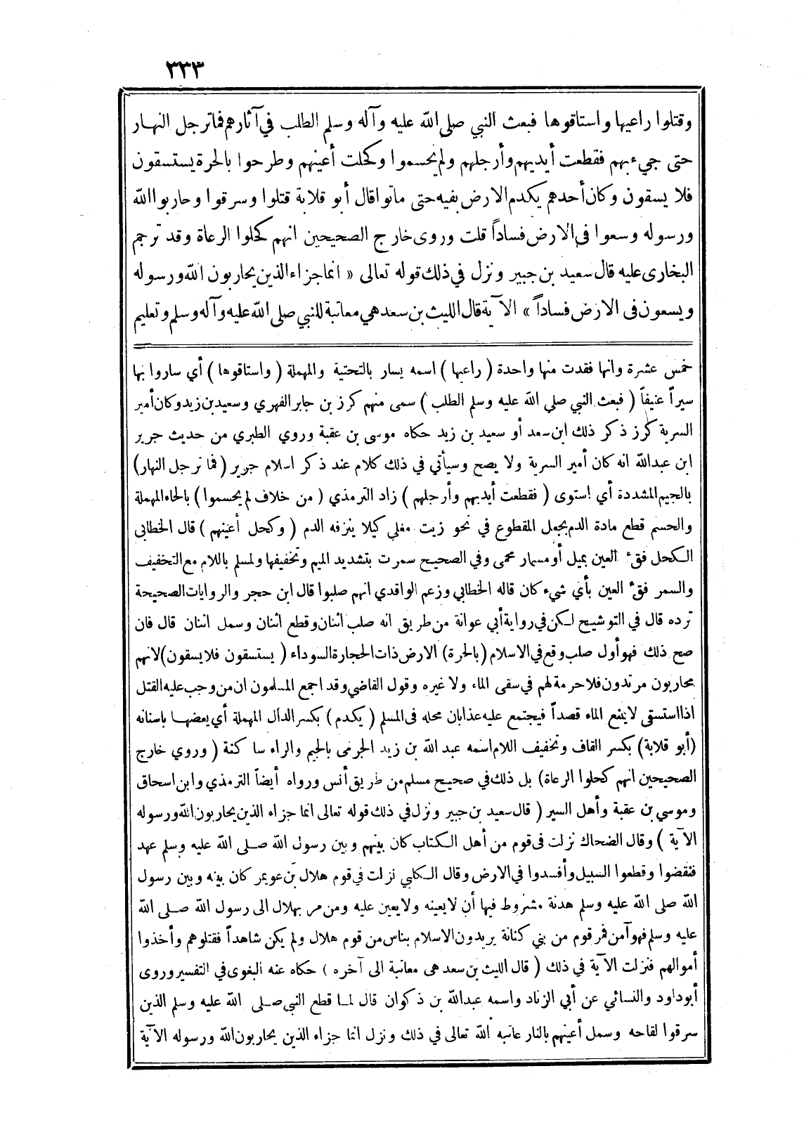 وقتلوا راعيها واستاقوها فبعث النبي صلى الله عليه وآله وسلم الطلب في آثارهم فما ترجل النهار حتى جيء بهم فقطعت أيديهم وأرجلهم ولم يحسموا وكحلت أعينهم وطرحوا بالحرة يستسقون فلا يسقون وكان أحدهم يكدم الارض بفيه حتى ماتوا قال أبو قلابة قتلوا وسرقوا وحاربوا الله ورسوله وسعوا في الارض فسادا قلت وروى خارج الصحيحين انهم كحلوا الرعاة وقد ترجم البخارى عليه قال سعيد بن جبير ونزل في ذلك قوله تعالى «إِنَّما جَزاءُ الَّذِينَ يُحارِبُونَ اللَّهَ وَرَسُولَهُ وَيَسْعَوْنَ فِي الْأَرْضِ فَساداً» الآية قال الليث بن سعد هي معاتبة للنبي صلى الله عليه وآله وسلم وتعليم خمس عشرة وانها فقدت منها واحدة (راعيها) اسمه يسار بالتحتية والمهملة (واستاقوها) أي ساروا بها سيرا عنيفا (فبعث النبي صلى الله عليه وسلم الطلب) سمى منهم كرز بن جابر الفهري وسعيد بن زيد وكان أمير السرية كرز ذكر ذلك ابن سعد أو سعيد بن زيد حكاه موسى بن عقبة وروي الطبري من حديث جرير ابن عبد الله انه كان أمير السرية ولا يصح وسيأتي في ذلك كلام عند ذكر اسلام جرير (فما ترجل النهار) بالجيم المشددة أي استوى (فقطعت أيديهم وأرجلهم) زاد الترمذي (من خلاف لم يحسموا) بالحاء المهملة والحسم قطع مادة الدم بجعل المقطوع في نحو زيت مغلى كيلا ينزفه الدم (وكحل أعينهم) قال الخطابى الكحل فقء العين بميل أو مسمار محمى وفي الصحيح سمرت بتشديد الميم وتخفيفها ولمسلم باللام مع التخفيف والسمر فقء العين بأي شيء كان قاله الخطابي وزعم الواقدي انهم صلبوا قال ابن حجر والروايات الصحيحة ترده قال في التوشيح لكن في رواية أبي عوانة من طريق انه صلب اثنان وقطع اثنان وسمل اثنان قال فان صح ذلك فهو أوّل صلب وقع في الاسلام (بالحرة) الارض ذات الحجارة السوداء (يستسقون فلا يسقون) لانهم محاربون مرتدون فلا حرمة لهم في سقى الماء ولا غيره وقول القاضي وقد اجمع المسلمون ان من وجب عليه القتل اذا استسقى لا يمنع الماء قصدا فيجتمع عليه عذابان محله في المسلم (يكدم) بكسر الدال المهملة أي يعضها باسنانه (أبو قلابة) بكسر القاف وتخفيف اللام اسمه عبد الله بن زيد الجرمى بالجيم والراء ساكنة (وروي خارج الصحيحين انهم كحلوا الرعاة) بل ذلك في صحيح مسلم من طريق أنس ورواه أيضا الترمذي وابن اسحاق وموسي بن عقبة وأهل السير (قال سعيد بن جبير ونزل في ذلك قوله تعالى إِنَّما جَزاءُ الَّذِينَ يُحارِبُونَ اللَّهَ وَرَسُولَهُ الآية) وقال الضحاك نزلت في قوم من أهل الكتاب كان بينهم وبين رسول الله صلى الله عليه وسلم عهد فنقضوا وقطعوا السبيل وأفسدوا في الارض وقال الكلبي نزلت في قوم هلال بن عويمر كان بينه وبين رسول الله صلى الله عليه وسلم هدنة مشروط فيها أن لا يعينه ولا يعين عليه ومن مر بهلال الى رسول الله صلى الله عليه وسلم فهو آمن فمر قوم من بني كنانة يريدون الاسلام بناس من قوم هلال ولم يكن شاهدا فقتلوهم وأخذوا أموالهم فنزلت الآية في ذلك (قال الليث بن سعد هى معاتبة الى آخره) حكاه عنه البغوى في التفسير وروى أبو داود والنسائي عن أبي الزناد واسمه عبد الله بن ذكوان قال لما قطع النبى صلى الله عليه وسلم الذين سرقوا لقاحه وسمل أعينهم بالنار عاتبه الله تعالى في ذلك ونزل إِنَّما جَزاءُ الَّذِينَ يُحارِبُونَ اللَّهَ وَرَسُولَهُ الآية