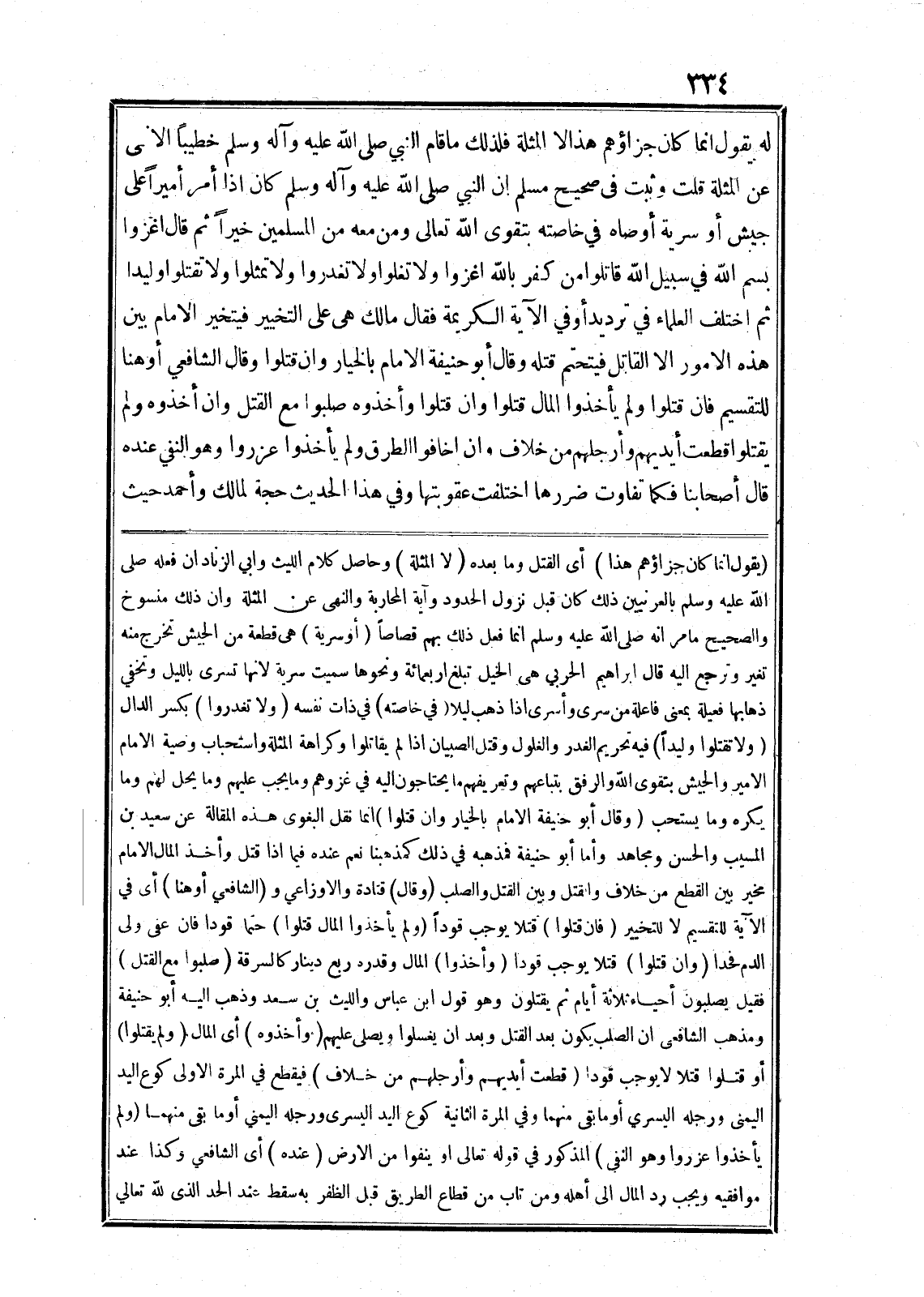 له يقول انما كان جزاؤهم هذا لا المثلة فلذلك ما قام النبي صلى الله عليه وآله وسلم خطيبا الا نهى عن المثلة قلت وثبت في صحيح مسلم ان النبي صلى الله عليه وآله وسلم كان اذا أمر أميرا على جيش أو سرية أوصاه في خاصته بتقوى الله تعالى ومن معه من المسلمين خيرا ثم قال اغزوا بسم الله في سبيل الله قاتلوا من كفر بالله اغزوا ولا تغلوا ولا تغدروا ولا تمثلوا ولا تقتلوا وليدا ثم اختلف العلماء في ترديد أو في الآية الكريمة فقال مالك هى على التخيير فيتخير الامام بين هذه الامور الا القاتل فيتحتم قتله وقال أبو حنيفة الامام بالخيار وان قتلوا وقال الشافعي أوهنا للتقسيم فان قتلوا ولم يأخذوا المال قتلوا وان قتلوا وأخذوه صلبوا مع القتل وان أخذوه ولم يقتلوا قطعت أيديهم وأرجلهم من خلاف وان اخافوا الطرق ولم يأخذوا عزروا وهو النفي عنده قال أصحابنا فكما تفاوت ضررها اختلفت عقوبتها وفي هذا الحديث حجة لمالك وأحمد حيث (يقول انما كان جزاؤهم هذا) أى القتل وما بعده (لا المثلة) وحاصل كلام الليث وابي الزناد ان فعله صلى الله عليه وسلم بالعرنيين ذلك كان قبل نزول الحدود وآية المحاربة والنهى عن المثلة وان ذلك منسوخ والصحيح ما مر انه صلى الله عليه وسلم انما فعل ذلك بهم قصاصا (أو سرية) هى قطعة من الجيش تخرج منه تغير وترجع اليه قال ابراهيم الحربي هى الخيل تبلغ اربعمائة ونحوها سميت سرية لانها تسرى بالليل وتخفي ذهابها فعلية بمعنى فاعلة من سرى وأسرى اذا ذهب ليلا (في خاصته) في ذات نفسه (ولا تغدروا) بكسر الدال (ولا تقتلوا وليدا) فيه تحريم الغدر والغلول وقتل الصبيان اذا لم يقاتلوا وكراهة المثلة واستحباب وصية الامام الامير والجيش بتقوى الله والرفق بتباعهم وتعريفهم ما يحتاجون اليه في غزوهم وما يجب عليهم وما يحل لهم وما يكره وما يستحب (وقال أبو حنيفة الامام بالخيار وان قتلوا) انما نقل البغوى هذه المقالة عن سعيد بن المسيب والحسن ومجاهد وأما أبو حنيفة فمذهبه في ذلك كمذهبنا نعم عنده فيما اذا قتل وأخذ المال الامام مخير بين القطع من خلاف والقتل وبين القتل والصلب (وقال) قتادة والاوزاعي و (الشافعي أوهنا) أى في الآية للتقسيم لا للتخيير (فان قتلوا) قتلا يوجب قودا (ولم يأخذوا المال قتلوا) حتما قودا فان عفى ولى الدم فحدا (وان قتلوا) قتلا يوجب قودا (وأخذوا) المال وقدره ربع دينار كالسرقة (صلبوا مع القتل) فقيل يصلبون أحياء ثلاثة أيام ثم يقتلون وهو قول ابن عباس والليث بن سعد وذهب اليه أبو حنيفة ومذهب الشافعى ان الصلب يكون بعد القتل وبعد ان يغسلوا ويصلى عليهم (وأخذوه) أى المال (ولم يقتلوا) أو قتلوا قتلا لا يوجب قودا (قطعت أيديهم وأرجلهم من خلاف) فيقطع في المرة الاولى كوع اليد اليمنى ورجله اليسري أو ما بقى منهما وفي المرة الثانية كوع اليد اليسرى ورجله اليمني أو ما بقى منهما (ولم يأخذوا عزروا وهو النفى) المذكور في قوله تعالى أَوْ يُنْفَوْا مِنَ الْأَرْضِ (عنده) أى الشافعي وكذا عند موافقيه ويجب رد المال الى أهله ومن تاب من قطاع الطريق قبل الظفر به سقط عند الحد الذى لله تعالى