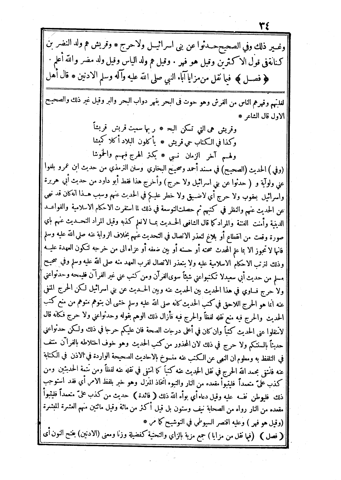 (وفي) الحديث (الصحيح) في مسند أحمد وصحيح البخاري وسنن الترمذي من حديث ابن عمرو بلغوا عني ولو آية و (حدثوا عن بني اسرائيل ولا حرج) وأخرج هذا فقط أبو داود من حديث أبي هريرة واسرائيل يعقوب ولا حرج أي لا ضيق ولا خطر عليكم في الحديث عنهم وسبب هذا انه كان قد نهى عن الحديث عنهم والنظر في كتبهم ثم حصلت التوسعة في ذلك لما استقرت الاحكام الاسلامية والقواعد الدينية وأمنت الفتنة والمراد كما قال الشافعي الحديث بما لا نعلم كذبه وقيل المراد التحديث عنهم باي صورة وقعت من انقطاع أو بلاغ لتعذر الاتصال في التحديث عنهم بخلاف الرواية عنه صلى الله عليه وسلم فانها لا تجوز الا بما علم المحدث صحته أو حسنه أو بين ضعفه أو عزاه الى من خرجه لتكون العهدة عليه وذلك لترتب الاحكام الاسلامية عليه ولا يتعذر الاتصال لقرب العهد منه صلى الله عليه وسلم وفي صحيح مسلم من حديث أبي سعيد لا تكتبوا عني شيئا سوى القرآن ومن كتب عني غير القرآن فليمحه وحدثوا عني ولا حرج فساوي في هذا الحديث بين الحديث عنه وبين الحديث عن بني اسرائيل لكن الحرج المنفي عنه انما هو الحرج اللاحق في كتب الحديث كانه صلى الله عليه وسلم خشى ان يتوهم متوهم من منع كتب الحديث والحرج فيه منع نقله لفظا والحرج فيه فأزال ذلك الوهم بقوله وحدثوا عني ولا حرج فكانه قال لا تنقلوا عنى الحديث كتبا وان كان في أعلى درجات الصحة فان عليكم حرجا في ذلك ولكن حدثوا عني حديثا بالسنتكم ولا حرج في ذلك لان المحذور من كتب الحديث وهو خوف اختلاطه بالقرآن منتف في التلفظ به ومعلوم ان النهى عن الكتب عنه منسوخ بالاحاديث الصحيحة الواردة في الاذن في الكتابة عنه فانتفى بحمد الله الحرج في نقل الحديث عنه كتبا كما انتفى في نقله عنه لفظا ومن تتمة الحديثين ومن كذب علىّ متعمدا فليتبوأ مقعده من النار والتبوء اتخاذ المنزل وهو خبر بلفظ الامر أي فقد استوجب ذلك فليوطن نفسه عليه وقيل دعاء أي بوأه الله ذلك (فائدة) حديث من كذب علىّ متعمدا فليتبوأ مقعده من النار رواه من الصحابة نيف وستون بل قيل أكثر من مائة وقيل مائتين منهم العشرة المبشرة (وقيل هو فهر) وعليه اقتصر السيوطي في التوشيح كما مر*