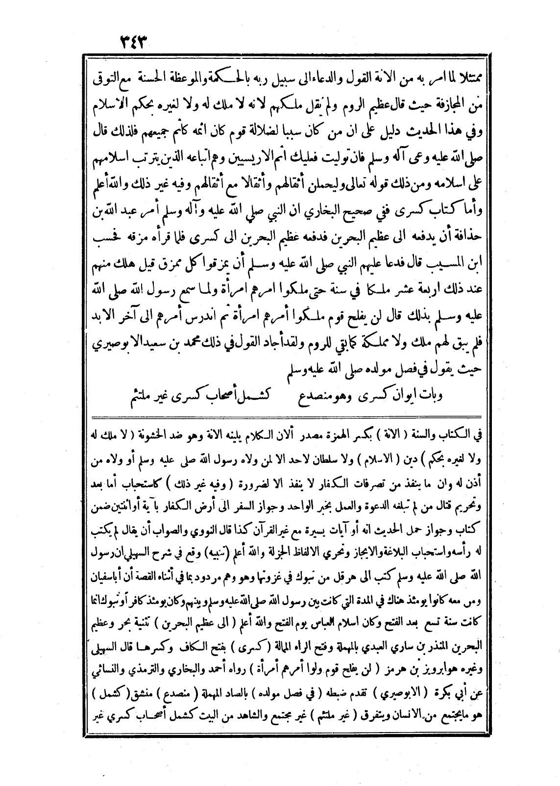 في الكتاب والسنة (الانة) بكسر الهمزة مصدر ألان الكلام يلينه الانة وهو ضد الخشونة (لا ملك له ولا لغيره بحكم) دين (الاسلام) ولا سلطان لاحد الا لمن ولاه رسول الله صلى الله عليه وسلم أو ولاه من أذن له وان ما ينفذ من تصرفات الكفار لا ينفذ الا لضرورة (وفيه غير ذلك) كاستحباب أما بعد وتحريم قتال من لم تبلغه الدعوة والعمل بخبر الواحد وجواز السفر الى أرض الكفار بآية أو اثنتين ضمن كتاب وجواز حمل الحديث انه أو آيات يسيرة مع غير القرآن كذا قال النووي والصواب أن يقال لم يكتب له رأسه واستحباب البلاغة والايجاز وتحري الالفاظ الجزلة والله أعلم (تنبيه) وقع في شرح السهيلي ان رسول الله صلى الله عليه وسلم كتب الى هرقل من تبوك في غزوتها وهو وهم مردود بما في أثناء القصة أن أبا سفيان ومن معه كانوا يومئذ هناك في المدة التي كانت بين رسول الله صلى الله عليه وسلم وبينهم وكان يومئذ كافرا وتبوك انما كانت سنة تسع بعد الفتح وكان اسلام العباس يوم الفتح والله أعلم (الى عظيم البحرين) تثنية بحر وعظيم البحرين المنذر بن ساري العبدي بالمهملة وفتح الراء الممالة (كسرى) بفتح الكاف وكسرها قال السهيلى وغيره هوا برويز بن هرمز (لن يفلح قوم ولوا أمرهم أمرأة) رواه أحمد والبخاري والترمذي والنسائي عن أبي بكرة (الابوصيري) تقدم ضبطه (في فصل مولده) بالصاد المهملة (منصدع) منشق (كشمل) هو ما يجتمع من الانسان ويتفرق (غير ملتئم) غير مجتمع والشاهد من البيت كشمل أصحاب كسري غير