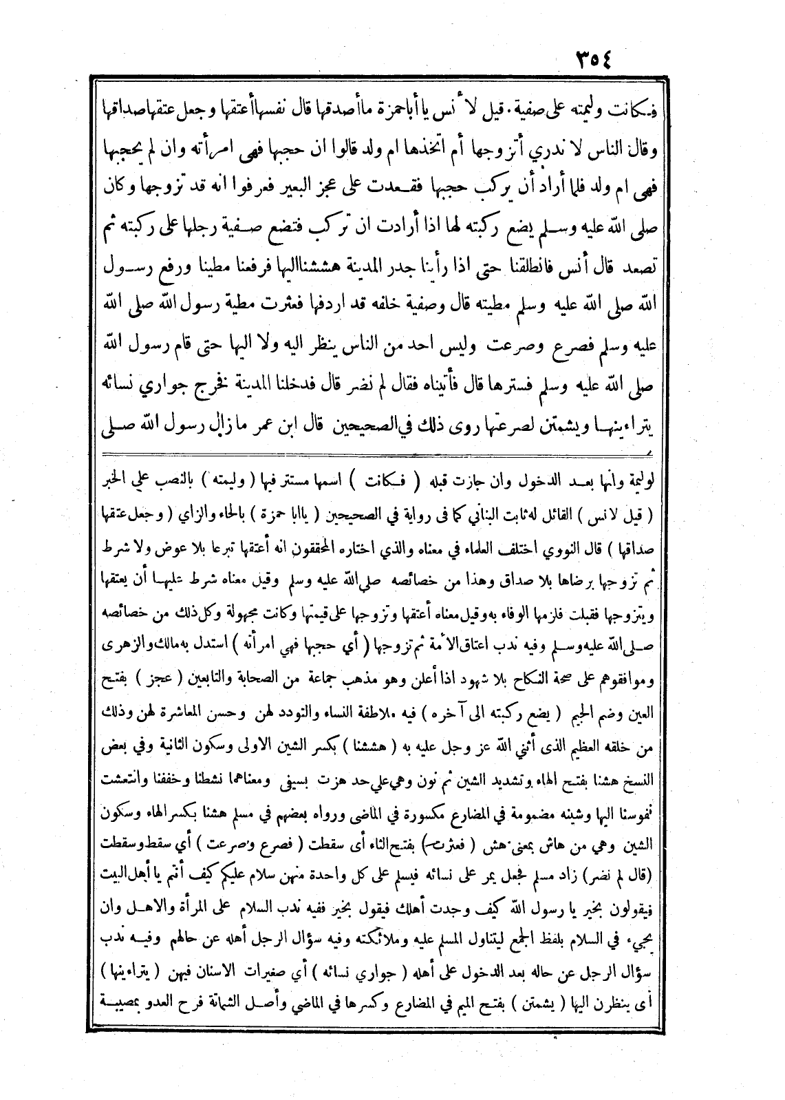 فكانت وليمته على صفية. قيل لأنس يا أبا حمزة ما أصدقها قال نفسها أعتقها وجعل عتقها صداقها وقال الناس لا ندري أتزوجها أم اتخذها ام ولد قالوا ان حجبها فهى امرأته وان لم يحجبها فهى ام ولد فلما أراد أن يركب حجبها فقعدت على عجز البعير فعرفوا انه قد تزوجها وكان صلى الله عليه وسلم يضع ركبته لها اذا أرادت ان تركب فتضع صفية رجلها على ركبته ثم تصعد قال أنس فانطلقنا حتى اذا رأينا جدر المدينة هششنا اليها فرفعنا مطينا ورفع رسول الله صلى الله عليه وسلم مطيته قال وصفية خلفه قد اردفها فعثرت مطية رسول الله صلى الله عليه وسلم فصرع وصرعت وليس احد من الناس ينظر اليه ولا اليها حتى قام رسول الله صلى الله عليه وسلم فسترها قال فأتيناه فقال لم نضر قال فدخلنا المدينة فخرج جواري نسائه يتراءينها ويشمتن لصرعتها روى ذلك في الصحيحين قال ابن عمر ما زال رسول الله صلى لوليمة وانها بعد الدخول وان جازت قبله (فكانت) اسمها مستتر فيها (وليمته) بالنصب على الخبر (قيل لانس) القائل له ثابت البناني كما في رواية في الصحيحين (يا ابا حمزة) بالحاء والزاي (وجعل عتقها صداقها) قال النووي اختلف العلماء في معناه والذي اختاره المحققون انه أعتقها تبرعا بلا عوض ولا شرط ثم تزوجها برضاها بلا صداق وهذا من خصائصه صلى الله عليه وسلم وقيل معناه شرط عليها أن يعتقها ويتزوجها فقبلت فلزمها الوفاء به وقيل معناه أعتقها وتزوجها على قيمتها وكانت مجهولة وكل ذلك من خصائصه صلى الله عليه وسلم وفيه ندب اعتاق الأمة ثم تزوجها (أي حجبها فهي امرأته) استدل به مالك والزهرى وموافقوهم على صحة النكاح بلا شهود اذا أعلن وهو مذهب جماعة من الصحابة والتابعين (عجز) بفتح العين وضم الجيم (يضع ركبته الى آخره) فيه ملاطفة النساء والتودد لهن وحسن المعاشرة لهن وذلك من خلقه العظيم الذى أثني الله عز وجل عليه به (هششنا) بكسر الشين الاولى وسكون الثانية وفي بعض النسخ هشنا بفتح الهاء وتشديد الشين ثم نون وهي علي حد هزت بسيفى ومعناهما نشطنا وخففنا وانتعشت نفوسنا اليها وشينه مضمومة في المضارع مكسورة في الماضى ورواه بعضهم في مسلم هشنا بكسر الهاء وسكون الشين وهي من هاش بمعنى هش (فعثرت) بفتح الثاء أى سقطت (فصرع وصرعت) أي سقط وسقطت (قال لم نضر) زاد مسلم فجعل يمر على نسائه فيسلم على كل واحدة منهن سلام عليكم كيف أنتم يا أهل البيت فيقولون بخير يا رسول الله كيف وجدت أهلك فيقول بخير ففيه ندب السلام على المرأة والاهل وان يجيء في السلام بلفظ الجمع ليتناول المسلم عليه وملائكته وفيه سؤال الرجل أهله عن حالهم وفيه ندب سؤال الرجل عن حاله بعد الدخول على أهله (جواري نسائه) أي صغيرات الاسنان فيهن (يتراءينها) أى ينظرن اليها (يشمتن) بفتح الميم في المضارع وكسرها في الماضي وأصل الشماتة فرح العدو بمصيبة