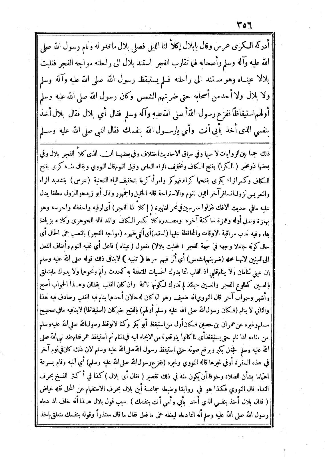 أدركه الكرى عرس وقال يا بلال إكلأ لنا الليل فصلى بلال ما قدر له ونام رسول الله صلى الله عليه وآله وسلم وأصحابه فلما تقارب الفجر استند بلال الى راحلته مواجه الفجر فغلبت بلالا عيناه وهو مستند الى راحلته فلم يستيقظ رسول الله صلى الله عليه وآله وسلم ولا بلال ولا أحد من أصحابه حتى ضربتهم الشمس وكان رسول الله صلى الله عليه وسلم أولهم استيقاظا ففزع رسول الله صلى الله عليه وآله وسلم فقال أي بلال فقال بلال أخذ بنفسي الذى أخذ بأبى أنت وأمي يا رسول الله بنفسك فقال النبى صلى الله عليه وسلم ذلك جمعا بين الروايات لا سيما وفي سياق الاحاديث اختلاف وفي بعضها ان الذى كلأ الفجر بلال وفي بعضها ذو مخبر (الكرا) بفتح الكاف وتخفيف الراء النعاس وقيل النوم قال النووي ويقال منه كرى بفتح الكاف وكسر الراء يكرى بفتحها كراء فهو كر وامرأة كرية بتخفيف الياء التحتية (عرس) بتشديد الراء والتعريس نزول المسافر آخر الليل للنوم والاستراحة قاله الخليل والجمهور وقال أبو زيد هو النزول مطلقا يدل عليه ما في حديث الافك فنزلوا معرسين في نحر الظهيرة (إكلأ لنا الفجر) أى ارقبه واحفظه واحرسه وهو بهمزة وصل أوله وهمزة ساكنة آخره ومصدره كلأ بكسر الكاف والمد قاله الجوهرى وكلاه بزيادة هاء وفيه ندب مراقبة الاوقات والمحافظة عليها (استند) أى ألقى ظهره (مواجه الفجر) بالنصب على الحال أى حال كونه جاعلا وجهه في جهة الفجر (فغلبت بلالا) مفعول (عيناه) فاعل أي غلبه النوم وأضاف الفعل الى العينين لانهما محله (ضربتهم الشمس) أي أثر فيهم حرها (تنبيه) لا ينافى ذلك قوله صلى الله عليه وسلم ان عيني تنامان ولا ينام قلبي اذ القلب انما يدرك الحسيات المتعلقة به كحدث وألم ونحوهما ولا يدرك ما يتعلق بالعين كطلوع الفجر والعين حينئذ لم تدرك لكونها نائمة وان كان القلب يقظان وهذا الجواب أصح وأشهر وجواب آخر قال النووي انه ضعيف وهو انه كان له حالان أحدهما ينام فيه القلب وصادف فيه هذا والثاني لا ينام (فكان رسول الله صلى الله عليه وسلم أولهم) بالفتح خبر كان (استيقاظا) لا ينافيه ما في صحيح مسلم وغيره عن عمران بن حصين فكان أوّل من استيقظ أبو بكر وكنا لا نوقظ رسول الله صلى الله عليه وسلم من منامه اذا نام حتى يستيقظ أى لما كانوا يتوقعونه من الايحاء اليه في المنام ثم استيقظ عمر فقام عند نبى الله صلى الله عليه وسلم فجعل يكبر ويرفع صوته حتي استيقظ رسول الله صلى الله عليه وسلم لان ذلك كان في نوم آخر في هذه السفرة أو في غيرها قاله النووي وغيره (ففزع رسول الله صلى الله عليه وسلم) أي انتبه وقام بسرعة اهتماما بشأن الصلاة وخوفا أن يكون منه في ذلك تقصير (فقال أي بلال) كذا في أكثر النسخ بحرف النداء قال النووي فكذا هو في روايتنا وضبطه جماعة أين بلال بحرف الاستفهام عن المحل نقله عياض (فقال بلال أخذ بنفسي الذي أخذ بأبي وأمي أنت بنفسك) سبب قول بلال هذا أنه خاف اذ دعاه رسول الله صلى الله عليه وسلم أنه انما دعاه ليعنفه على ما فعل فقال ما قال معتذرا وقوله بنفسك متعلق باخذ