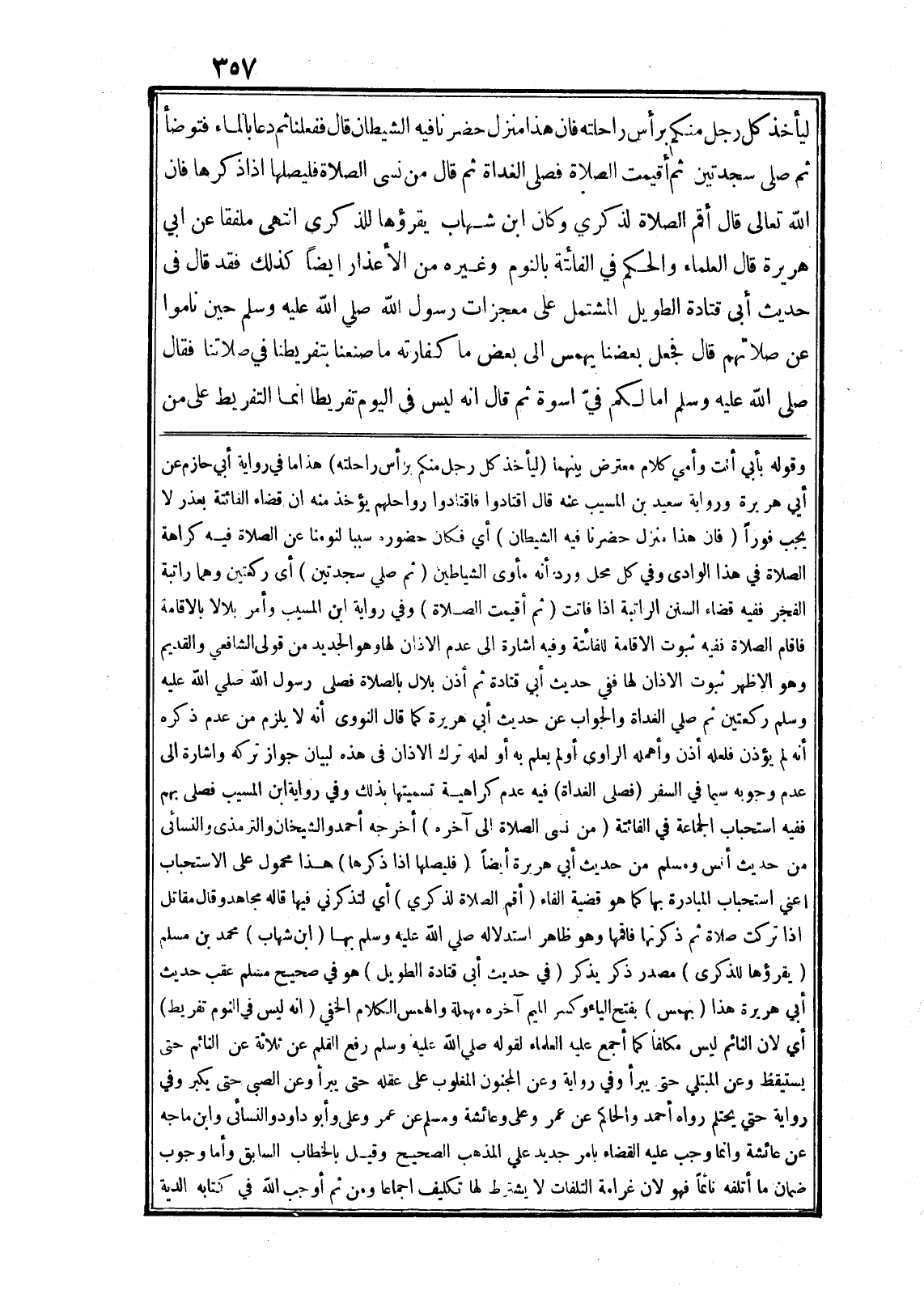 ليأخذ كل رجل منكم برأس راحلته فان هذا منزل حضرنا فيه الشيطان قال ففعلنا ثم دعا بالماء فتوضأ ثم صلى سجدتين ثم أقيمت الصلاة فصلى الغداة ثم قال من نسى الصلاة فليصلها اذا ذكرها فان الله تعالى قال أَقِمِ الصَّلاةَ لِذِكْرِي وكان ابن شهاب يقرؤها للذكرى انتهى ملفقا عن ابي هريرة قال العلماء والحكم في الفائتة بالنوم وغيره من الأعذار ايضا كذلك فقد قال في حديث أبى قتادة الطويل المشتمل على معجزات رسول الله صلى الله عليه وسلم حين ناموا عن صلاتهم قال فجعل بعضنا يهمس الى بعض ما كفارته ما صنعنا بتفريطنا في صلاتنا فقال صلى الله عليه وسلم اما لكم فيّ اسوة ثم قال انه ليس في اليوم تفريطا انما التفريط على من وقوله بأبي أنت وأمي كلام معترض بينهما (ليأخذ كل رجل منكم برأس راحلته) هذا ما في رواية أبي حازم عن أبي هريرة ورواية سعيد بن المسيب عنه قال اقتادوا فاقتادوا رواحلهم يؤخذ منه ان قضاء الفائتة بعذر لا يجب فورا (فان هذا منزل حضرنا فيه الشيطان) أي فكان حضوره سببا لنومنا عن الصلاة فيه كراهة الصلاة في هذا الوادى وفي كل محل ورد أنه مأوى الشياطين (ثم صلى سجدتين) أى ركعتين وهما راتبة الفجر ففيه قضاء السنن الراتبة اذا فاتت (ثم أقيمت الصلاة) وفي رواية ابن المسيب وأمر بلالا بالاقامة فاقام الصلاة ففيه ثبوت الاقامة للفائتة وفيه اشارة الى عدم الاذان لها وهو الجديد من قولى الشافعي والقديم وهو الاظهر ثبوت الاذان لها ففي حديث أبي قتادة ثم أذن بلال بالصلاة فصلى رسول الله صلى الله عليه وسلم ركعتين ثم صلى الغداة والجواب عن حديث أبي هريرة كما قال النووى أنه لا يلزم من عدم ذكره أنه لم يؤذن فلعله أذن وأهمله الراوى أو لم يعلم به أو لعله ترك الاذان في هذه لبيان جواز تركه واشارة الى عدم وجوبه سيما في السفر (فصلى الغداة) فيه عدم كراهية تسميتها بذلك وفي رواية ابن المسيب فصلى بهم ففيه استحباب الجماعة في الفائتة (من نسى الصلاة الى آخره) أخرجه أحمد والشيخان والترمذى والنسائى من حديث أنس ومسلم من حديث أبي هريرة أيضا (فليصلها اذا ذكرها) هذا محمول على الاستحباب اعني استحباب المبادرة بها كما هو قضية الفاء (أقم الصلاة لذكري) أي لتذكرني فيها قاله مجاهد وقال مقاتل اذا تركت صلاة ثم ذكرتها فاقمها وهو ظاهر استدلاله صلى الله عليه وسلم بها (ابن شهاب) محمد بن مسلم (يقرؤها للذكرى) مصدر ذكر يذكر (في حديث أبى قتادة الطويل) هو في صحيح مسلم عقب حديث أبي هريرة هذا (بهمس) بفتح الياء وكسر الميم آخره مهملة والهمس الكلام الخفي (انه ليس في النوم تفريط) أي لان النائم ليس مكلفا كما أجمع عليه العلماء لقوله صلى الله عليه وسلم رفع القلم عن ثلاثة عن النائم حتى يستيقظ وعن المبتلي حتى يبرأ وفي رواية وعن المجنون المغلوب على عقله حتى يبرأ وعن الصبى حتى يكبر وفي رواية حتي يحتلم رواه أحمد والحاكم عن عمر وعلى وعائشة ومسلم عن عمر وعلى وأبو داود والنسائى وابن ماجه عن عائشة وانما وجب عليه القضاء بامر جديد علي المذهب الصحيح وقيل بالخطاب السابق وأما وجوب ضمان ما أتلفه نائما فهو لان غرامة التلفات لا يشترط لها تكليف اجماعا ومن ثم أوجب الله في كتابه الدية