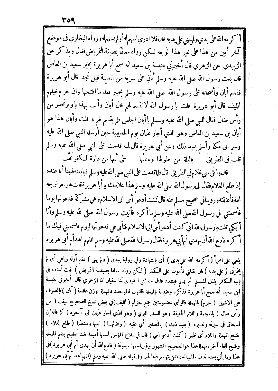 قال وابق مني غلام في الطريق قال فلما قدمت على النبى صلى الله عليه وسلم فبايعته فبينا أنا عنده إذ طلع الغلام فقال لى رسول الله صلى الله عليه وسلم هذا غلامك يا أبا هريرة قلت هو حر لوجه الله فأعتقته وروينا في صحيح مسلم عنه قال كنت أدعو أمي الى الاسلام وهي مشركة فدعوتها يوما فأسمعتني في رسول الله صلى الله عليه وسلم ما أكره فأتيت رسول الله صلى الله عليه وسلم وأنا أبكي قلت يا رسول الله اني كنت أدعو أمي الى الاسلام فتأبى علي فدعوتها اليوم فاسمعتني فيك ما أكره فادع الله أن يهدي أم أبي هريرة فقال رسول الله صلى الله عليه وسلم اللهم اهدأم أبى هريرة ينعي على امرأ (أكرمه الله علي يدى) أى بالشهادة وفي رواية بيدي (ولم يهنى) بضم أوله رباعي أي لم يخزني (علي يديه) بان يقتلني فأموت على الكفر (لكن رواه معلقا بصيغة التمريض) قلت أسنده في باب الكافر يقتل المسلم ثم يسلم فيشدد فقال حدثنى الحميدي ثنا سفيان ثنا الزهري قال أخبرني عنبسة ابن سعيد أنه سمع أبا هريرة فذكره وعنبسة بالمهملة فالنون فالموحدة فالمهملة بوزن علقمة (أبان) بالصرف على الاشهر (حزم) بالمهملة فالزاي مضمومتين جمع حزام (الليف) في بعض نسخ الصحيح لليف (من رأس ضال) بالمعجمة واللام الخفيفة وهو السدر البري (وهو الذي اجار عثمان الى آخره) كما قاله ابن اسحاق في سيرته وغيره (بعيد ذلك) بالتصغير أي عقبه (وعنائها) تعبها ومشقتها (طلع الغلام) بفتح المهملة واللام أى ظهر (كنت أدعو امي) قال في سلاح المؤمن اسمها أميمة بنت صفيح بضم المهملة وفتح الفاء آخره مهملة هذا هو الصحيح المشهور وقيل اسمها ميمونة (فادع الله أن يهدى أم أبي هريرة) في هذا وما يأتي بعده ندب طلب الدعاء ممن يتوسم فيه الخير وفي قوله صلى الله عليه وسلم (اللهم اهد أم أبى هريرة)