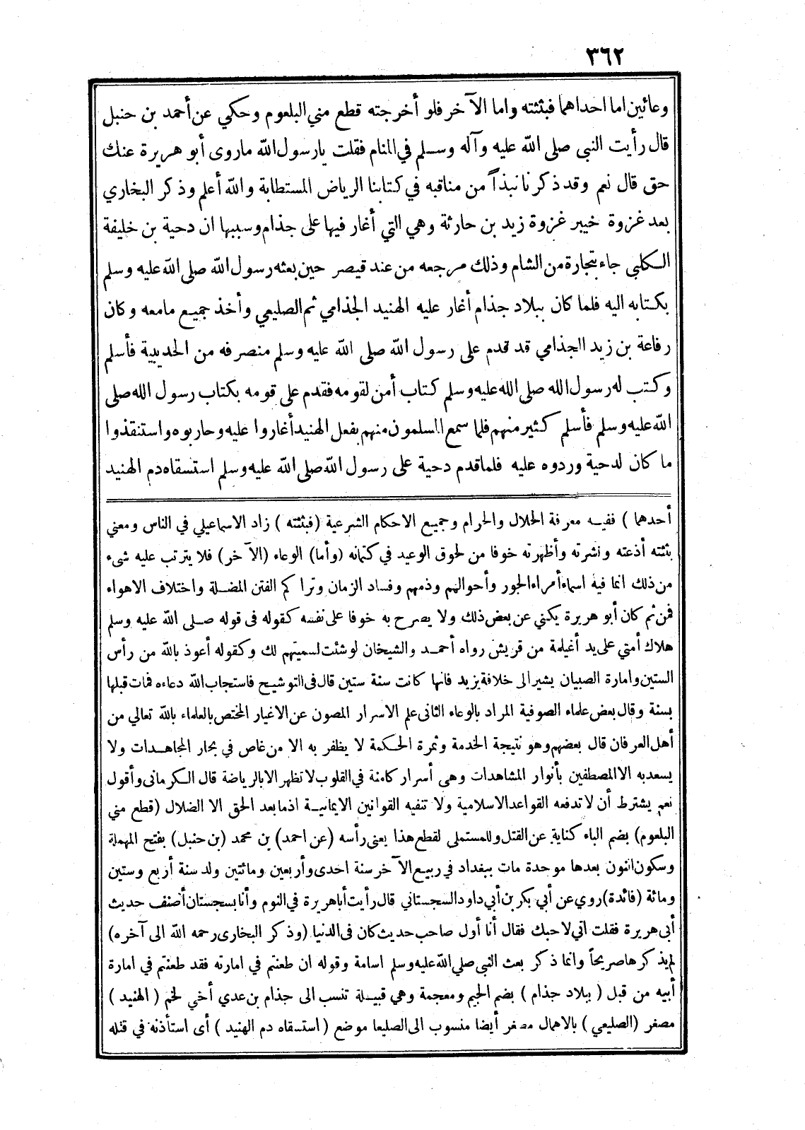 وذكر البخاري بعد غزوة خيبر غزوة زيد بن حارثة وهي التي أغار فيها على جذام وسببها ان دحية بن خليفة الكلبى جاء بتجارة من الشام وذلك مرجعه من عند قيصر حين بعثه رسول الله صلى الله عليه وسلم بكتابه اليه فلما كان ببلاد جذام أغار عليه الهنيد الجذامي ثم الصليعي وأخذ جميع ما معه وكان رفاعة بن زيد الجذامي قد قدم على رسول الله صلى الله عليه وسلم منصرفه من الحديبية فأسلم وكتب له رسول الله صلى الله عليه وسلم كتاب أمن لقومه فقدم على قومه بكتاب رسول الله صلى الله عليه وسلم فأسلم كثير منهم فلما سمع المسلمون منهم بفعل الهنيد أغاروا عليه وحاربوه واستنقذوا ما كان لدحية وردوه عليه فلما قدم دحية على رسول الله صلى الله عليه وسلم استسقاه دم الهنيد أحدهما) ففيه معرفة الحلال والحرام وجميع الاحكام الشرعية (فبثثته) زاد الاسماعيلي في الناس ومعنى بثثته أذعته ونشرته وأظهرته خوفا من لحوق الوعيد في كتمانه (وأما) الوعاء (الآخر) فلا يترتب عليه شيء من ذلك انما فيه اسماء أمراء الجور وأحوالهم وذمهم وفساد الزمان وتراكم الفتن المضلة واختلاف الاهواء فمن ثم كان أبو هريرة يكني عن بعض ذلك ولا يصرح به خوفا على نفسه كقوله في قوله صلى الله عليه وسلم هلاك أمتي على يد أغيلمة من قريش رواه أحمد والشيخان لو شئت لسميتهم لك وكقوله أعوذ بالله من رأس الستين وامارة الصبيان يشير الى خلافة يزيد فانها كانت سنة ستين قال في التوشيح فاستجاب الله دعاءه فمات قبلها بسنة وقال بعض علماء الصوفية المراد بالوعاء الثانى علم الاسرار المصون عن الاغيار المختص بالعلماء بالله تعالى من أهل العرفان قال بعضهم وهو نتيجة الخدمة وثمرة الحكمة لا يظفر به الا من غاص في بحار المجاهدات ولا يسعد به الا المصطفين بأنوار المشاهدات وهى أسرار كامنة في القلوب لا تظهر الا بالرياضة قال الكرمانى وأقول نعم يشترط أن لا تدفعه القواعد الاسلامية ولا تنفيه القوانين الايمانية اذ ما بعد الحق الا الضلال (قطع مني البلعوم) بضم الباء كناية عن القتل وللمستملى لقطع هذا يعنى رأسه (عن احمد) بن محمد (بن حنبل) بفتح المهملة وسكون النون بعدها موحدة مات ببغداد في ربيع الآخر سنة احدى وأربعين ومائتين ولد سنة أربع وستين ومائة (فائدة) روي عن أبي بكر بن أبي داود السجستاني قال رأيت أبا هريرة في النوم وأنا بسجستان أصنف حديث أبى هريرة فقلت اني لاحبك فقال أنا أوّل صاحب حديث كان في الدنيا (وذكر البخارى رحمه الله الى آخره) لم يذكرها صريحا وانما ذكر بعث النبى صلى الله عليه وسلم اسامة وقوله ان طعنتم في امارته فقد طعنتم في امارة أبيه من قبل (ببلاد جذام) بضم الجيم ومعجمة وهي قبيلة تنسب الى جذام بن عدي أخي لخم (الهنيد) مصغر (الصليعي) بالاهمال مصغر أيضا منسوب الى الصليعا موضع (استسقاه دم الهنيد) أى استأذنه في قتله