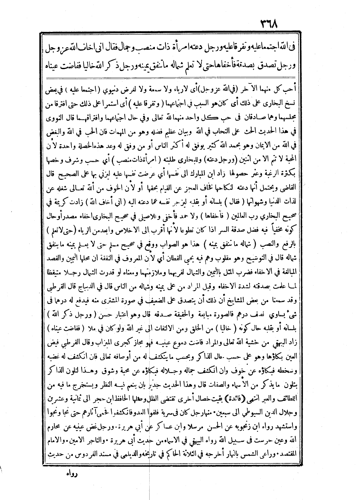 فى الله اجتمعا عليه وتفرقا عليه ورجل دعته امرأة ذات منصب وجمال فقال انى اخاف الله عز وجل ورجل تصدق بصدقة فأخفاها حتى لا تعلم شماله ما تنفق يمينه ورجل ذكر الله خاليا ففاضت عيناه أحب كل منهما الآخر (في الله عز وجل) أى لارياء ولا سمعة ولا لغرض دنيوي (اجتمعا عليه) في بعض نسخ البخارى على ذلك أى كان هو السبب في اجتماعهما (وتفرقا عليه) أى استمرا على ذلك حتى افترقا من مجلسهما وهما صادقان في حب كل واحد منهما لله تعالى وفي حال اجتماعهما وافتراقهما قال النووى في هذا الحديث الحث على التحاب في الله وبيان عظيم فضله وهو من المهمات فان الحب في الله والبغض في الله من الايمان وهو بحمد الله كثير يوفق له أكثر الناس أو من وفق له وعد هذه الخصلة واحدة لأن المحبة لا تتم الا من اثنين (ورجل دعته) وللبخارى طلبته (امرأة ذات منصب) أي حسب وشرف وخصها بكثرة الرغبة وعثر حصولها زاد ابن المبارك الى نفسها أي عرضت نفسها عليه ليزني بها على الصحيح قال القاضى ويحتمل أنها دعته لنكاحها فخاف العجز عن القيام بحقها أو لأن الخوف من ألله تعالى شغله عن لذات الدنيا وشهواتها (فقال) بلسانه أو بقلبه ليزجر نفسه عما دعته اليه (اني أخاف الله) زادت كريمة في صحيح البخاري رب العالمين (فأخفاها) ولا حمد فأخفى وللاصيلى في صحيح البخارى اخفاء مصدر أو حال كونه مخفيا فيه فضل صدقة السر اذا كان تطوعا لأنها أقرب الى الاخلاص وابعد من الرياء (حتى لا تعلم) بالرفع والنصب (شماله ما تنفق يمينه) هذا هو الصواب ووقع في صحيح مسلم حتى لا يعلم يمينه ما ينفق شماله قال في التوشيح وهو مقلوب وهم فيه يحيى القطان أي لأن المعروف في النفقة ان محلها اليمين والقصد المبالغة في الاخفاء فضرب المثل باليمين والشمال لقربهما وملازمتهما ومعناه لو قدرت الشمال رجلا متيقظا لما علمت بصدقته لشدة الاخفاء وقيل المراد من على يمينه وشماله من الناس قال في الديباج قال القرطبى وقد سمعنا من بعض المشايخ أن ذلك أن يتصدق على الضعيف في صورة المشترى منه فيدفع له درهما في شىء يساوي نصف درهم فالصورة مبايعة والحقيقة صدقه قال وهو اعتبار حسن (ورجل ذكر الله) بلسانه أو بقلبه حال كونه (خاليا) من الخلق ومن الالتفات الى غير الله ولو كان في ملا (ففاضت عيناه) زاد البيهقي من خشية الله تعالى والمراد فاضت دموع عينيه فهو مجاز كجرى الميزاب وقال القرطبي فيض العين بكاؤها وهو على حسب حال الذاكر وبحسب ما ينكشف له من أوصافه تعالى فان انكشف له غضبه وسخطه فبكاؤه عن خوف وان انكشف جماله وجلاله فبكاؤه عن محبة وشوق وهذا لتلون الذاكر بتلون ما يذكر من الأسماء والصفات قال وهذا الحديث جدير بان ينعم فيه النظر ويستخرج ما فيه من اللطائف والعبر انتهى (فائدة) بقيت خصال أخرى تقتضى الظل وصلها الحافظ ابن حجر الى ثمانية وعشرين وجلال الدين السيوطي الى سبعين منها رجل كان في سرية فلفوا العدو فانكشفوا فحمى آثارهم حتى نجا ونجوا واستشهد رواه ابن زنجويه عن الحسن مرسلا وابن عساكر عن أبي هريرة. ورجل غض عينيه عن محارم الله وعين حرست في سبيل الله رواه البيهقي في الاسماء من حديث أبى هريرة والتاجر الامين. والامام المقتصد. وراعى الشمس بالنهار أخرجه في الثلاثة الحاكم في تاريخه والديلمى في مسند الفردوس من حديث
