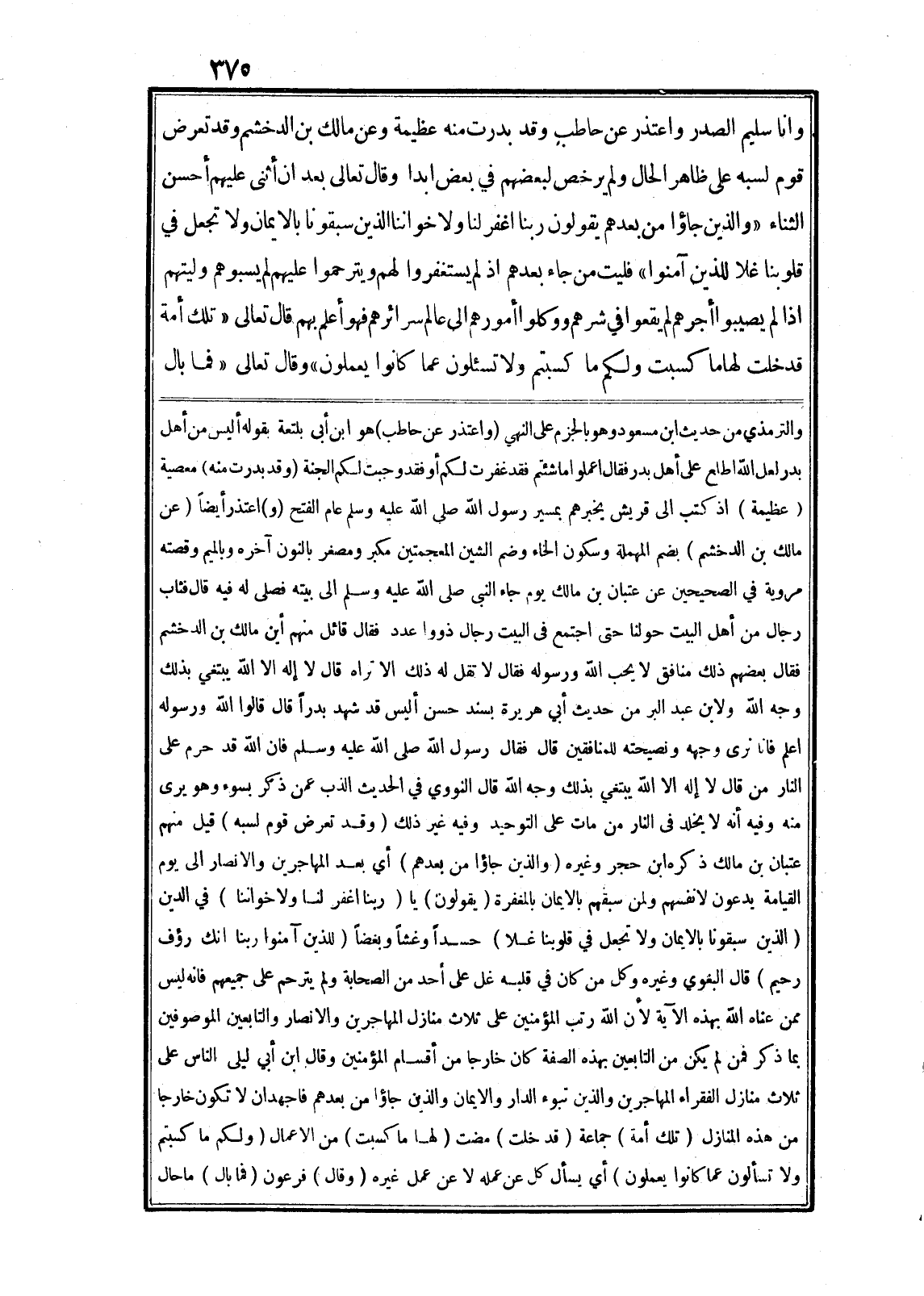 وانا سليم الصدر واعتذر عن حاطب وقد بدرت منه عظيمة وعن مالك بن الدخشم وقد تعرض قوم لسبه على ظاهر الحال ولم يرخص لبعضهم في بعض ابدا وقال تعالى بعد ان أثنى عليهم أحسن الثناء «وَالَّذِينَ جاؤُ مِنْ بَعْدِهِمْ يَقُولُونَ رَبَّنَا اغْفِرْ لَنا وَلِإِخْوانِنَا الَّذِينَ سَبَقُونا بِالْإِيمانِ وَلا تَجْعَلْ فِي قُلُوبِنا غِلًّا لِلَّذِينَ آمَنُوا» فليت من جاء بعدهم اذ لم يستغفروا لهم ويترحموا عليهم لم يسبوهم وليتهم اذا لم يصيبوا أجرهم لم يقعوا في شرهم ووكلوا أمورهم الى عام سرائرهم فهو أعلم بهم قال تعالى «تِلْكَ أُمَّةٌ قَدْ خَلَتْ لَها ما كَسَبَتْ وَلَكُمْ ما كَسَبْتُمْ وَلا تُسْئَلُونَ عَمَّا كانُوا يَعْمَلُونَ» وقال تعالى «فَما بالُ