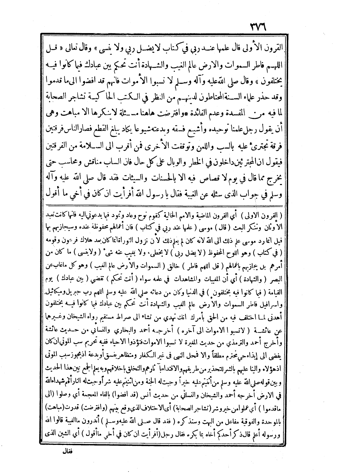 الْقُرُونِ الْأُولى قالَ عِلْمُها عِنْدَ رَبِّي فِي كِتابٍ لا يَضِلُّ رَبِّي وَلا يَنْسى» وقال تعالى «قُلِ اللَّهُمَّ فاطِرَ السَّماواتِ وَالْأَرْضِ عالِمَ الْغَيْبِ وَالشَّهادَةِ أَنْتَ تَحْكُمُ بَيْنَ عِبادِكَ فِي ما كانُوا فِيهِ يَخْتَلِفُونَ» وقال صلى الله عليه وآله وسلم لا تسبوا الأموات فانهم قد افضوا الى ما قدموا وقد حذر علماء السنة المحتاطون لدينهم من النظر في الكتب الحاكية تشاجر الصحابة لما فيه من المفسدة وعدم الفائدة* وافترضت هاهنا مسئلة لا ينكرها الا مباهت وهى أن يقول رجل علمنا توحيده وأشيع فسقه وبدعته شيوعا يكاد يبلغ القطع فصار الناس فرقتين فرقة تجترئ عليه بالسب واللعن وتوقفت الأخرى فمن أقرب الى السلامة من الفرقتين فيقول ان المجترئين داخلون في الخطر والوبال على كل حال فان الساب مناقش ومحاسب حتى يخرج مما قال في يوم لا قصاص فيه الا بالحسنات والسيئات فقد قال صلى الله عليه وآله وسلم في جواب الذى سئله عن الغيبة فقال يا رسول الله أفرأيت ان كان في أخي ما أقول (الْقُرُونِ الْأُولى) أي القرون الماضية والامم الخالية كقوم نوح وعاد وثمود فيما يدعوني اليه فانها كانت تعبد الأوثان وتنكر البعث (قالَ) موسى (عِلْمُها عِنْدَ رَبِّي فِي كِتابٍ) فان أعمالهم محفوظة عنده وسيجازيهم بها قيل انما رد موسى علم ذلك الى الله لانه كان لم يعلم ذلك لأن نزول التوراة انما كان بعد هلاك فرعون وقومه (فِي كِتابٍ) وهو اللوح المحفوظ (لا يَضِلُّ رَبِّي) لا يخطئ ولا يغيب عنه شئ (وَلا يَنْسى) ما كان من أمرهم بل يجازيهم باعمالهم (قُلِ اللَّهُمَّ فاطِرَ) خالق (السَّماواتِ وَالْأَرْضِ عالِمَ الْغَيْبِ) وهو كل ما غاب عن البصر (وَالشَّهادَةِ) أي أن المغيبات والمشاهدات في علمه سواء (أَنْتَ تَحْكُمُ) تقضي (بَيْنَ عِبادِكَ) يوم القيامة (فِي ما كانُوا فِيهِ يَخْتَلِفُونَ) في الدنيا وكان من دعائه صلى الله عليه وسلم اللهم رب جبريل وميكائيل واسرافيل فاطر السموات والأرض عالم الغيب والشهادة أنت تحكم بين عبادك فيما كانوا فيه يختلفون أهدنى لما اختلف فيه من الحق بأمرك انك تهدي من تشاء الى صراط مستقيم رواه الشيخان وغيرهما عن عائشة (لا تسبوا الاموات الى آخره) أخرجه أحمد والبخاري والنسائي من حديث عائشة وأخرج أحمد والترمذي من حديث المغيرة لا تسبوا الاموات فتؤذوا الاحياء ففيه تحريم سب الموتي ان كان يفضى الى إيذاء حي مخترم مطلقا والا فمحل النهى في غير الكفار ومتظاهر بفسق أو بدعة اذ يجوز سبب الموتى اذ هؤلاء والينا عليهم بالشر للتحذير من طريقهم والاقتداء بآثارهم والتخلق باخلاقهم وبه يعلم الجمع بين هذا الحديث وبين قوله صلى الله عليه وسلم من أثنيتم عليه خيرا وجبت له الجنة ومن اثنيتم عليه شرا وجبت له النار أئتم شهداء الله في الارض أخرجه أحمد والشيخان والنسائي من حديث أنس (قد افضوا) بالفاء المعجمة أي وصلوا (الى ما قدموا) أي عملوا من خير وشر (تشاجر الصحابة) أى الاختلاف الذى وقع بينهم (وافترضت) قدرت (مباهت) بالموحدة والفوقية مفاعل من البهت وسنذكره (فقد قال صلى الله عليه وسلم) أتدرون ما الغيبة قالوا الله ورسوله أعلم قال ذكر أحدكم أخاه بما يكره فقال رجل (أفرأيت ان كان في أخي ما أقول) أي الشين الذى