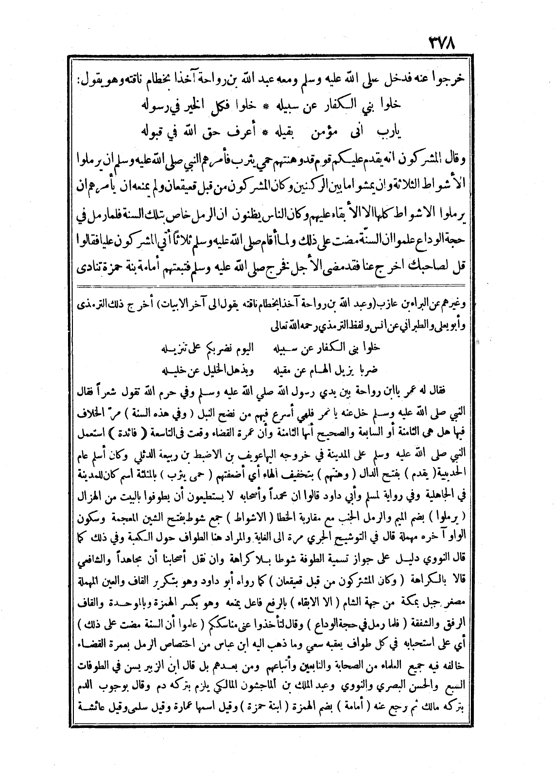 فقال له عمر يا ابن رواحة بين يدي رسول الله صلى الله عليه وسلم وفي حرم الله تقول شعرا فقال النبي صلى الله عليه وسلم خل عنه يا عمر فلهي أسرع فيهم من نضح النبل (وفي هذه السنة) مرّ الخلاف فيها هل هى الثامنة أو السابعة والصحيح أنها الثامنة وأن عمرة القضاء وقعت في التاسعة (فائدة) استعمل النبي صلى الله عليه وسلم على المدينة في خروجه اليها عويف بن الاضبط بن ربيعة الدئلي وكان أسلم عام الحديبية (يقدم) بفتح الدال (وهنتهم) بتخفيف الهاء أي أضعفتهم (حمى يثرب) بالمثلثة اسم كان للمدينة في الجاهلية وفي رواية لمسلم وأبي داود قالوا ان محمدا وأصحابه لا يستطيعون أن يطوفوا بالبيت من الهزال (يرملوا) بضم الميم والرمل الجنب مع مقاربة الخطا (الاشواط) جمع شوط بفتح الشين المعجمة وسكون الواو آخره مهملة قال في التوشيح الجري مرة الى الغاية والمراد هنا الطواف حول الكعبة وفي ذلك كما قال النووي دليل على جواز تسمية الطوفة شوطا بلا كراهة وان نقل أصحابنا أن مجاهدا والشافعي قالا بالكراهة (وكان المشركون من قبل قعيقعان) كما رواه أبو داود وهو بتكرير القاف والعين المهملة مصغر جبل بمكة من جهة الشام (الا الابقاء) بالرفع فاعل يمنعه وهو بكسر الهمزة وبالموحدة والقاف الرفق والشفقة (فلما رمل في حجة الوداع) وقال لتأخذوا عنى مناسككم (علموا أن السنة مضت على ذلك) أي على استحبابه في كل طواف يعقبه سعي وما ذهب اليه ابن عباس من اختصاص الرمل بعمرة القضاء خالفه فيه جميع العلماء من الصحابة والتابعين وأتباعهم ومن بعدهم بل قال ابن الزبير يسن في الطوفات السبع والحسن البصري والنووي وعبد الملك بن الماجشون المالكي يلزم بتركه دم وقال بوجوب الدم بتركه مالك ثم رجع عنه (أمامة) بضم الهمزة (ابنة حمزة) وقيل اسمها عمارة وقيل سلمى وقيل عائشة