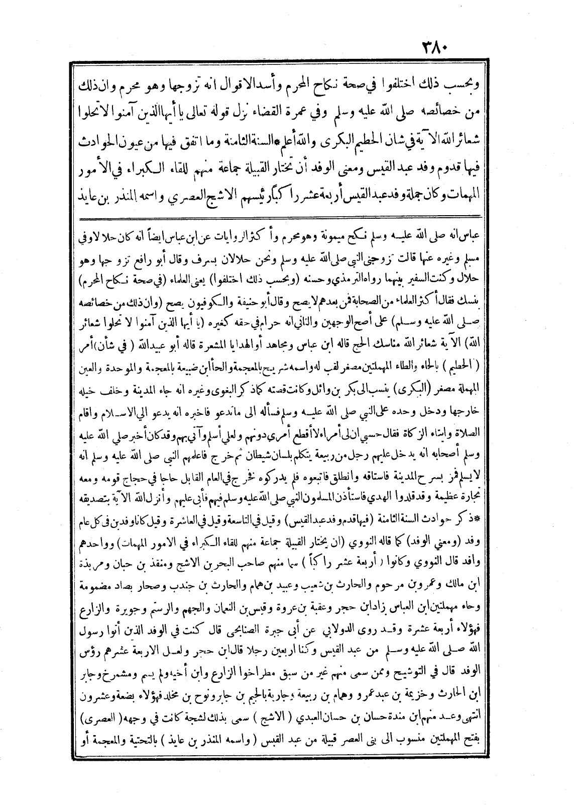 السنة الثامنة وما اتفق فيها من عيون الحوادث فيها قدوم وفد عبد القيس ومعنى الوفد أن تختار القبيلة جماعة منهم للقاء الكبراء في الأمور المهمات وكان جملة وفد عبد القيس أربعة عشر راكبا رئيسهم الاشج العصري واسمه المنذر بن عايذ عباس انه صلى الله عليه وسلم نكح ميمونة وهو محرم وأكثر الروايات عن ابن عباس ايضا انه كان حلالا وفي مسلم وغيره عنها قالت تزوجني النبى صلى الله عليه وسلم ونحن حلالان بسرف وقال أبو رافع تزوجها وهو حلال وكنت السفير بينهما رواه الترمذي وحسنه (وبحسب ذلك اختلفوا) يعنى العلماء (في صحة نكاح المحرم) بنسك فقال أكثر العلماء من الصحابة فمن بعدهم لا يصح وقال أبو حنيفة والكوفيون يصح (وان ذلك من خصائصه صلى الله عليه وسلم) على أصح الوجهين والثاني انه حرام في حقه كغيره (يا أَيُّهَا الَّذِينَ آمَنُوا لا تُحِلُّوا شَعائِرَ اللَّهِ) الآية شعائر الله مناسك الحج قاله ابن عباس ومجاهد أو الهدايا المشعرة قاله أبو عبيد الله (في شأن) أمر (الحطيم) بالحاء والطاء المهملتين مصغر لقب له واسمه شريح بالمعجمة والحأ ابن ضبيعة بالمعجمة والموحدة والعين المهملة مصغر (البكرى) ينسب الى بكر بن وائل وكانت قصته كما ذكر البغوى وغيره انه جاء المدينة وخلف خيله خارجها ودخل وحده على النبي صلى الله عليه وسلم فسأله الى ما تدعو فاخبره انه يدعو الي الاسلام واقام الصلاة وايتاء الزكاة فقال حسبي ان لى أمراء لا أقطع أمري دونهم ولعلي أسلم وآتي بهم وقد كان أخبر صلى الله عليه وسلم أصحابه انه يدخل عليهم رجل من ربيعة يتكلم بلسان شيطان ثم خرج فاعلمهم النبى صلى الله عليه وسلم انه لا يسلم فمر بسرح المدينة فاستاقه وانطلق فاتبعوه فلم يدركوه فخرج في العام القابل حاجا في حجاج قومه ومعه تجارة عظيمة وقد قلدوا الهدي فاستأذن المسلمون النبي صلى الله عليه وسلم فيهم فأبى عليهم وأنزل الله الآية بتصديقه* ذكر حوادث السنة الثامنة (فيها قدم وفد عبد القيس) وقيل في التاسعة وقيل في العاشرة وقيل كانا وفدين في كل عام وفد (ومعنى الوفد) كما قاله النووي (ان يختار القبيلة جماعة منهم للقاء الكبراء في الامور المهمات) وواحدهم وافد قال النووي وكانوا (أربعة عشر راكبا) سما منهم صاحب البحرين الاشج ومنقذ بن حبان ومربذة ابن مالك وعمرو بن مرحوم والحارث بن شعيب وعبيد بن همام والحارث بن جندب وصحار بصاد مضمومة وحاء مهملتين ابن العباس زاد ابن حجر وعقبة بن عروة وقيس بن النعمان والجهم والرستم وجويرة والزارع فهؤلاء أربعة عشرة وقد روى الدولابي عن أبى جبرة الصنابحى قال كنت في الوفد الذين أتوا رسول الله صلى الله عليه وسلم من عبد القيس وكنا اربعين رجلا قال ابن حجر ولعل الاربعة عشر هم رؤوس الوفد قال في التوشيح وممن سمى منهم غير من سبق مطر اخوا الزارع وابن أخيه ولم يسم ومشمرخ وجابر ابن الحارث وخزيمة بن عبد عمرو وهمام بن ربيعة وجارية بالجيم بن جابر ونوح بن مخلد فهؤلاء بضعة وعشرون انتهى وعد منهم ابن مندة حسان بن حسان العبدي (الاشج) سمى بذلك لشجة كانت في وجهه (العصرى) بفتح المهملتين منسوب الى بنى العصر قبيلة من عبد القبس (واسمه المنذر بن عايذ) بالتحتية والمعجمة أو