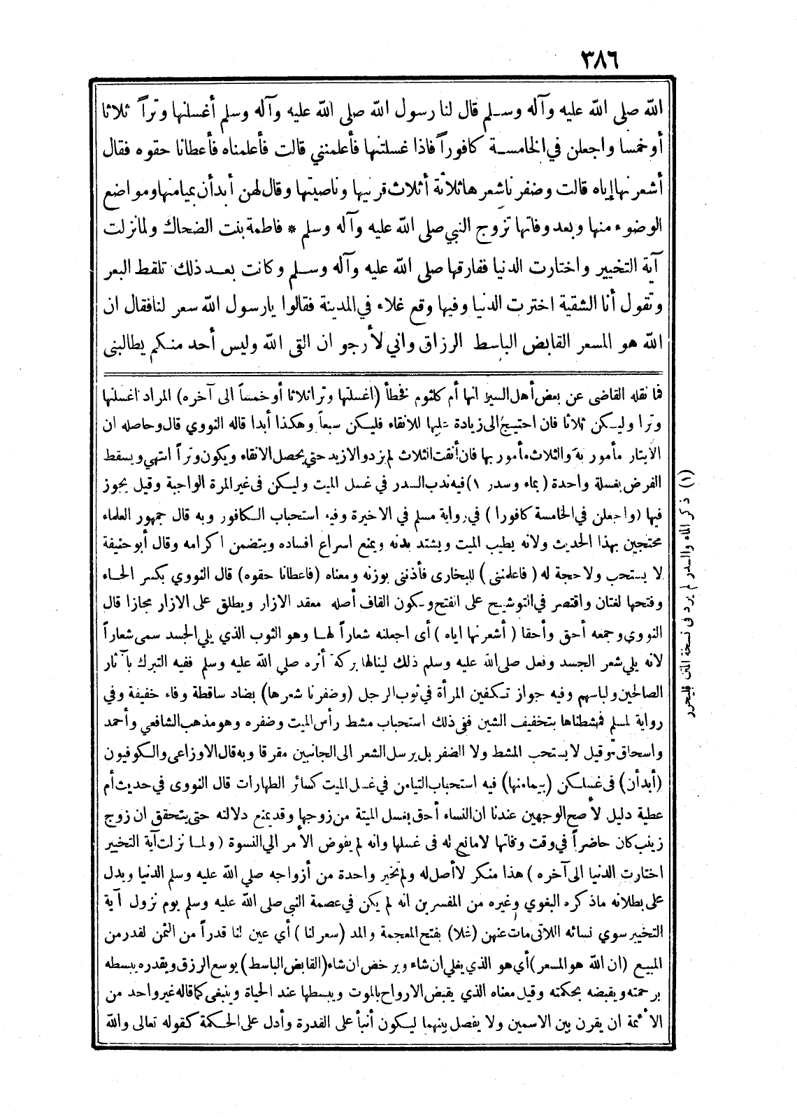 الله صلى الله عليه وآله وسلم قال لنا رسول الله صلى الله عليه وآله وسلم أغسلنها وترا ثلاثا أو خمسا واجعلن في الخامسة كافورا فاذا غسلتها فأعلمنني قالت فأعلمناه فأعطانا حقوه فقال أشعرنها إياه قالت وضفرنا شعرها ثلاثة أثلاث قرنيها وناصيتها وقال لهن أبدأن بميامنها ومواضع الوضوء منها وبعد وفاتها تزوج النبي صلى الله عليه وآله وسلم* فاطمة بنت الضحاك ولما نزلت آية التخيير واختارت الدنيا ففارقها صلى الله عليه وآله وسلم وكانت بعد ذلك تلقط البعر وتقول أنا الشقية اخترت الدنيا وفيها وقع غلاء في المدينة فقالوا يا رسول الله سعر لنا فقال ان الله هو المسعر القابض الباسط الرزاق واني لأرجو ان القى الله وليس أحد منكم يطالبنى فما نقله القاضى عن بعض أهل السير انها أم كلثوم فخطأ (اغسلتها وترا ثلاثا أو خمسا الى آخره) المراد اغسلنها وترا وليكن ثلاثا فان احتيج الى زيادة عليها للانقاء فليكن سبعا وهكذا أبدا قاله النووي قال وحاصله ان الايتار مأمور به والثلاث مأمور بها فان أنقت الثلاث لم يزد والازيد حتي يحصل الانقاء ويكون وترا انتهي ويسقط الفرض بغسلة واحدة (بماء وسدر «1» ) فيه ندب السدر في غسل الميت وليكن في غير المرة الواجبة وقيل يجوز فيها (واجعلن في الخامسة كافورا) في رواية مسلم في الاخيرة وفيه استحباب الكافور وبه قال جمهور العلماء محتجين بهذا الحديث ولانه يطيب الميت ويشتد بدنه ويمنع اسراع افساده ويتضمن اكرامه وقال أبو حنيفة لا يستحب ولا حجة له (فاعلمننى) للبخارى فأذننى بوزنه ومعناه (فاعطانا حقوه) قال النووي بكسر الحاء وفتحها لغتان واقتصر في التوشيح على الفتح وسكون القاف أصله معقد الازار ويطلق على الازار مجازا قال النووي وجمعه أحق وأحقا (أشعرنها اياه) أى اجعلنه شعارا لها وهو الثوب الذي يلي الجسد سمى شعارا لانه يلي شعر الجسد وفعل صلى الله عليه وسلم ذلك لينالها بركة أثره صلى الله عليه وسلم ففيه التبرك بآثار الصالحين ولباسهم وفيه جواز تكفين المرأة في ثوب الرجل (وضفرنا شعرها) بضاد ساقطة وفاء خفيفة وفي رواية لمسلم فمشطناها بتخفيف الشين ففى ذلك استحباب مشط رأس الميت وضفره وهو مذهب الشافعي وأحمد واسحاق وقيل لا يستحب المشط ولا الضفر بل يرسل الشعر الى الجانبين مقرقا وبه قال الاوزاعى والكوفيون (أبدأن) فى غسلكن (بيمامنها) فيه استحباب التيامن في غسل الميت كسائر الطهارات قال النووى في حديث أم عطية دليل لأصح الوجهين عندنا ان النساء أحق بغسل الميتة من زوجها وقد يمنع دلالته حتى يتحقق ان زوج زينب كان حاضرا في وقت وفاتها لا مانع له في غسلها وانه لم يفوض الأمر الي النسوة (ولما نزلت آية التخيير اختارت الدنيا الى آخره) هذا منكر لا أصل له ولم تخير واحدة من أزواجه صلى الله عليه وسلم الدنيا ويدل على بطلانه ما ذكره البغوي وغيره من المفسرين انه لم يكن في عصمة النبى صلى الله عليه وسلم يوم نزول آية التخيير سوي نسائه اللاتى مات عنهن (غلا) بفتح المعجمة والمد (سعر لنا) أي عين لنا قدرا من الثمن لقدر من المبيع (ان الله هو المسعر) أي هو الذي يغلي ان شاء ويرخص؟؟؟ ان شاء (القابض الباسط) يوسع الرزق ويقدره يبسطه برحمته ويقبضه بحكمته وقيل معناه الذي يقبض الارواح بالموت ويبسطها عند الحياة وينبغى كما قاله غير واحد من الأئمة ان يقرن بين الاسمين ولا يفصل بينهما ليكون أنبأ على القدرة وأدل على الحكمة كقوله تعالى وَاللَّهُ