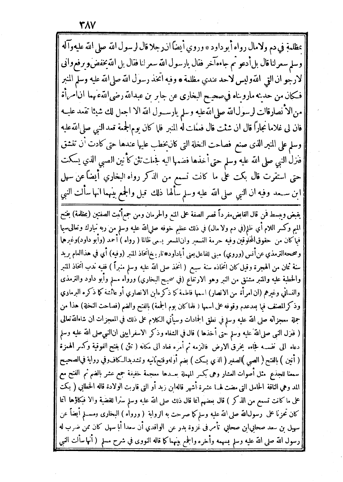 وفيه اتخذ رسول الله صلى الله عليه وسلم المنبر فكان من حديثه ما رويناه في صحيح البخارى عن جابر بن عبد الله رضى الله عنهما ان امرأة من الأنصار قالت لرسول الله صلى الله عليه وسلم يا رسول الله الا اجعل لك شيئا تقعد عليه فان لى غلاما نجارا قال ان شئت قال فعملت له المنبر فلما كان يوم الجمعة قعد النبي صلى الله عليه وسلم على المنبر الذى صنع فصاحت النخلة التى كان يخطب عليها عندها حتى كادت أن تنشق فنزل النبي صلى الله عليه وسلم حتى أخذها فضمها اليه فجعلت تئن كأنين الصبي الذي يسكت حتى استقرت قال بكت على ما كانت تسمع من الذكر رواه البخاري أيضا عن سهل ابن سعد وفيه ان النبي صلى الله عليه وسلم سألها ذلك قيل والجمع بينهما انها سألت النبي يَقْبِضُ وَيَبْصُطُ فمن قال القابض مفردا قصر الصفة على المنع والحرمان ومن جمع أثبت الصفتين (بمظلمة) بفتح الميم وكسر اللام أي ظلم (في دم ولا مال) في ذلك عظيم خوفه صلى الله عليه وسلم من ربه تبارك وتعالى سيما فيما كان من حقوق المخلوقين وفيه حرمة التسعير وان المسعر يسمى ظالما (رواه) أحمد (وأبو داود) وغيرهما وصححه الترمذي عن أنس (وروي) مبنى للفاعل يعنى أبا داود* تاريخ اتخاذ المنبر (وفيه) أي في هذا العام يريد سنة ثمان من الهجرة وقيل كان اتخاذه سنة سبع (اتخذ صلى الله عليه وسلم منبرا) ففيه ندب اتخاذ المنبر والخطبة عليه والمنبر مشتق من النبر وهو الارتفاع (في صحيح البخاري) ورواه مسلم وأبو داود والترمذى والنسائي وغيرهم (ان امرأة من الانصار) اسمها فاطمة كما ذكره ابن الانصاري أو عائشة كما ذكره البرماوي وذكر المصنف فيما بعد عدم وقوفه على اسمها (فلما كان يوم الجمعة) بالفتح والضم (فصاحت النخلة) هذا من جملة معجزاته صلى الله عليه وسلم في نطق الجمادات وسيأتي الكلام على ذلك في المعجزات ان شاء الله تعالى (فنزل النبي صلى الله عليه وسلم حتى أخذها) قال في الشفاء وذكر الاسفرايينى ان النبي صلى الله عليه وسلم دعاه الى نفسه فجاءه يخرق الارض فالتزمه ثم أمره فعاد الى مكانه (تئن) بفتح الفوقية وكسر الهمزة (أنين) بالفتح (الصبي) الصغير (الذي يسكت) بضم أوله وفتح ثانيه وتشديد الكاف وفي رواية في الصحيح سمعنا للجذع مثل أصوات العشار وهى بكسر المهملة بعدها معجمة خفيفة جمع عشر بالضم ثم الفتح مع المد وهي الناقة الحامل التى مضت لها عشرة أشهر قاله ابن زيد أو التى قاربت الولادة قاله الخطابي (بكت على ما كانت تسمع من الذكر) قال بعضهم انما قال ذلك صلى الله عليه وسلم سترا للقضية والا فبكاؤها انما كان تحزنا على رسول الله صلى الله عليه وسلم كما صرحت به الرواية (ورواه) البخارى ومسلم أيضا عن سهيل بن سعد صحابي ابن صحابي تأمر في غزوة بدر عن الواقدي أن سعدا أبا سهل كان ممن ضرب له رسول الله صلى الله عليه وسلم بسهمه وأخره والجمع بينهما كما قاله النووى في شرح مسلم (أنها سألت النبي