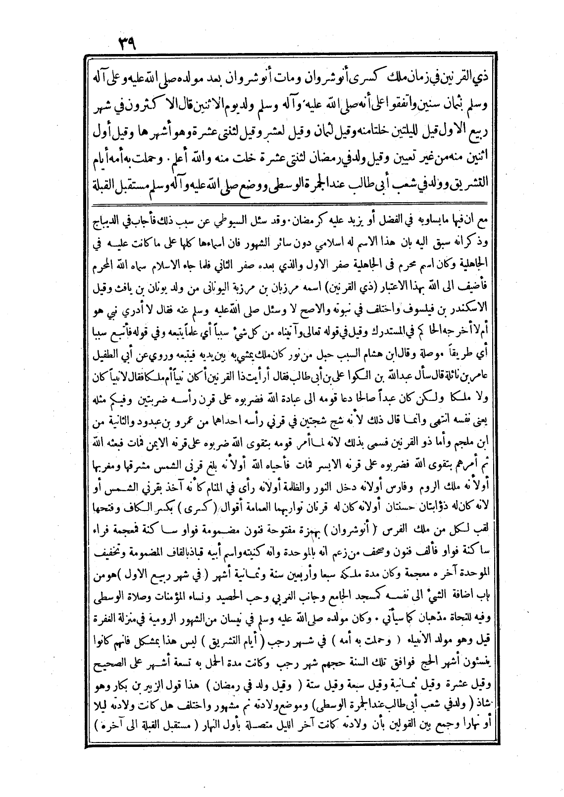 وحملت به أمه أيام التشريق وولد في شعب أبي طالب عند الجمرة الوسطى ووضع صلى الله عليه وآله وسلم مستقبل القبلة مع ان فيها ما يساويه في الفضل أو يزيد عليه كرمضان. وقد سئل السيوطي عن سبب ذلك فأجاب في الديباج وذكر انه سبق اليه بان هذا الاسم له اسلامي دون سائر الشهور فان اسماءها كلها على ما كانت عليه في الجاهلية وكان اسم محرم في الجاهلية صفر الاول والذي بعده صفر الثاني فلما جاء الاسلام سماه الله المحرم فأضيف الى الله بهذا الاعتبار (ذي القرنين) اسمه مرزبان بن مرزبة اليونانى من ولد يونان بن يافث وقيل الاسكندر بن فيلسوف واختلف في نبوته والاصح لا وسئل صلى الله عليه وسلم عنه فقال لا أدري نبي هو أم لا أخرجه الحاكم في المستدرك وقيل في قوله تعالى وَآتَيْناهُ مِنْ كُلِّ شَيْءٍ سَبَباً أي علما يتبعه وفي قوله فَأَتْبَعَ سَبَباً أي طريقا موصلة وقال ابن هشام السبب حبل من نور كان ملك يمشي به بين يديه فيتبعه وروي عن أبي الطفيل عامر بن نائلة قال سأل عبد الله بن الكوا على بن أبى طالب فقال أرأيت ذا القرنين أكان نبيا أم ملكا فقال لانبيا كان ولا ملكا ولكن كان عبدا صالحا دعا قومه الى عبادة الله فضربوه على قرن رأسه ضربتين وفيكم مثله يعنى نفسه انتهى وانما قال ذلك لأنه شج شجتين في قرني رأسه احداهما من عمرو بن عبد ود والثانية من ابن ملجم وأما ذو القرنين فسمى بذلك لانه لما أمر قومه بتقوى الله ضربوه على قرنه الايمن فمات فبعثه الله ثم أمرهم بتقوى الله فضربوه على قرنه الايسر فمات فأحياه الله أو لأنه بلغ قرنى الشمس مشرقها ومغربها أو لأنه ملك الروم وفارس أو لانه دخل النور والظلمة أو لانه رأى في المنام كأنه آخذ بقرني الشمس أو لانه كان له ذؤابتان حسنتان أو لانه كان له قرنان تواريهما العمامة أقوال (كسرى) بكسر الكاف وفتحها لقب لكل من ملك الفرس (أنو شروان) بهمزة مفتوحة فنون مضمومة فواو ساكنة فمعجمة فراء ساكنة فواو فألف فنون وصحف من زعم انه بالموحدة وانه كنيته واسم أبيه قباذ بالقاف المضمومة وتخفيف الموحدة آخره معجمة وكان مدة ملكه سبعا وأربعين سنة وثمانية أشهر (في شهر ربيع الاول) هو من باب اضافة الشيء الى نفسه كمسجد الجامع وجانب الغربي وحب الحصيد ونساء المؤمنات وصلاة الوسطى وفيه للنحاة مذهبان كما سيأتي. وكان مولده صلى الله عليه وسلم في نيسان من الشهور الرومية في منزلة الغفرة قيل وهو مولد الانبياء (وحملت به أمه) في شهر رجب (أيام التشريق) ليس هذا بمشكل فانهم كانوا ينسئون أشهر الحج فوافق تلك السنة حجهم شهر رجب وكانت مدة الحمل به تسعة أشهر على الصحيح وقيل عشرة وقيل ثمانية وقيل سبعة وقيل ستة (وقيل ولد في رمضان) هذا قول الزبير بن بكار وهو شاذ (ولد في شعب أبى طالب عند الجمرة الوسطى) وموضع ولادته ثم مشهور واختلف هل كانت ولادته ليلا أو نهارا وجمع بين القولين بأن ولادته كانت آخر الليل متصلة بأول النهار (مستقبل القبلة الى آخره)